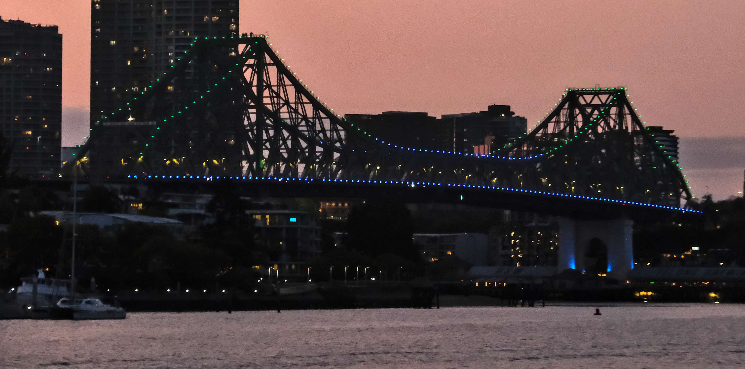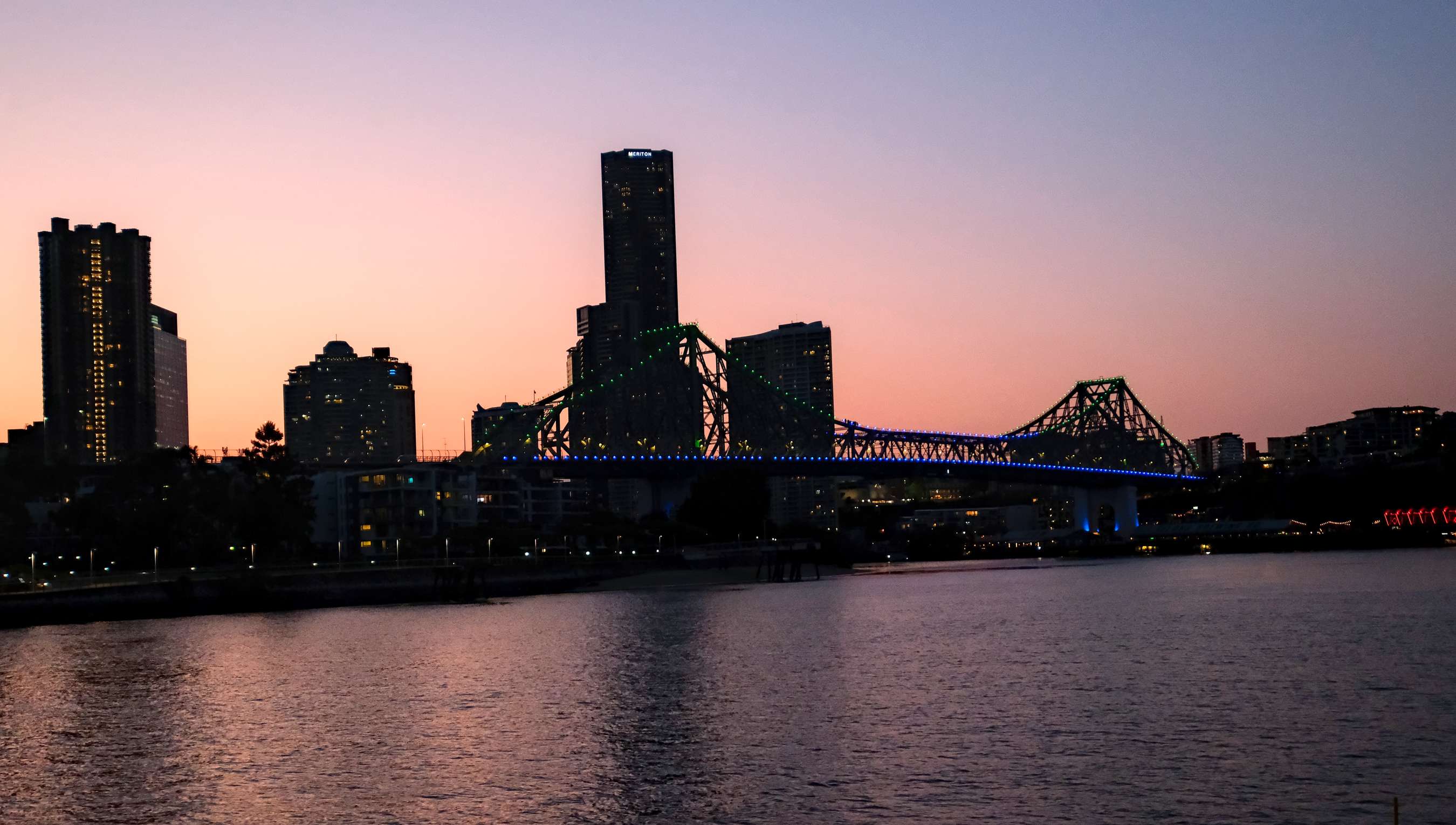 Der Tag geht zur Neige und die Stadt beginnt zu leuchten, besonders schön die 'Story Bridge' in elegantem Blau.