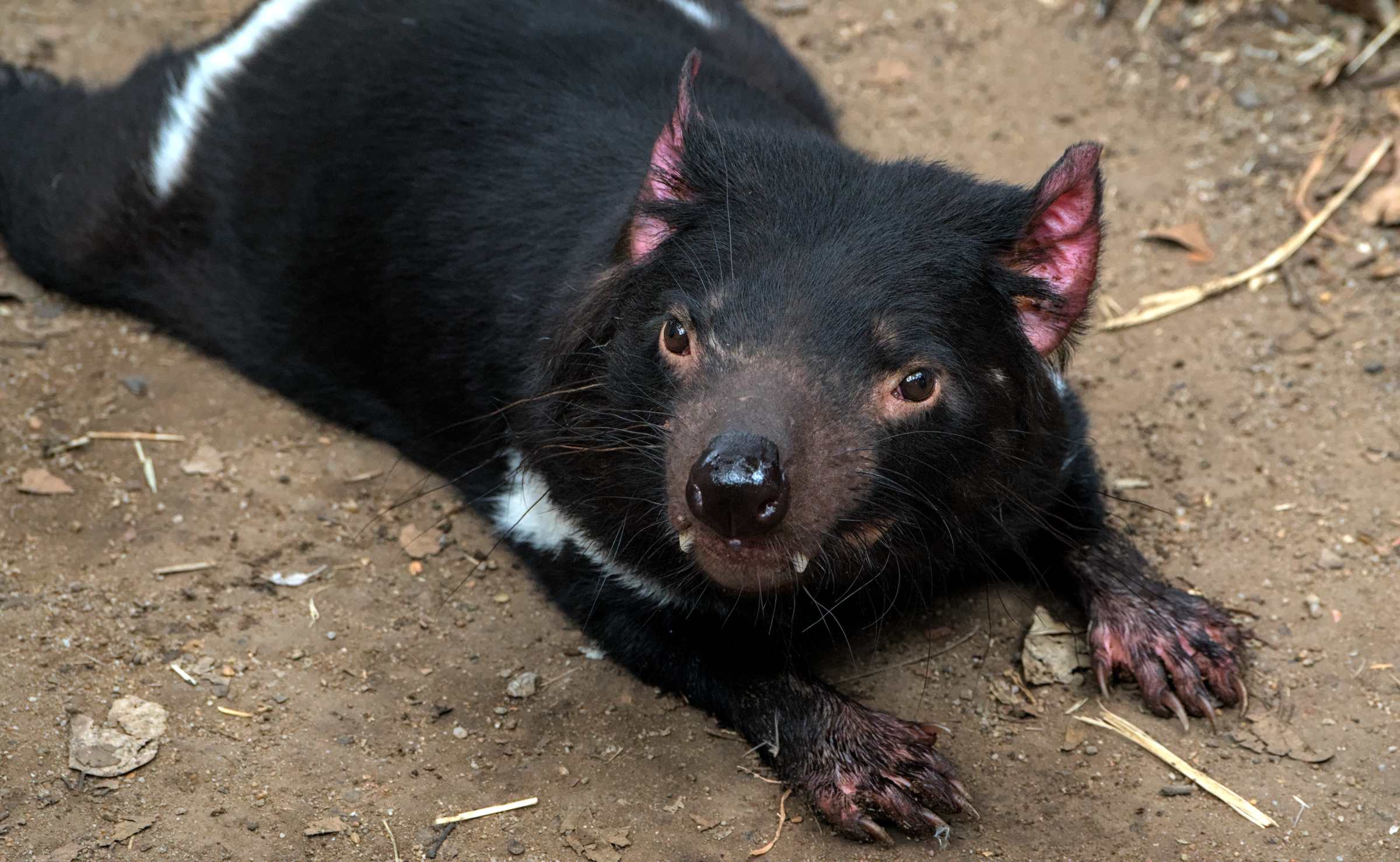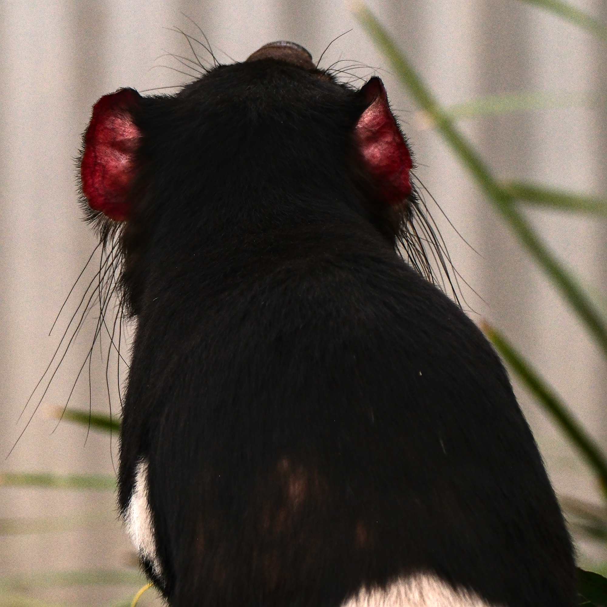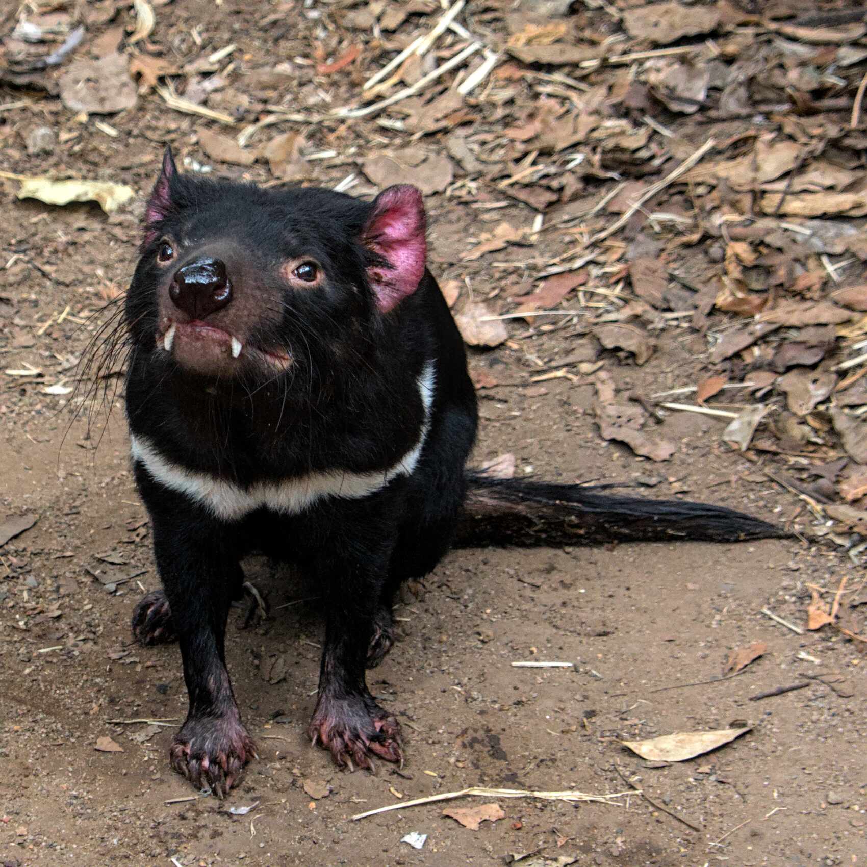 Ein Tasmanischer Teufel mit ordentlichen Fangzähnchen, einem sehr kräftigen Gebiss und, wenn er aufgeregt ist, fast leuchtend roten Öhrchen.