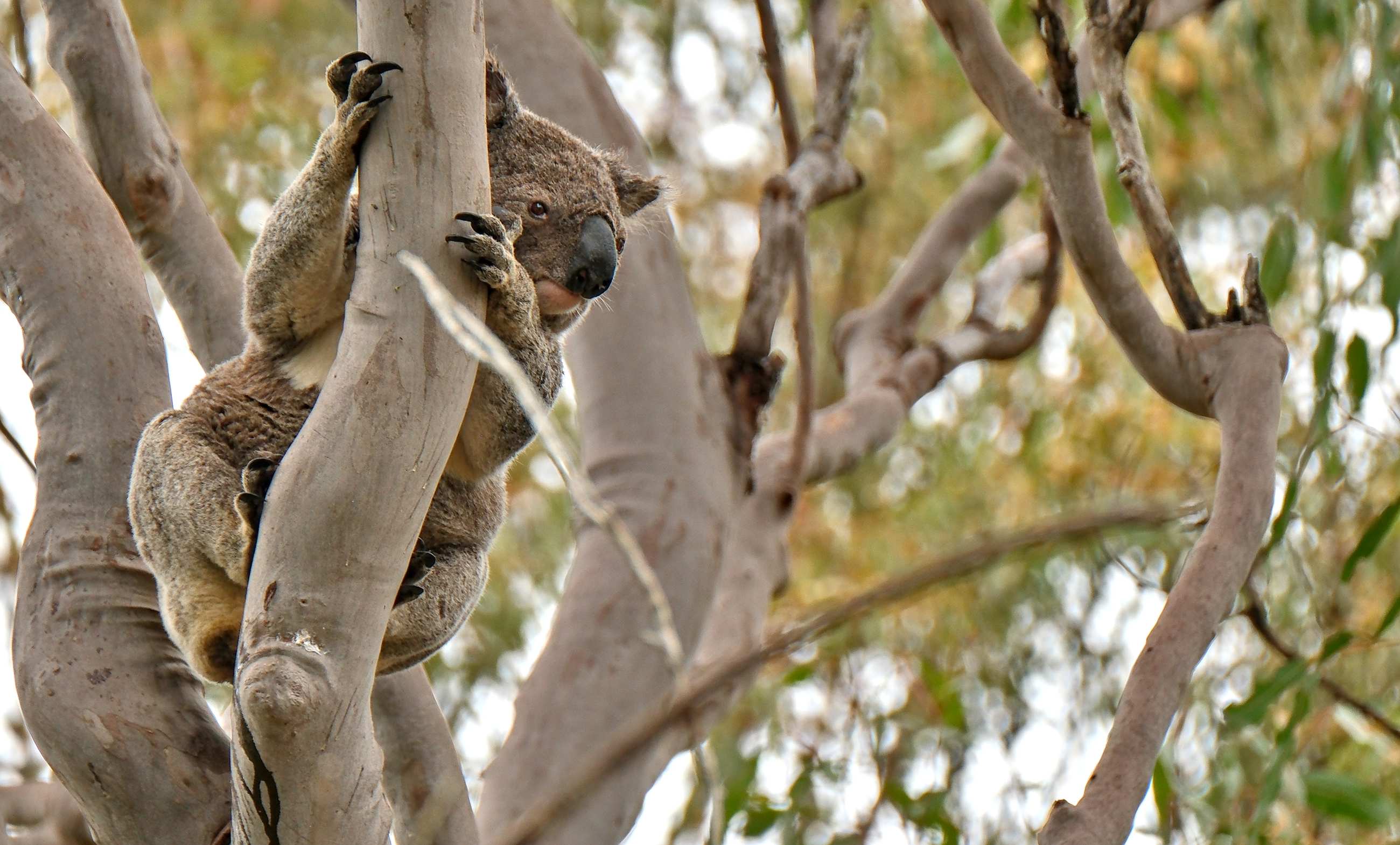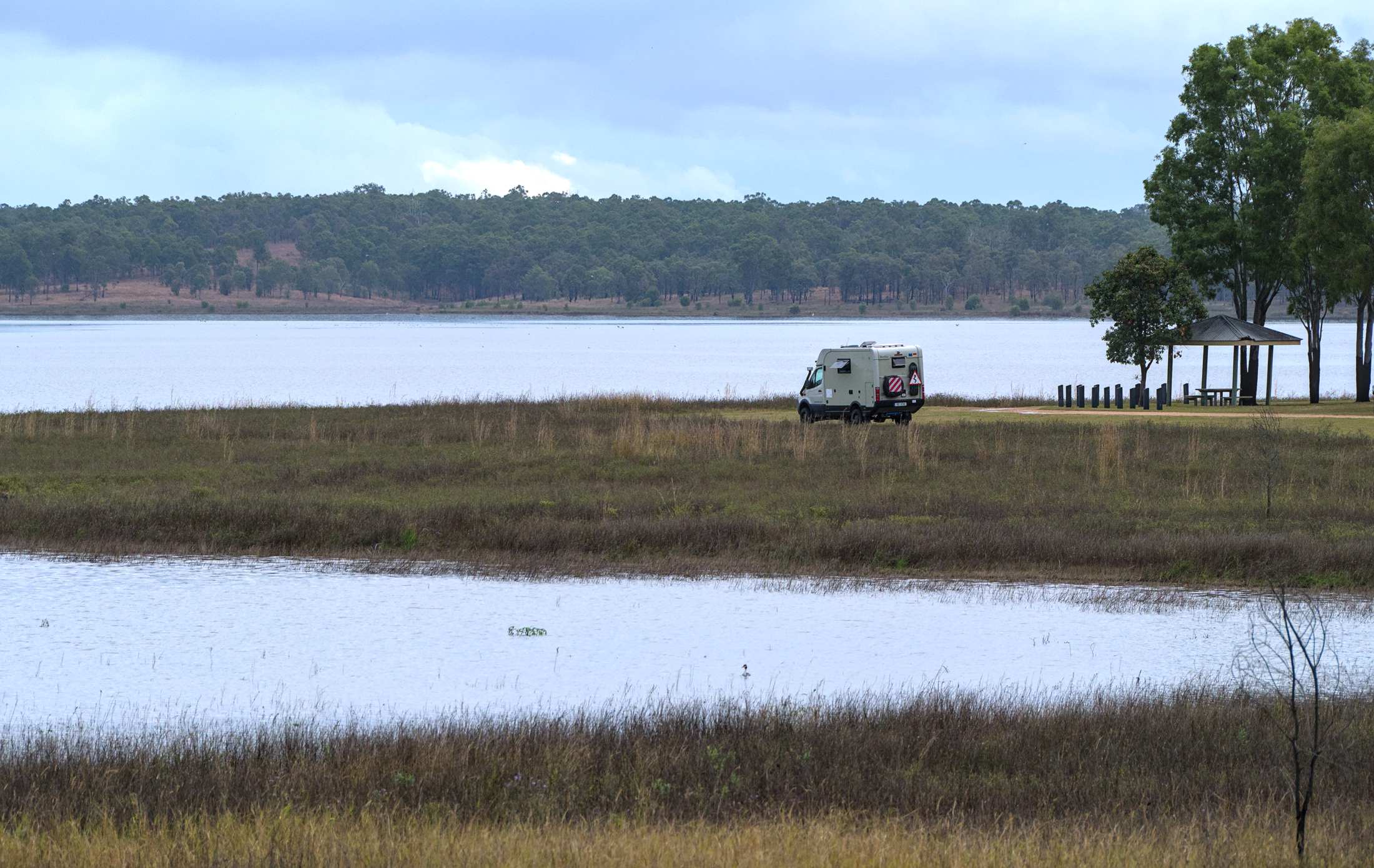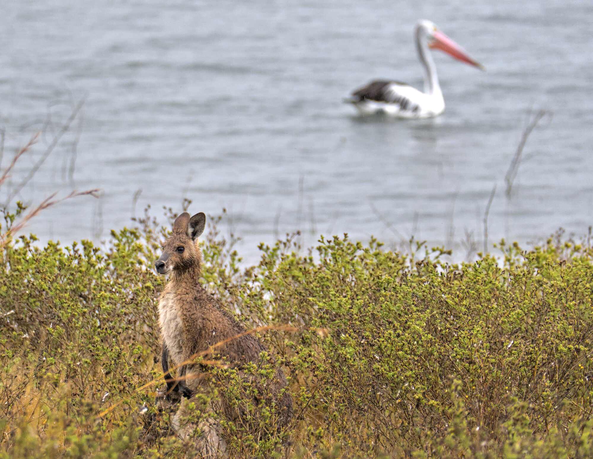 Seit vier Tagen regnet es mehr oder weniger. Wir verbringen die Tage direkt am See in einem Tageserholungspark mit Toiletten, Grills, überdachten Sitzplätzen usw., die Nächte etwa 5 km entfernt auf einem kostenlosen Stellplatz, der immerhin einen Mülleimer besitzt. Wir räumen weiter auf, werkeln an unseren Berichten, entspannen und beobachten große Brillenpelikane und natürlich Kängurus. Unseren ersten freilebenden Koala hat Ulrike gleich am ersten Tag in einem Eukalyptusbaum (wo sonst?) entdeckt.