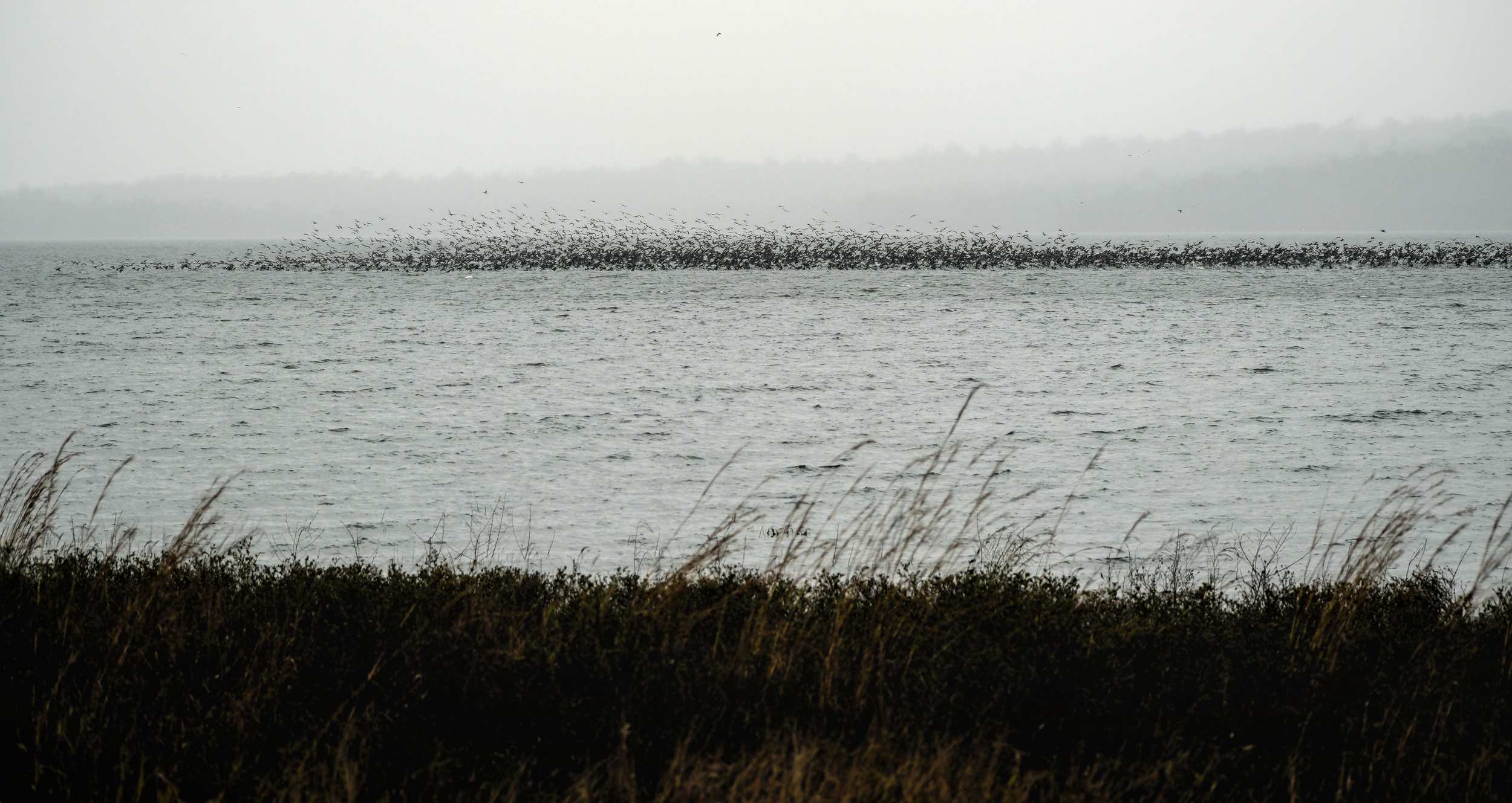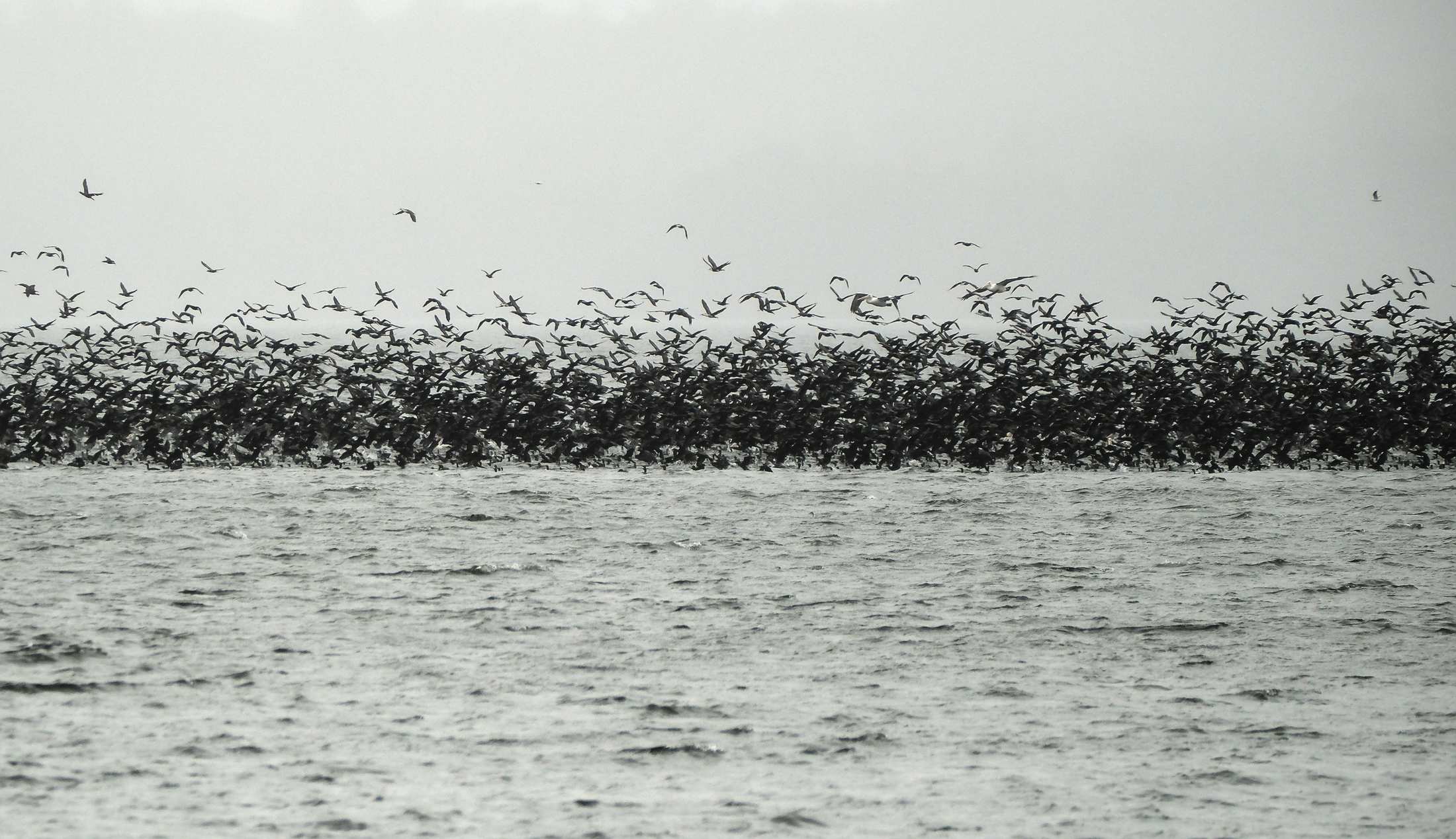 Ein riesiger Vogelschwarm, begleitet von Pelikanen, kommt vorbei.