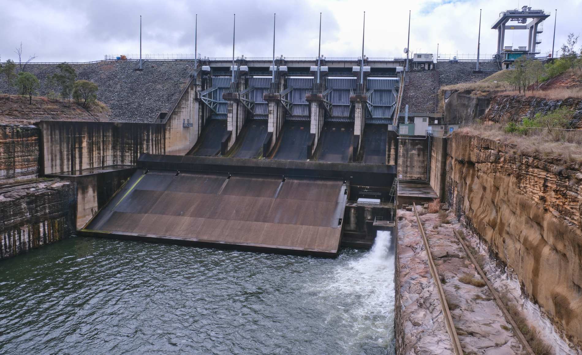 Der gewaltige Auslauf des Wivenhoedamms, der den Brisbane River zum Wivenhoe-See aufstaut. Gebaut zum Schutz nach einer Flut 1974, die Brisbane zerstörte, dient er zusätzlich als Trinkwasserreservoir und unterer Speicher eines Kraftwerksystems.