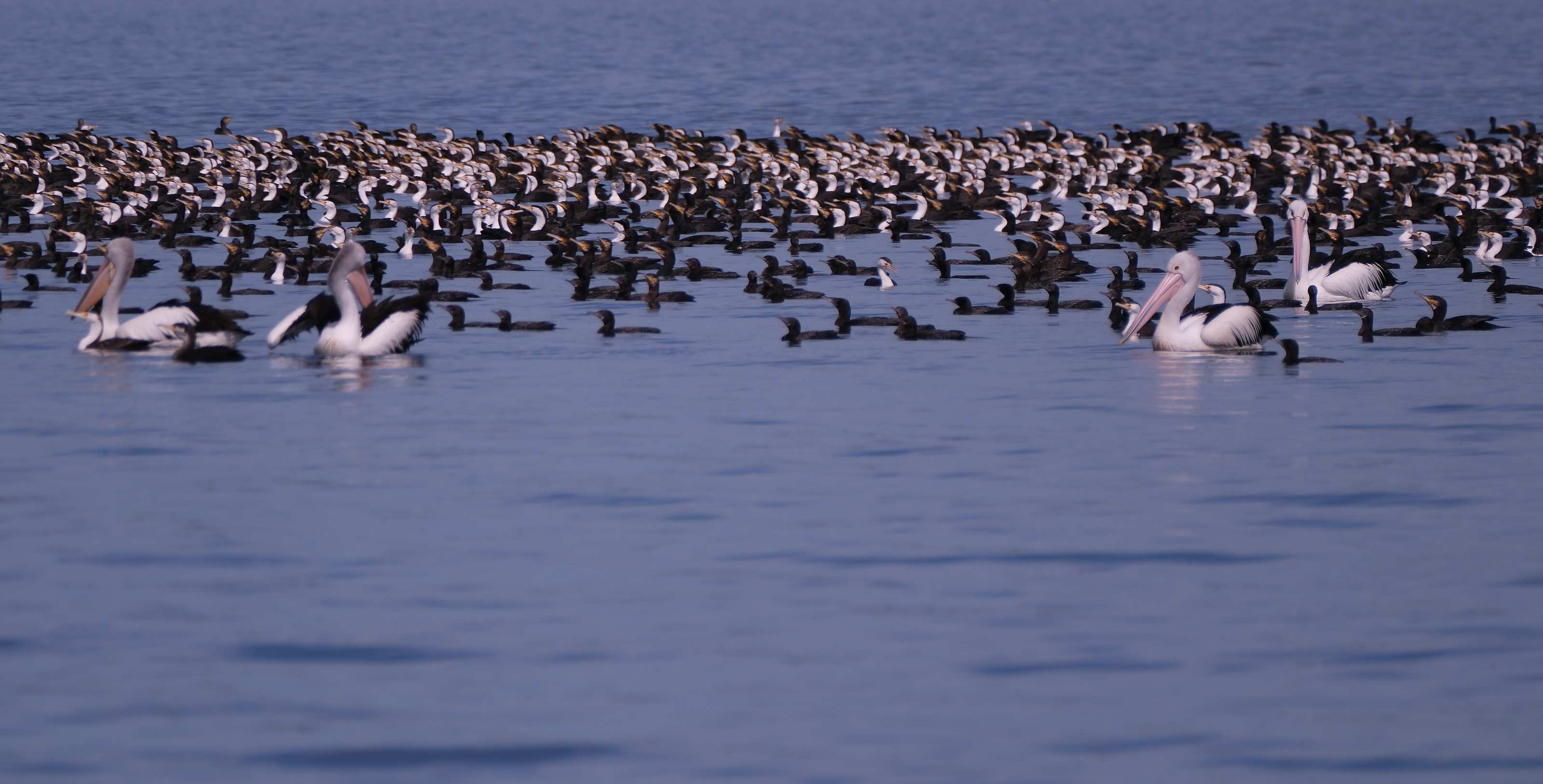 Aber dann kommt auf einmal ein wirklich riesiger Schwarm Kormorane, begleitet von Pelikanen, vorbei.