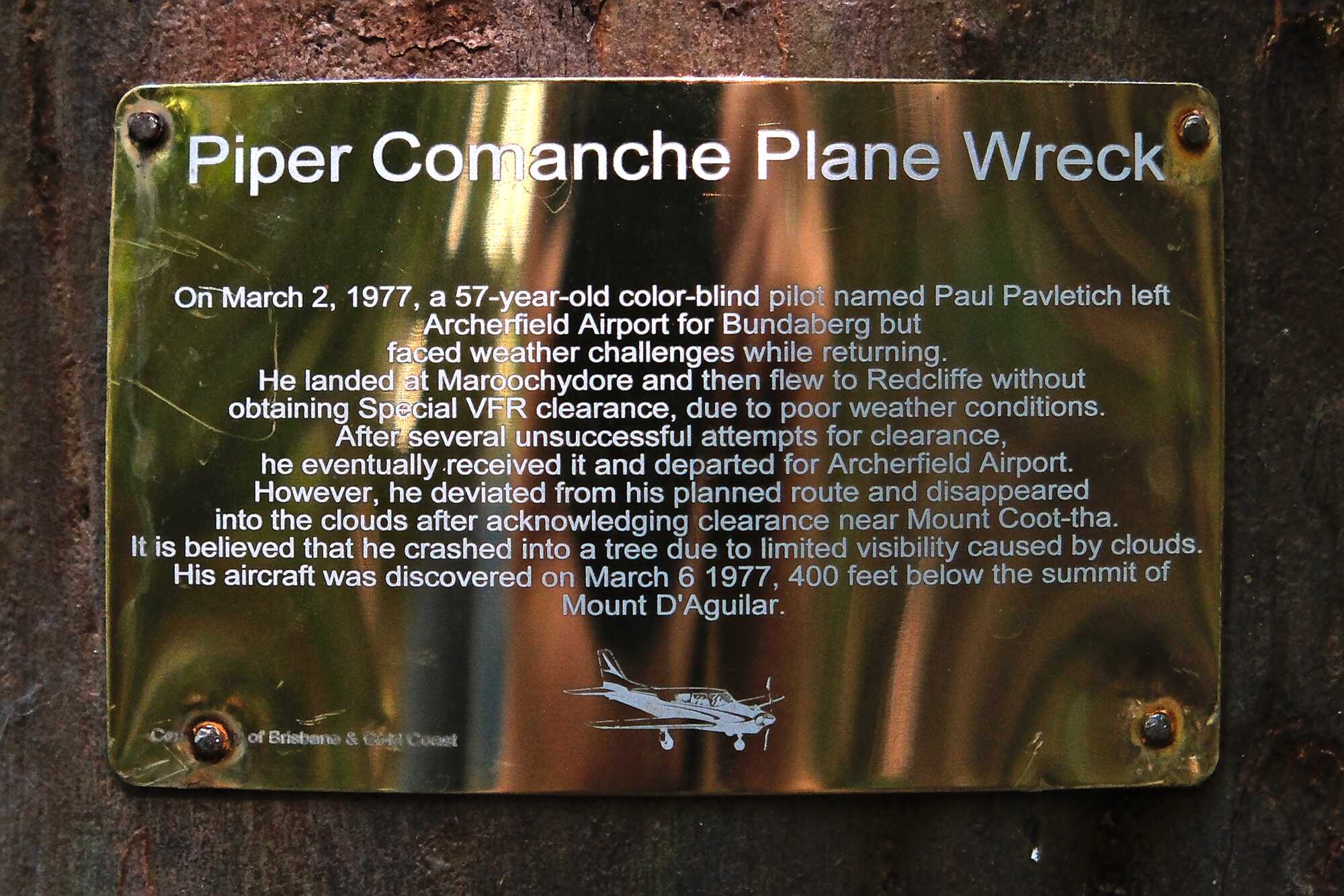 Am 2. März 1977 verließ ein 57-jähriger farbenblinder Pilot namens Paul Pavletich den Flughafen Archerfield in Richtung Bundaberg, hatte aber bei der Rückkehr mit Wetterproblemen zu kämpfen. [...] Es wird angenommen, dass er aufgrund der eingeschränkten Sicht durch Wolken gegen einen Baum prallte. Sein Flugzeug wurde am 6. März 1977 120 m unterhalb des Gipfels des Mount D'Aguilar entdeckt."