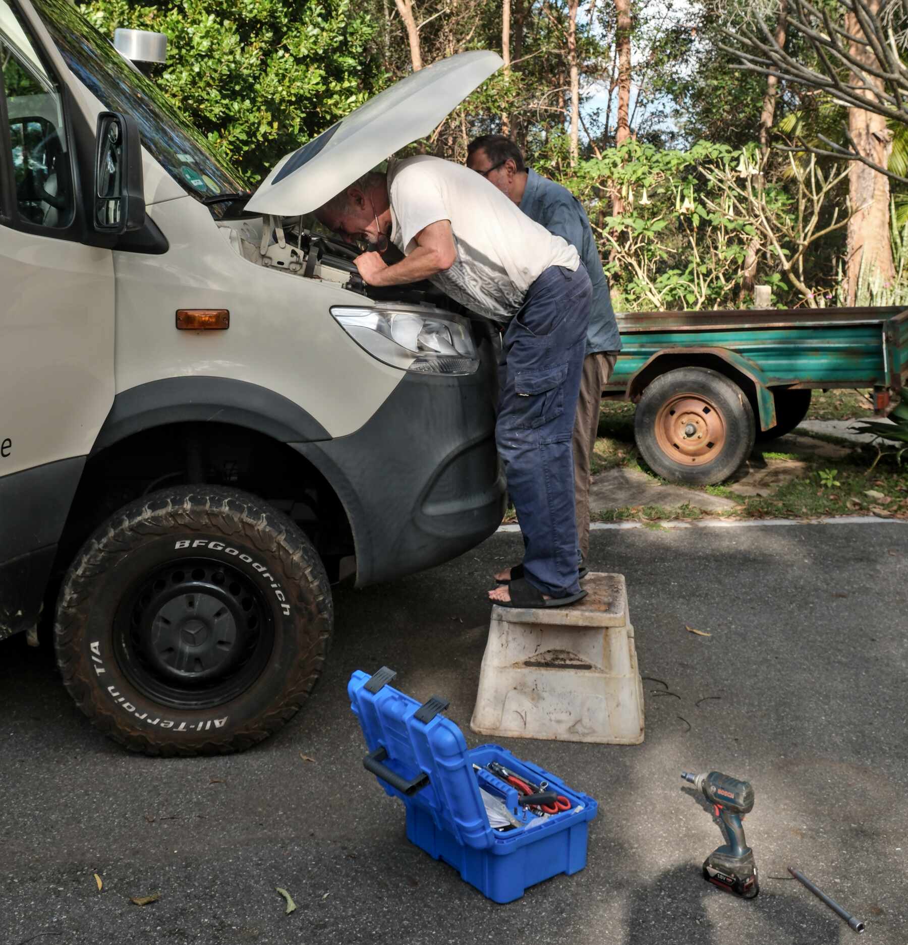 Michael baut mir die mitgebrachte Konsole im Motorraum ein, auf der unser Kompressor montiert wird. Er hat mich auch in die Stadt zum Generel Post Office gefahren um endlich unser Päckchen abzuholen.