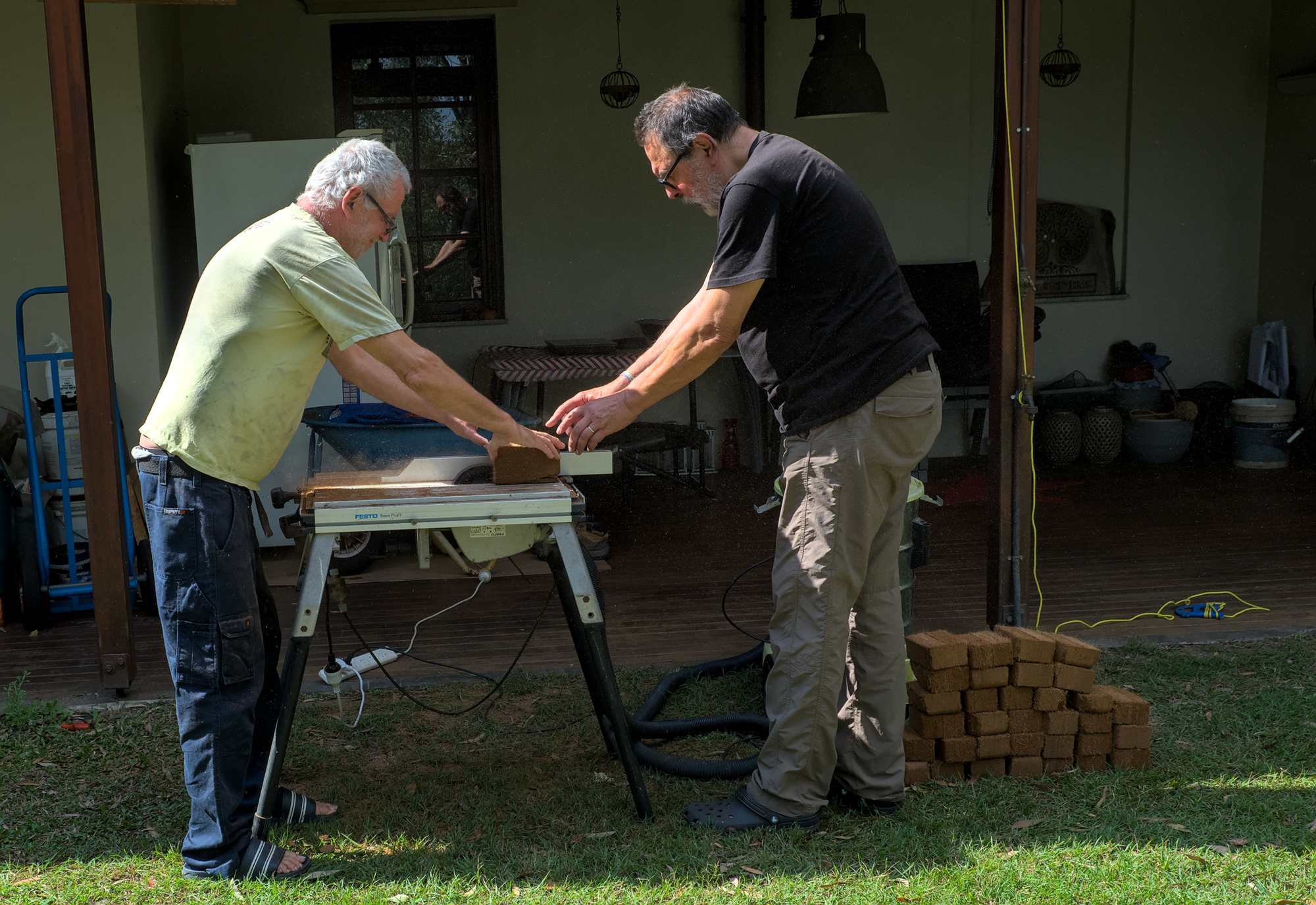 Mit der Kreissäge verwandelt Michael die großen Kokosblöcke aus dem Baumarkt in handliche Ziegel, so lassen sie sich in Bertha besser verstauen. Mit Wasser angesetzt wandern sie nach und nach in unsere Trockentrenntoilette. Jetzt haben wir wieder Vorrat für gut ein Jahr.