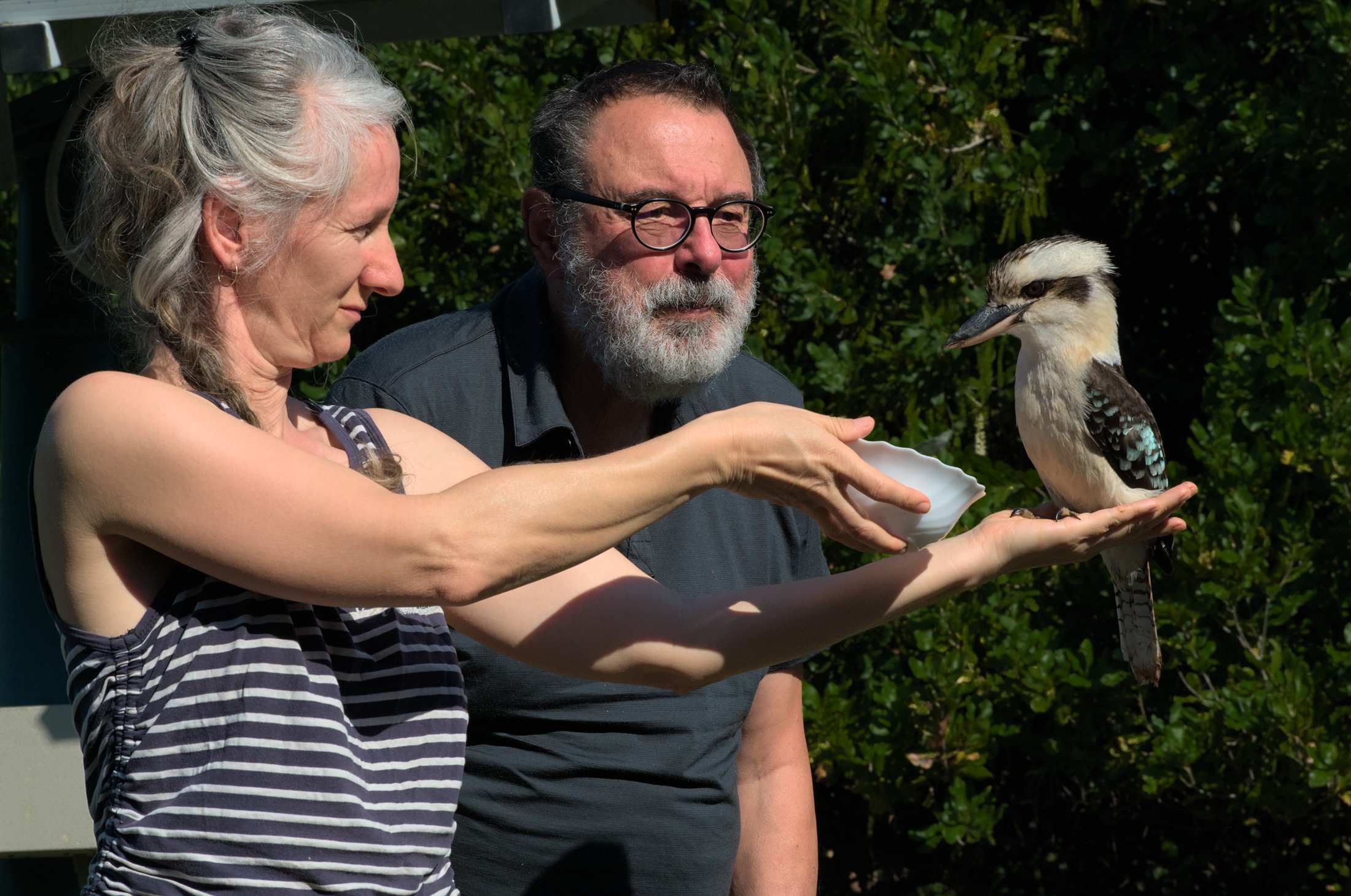Mandy hat diesen Kookaburra ("Lachender Hans") einmal aufgepäppelt. Er hat mit ihr Freundschaft geschlossen, besucht sie und lässt sich immer noch gerne von ihr füttern.