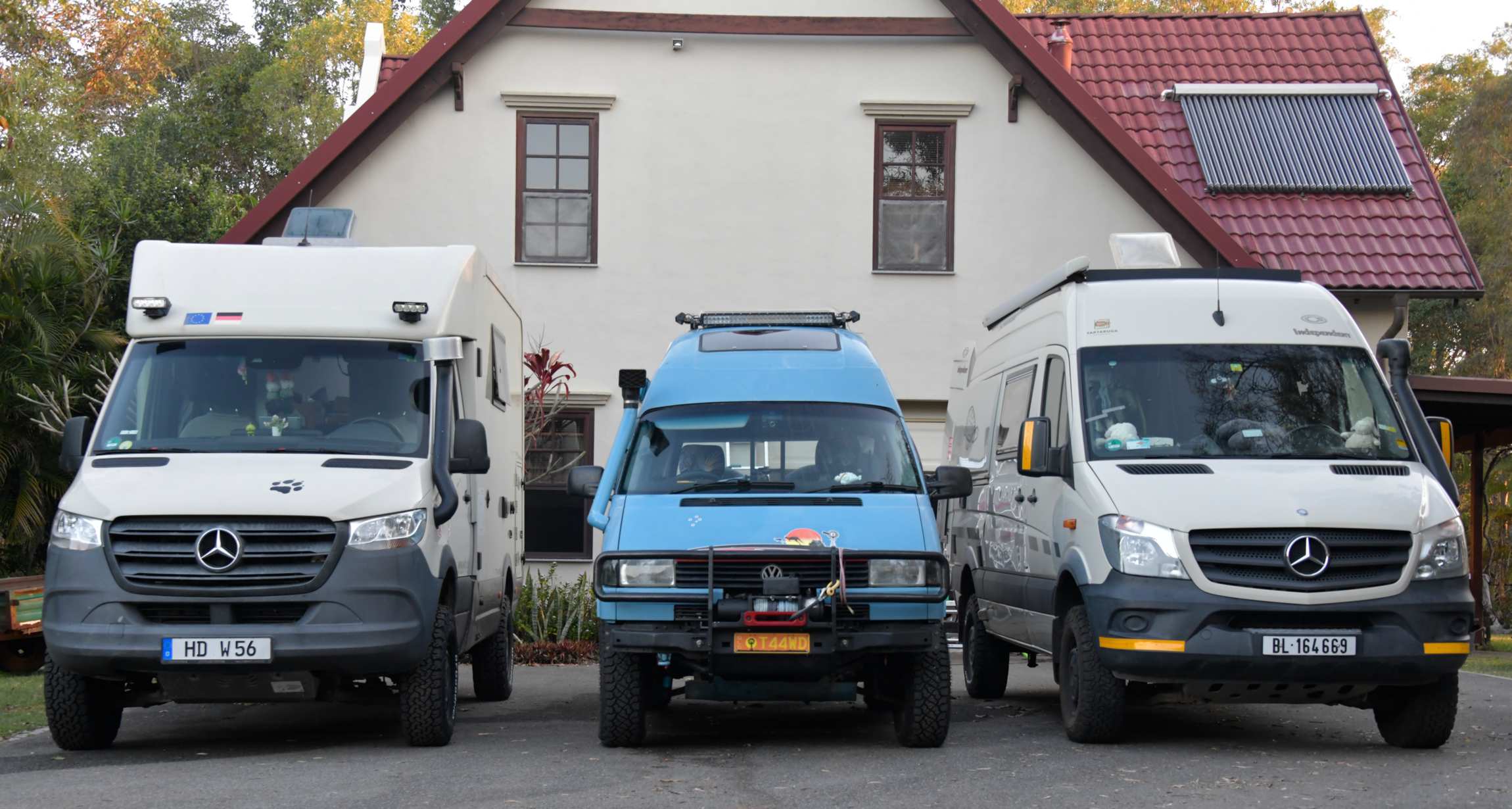 Bertha, der 30 Jahre alte VW T4 Syncro von Mandy und Michael und der CS von Conny und Kurt ohne und mit den damit Reisenden.