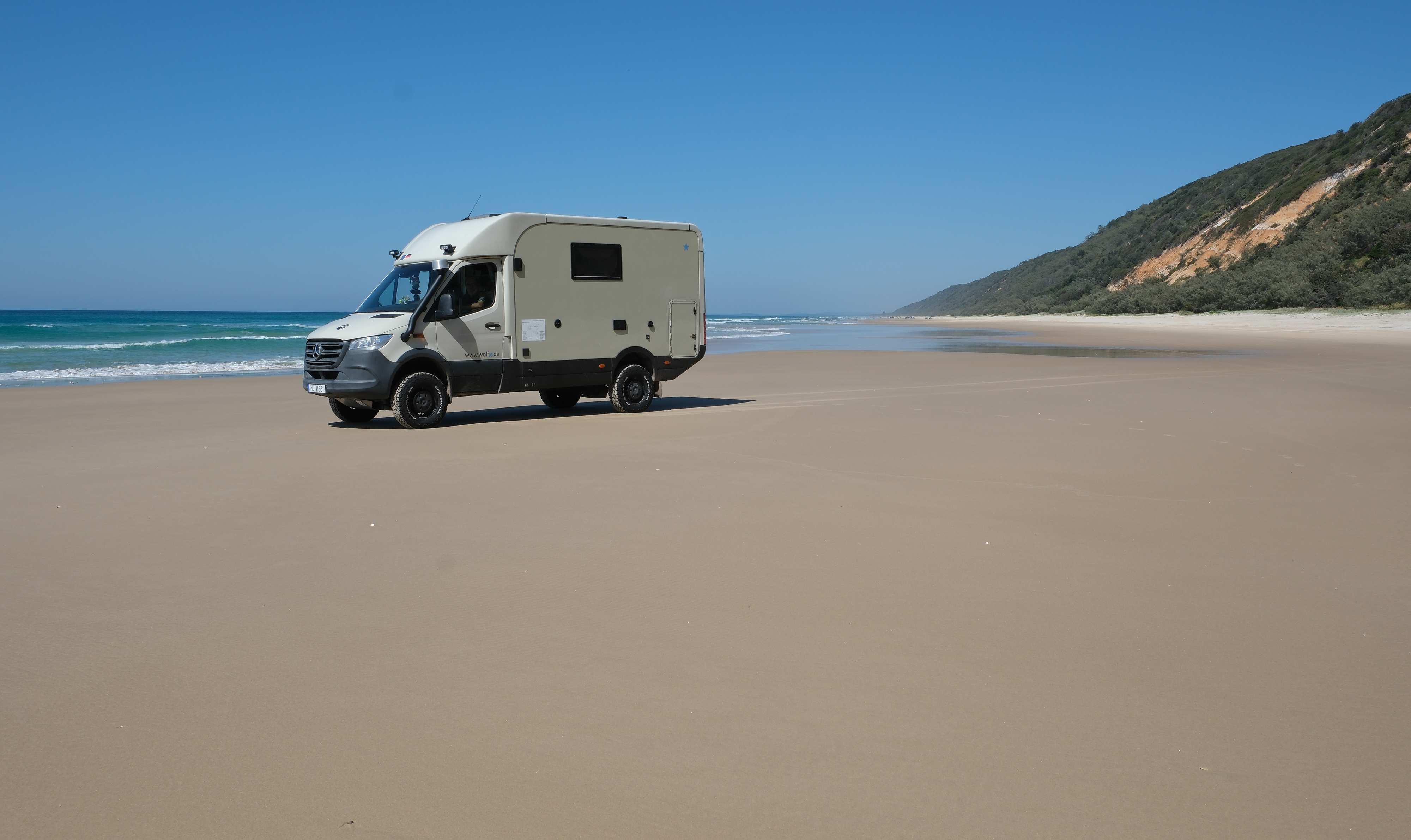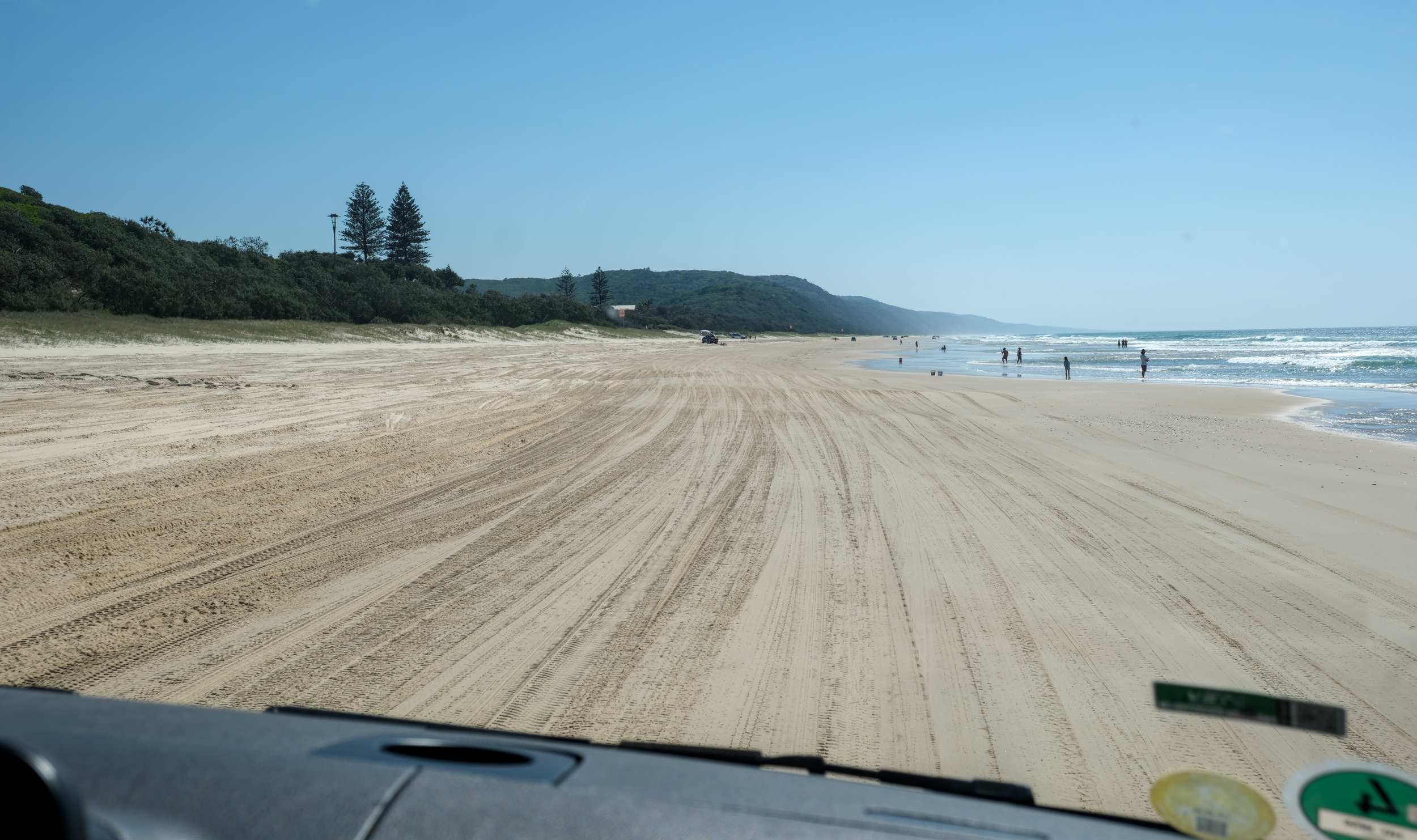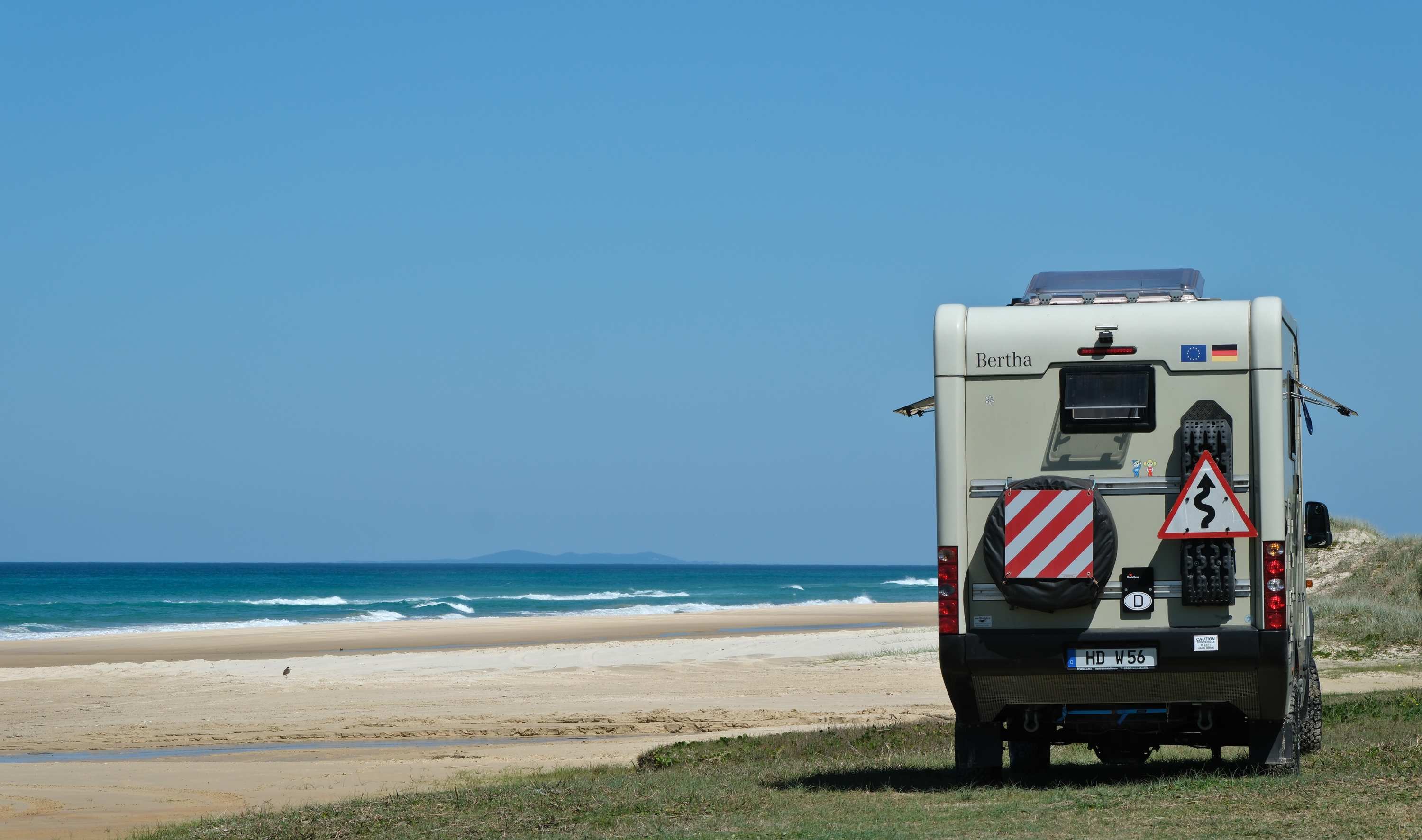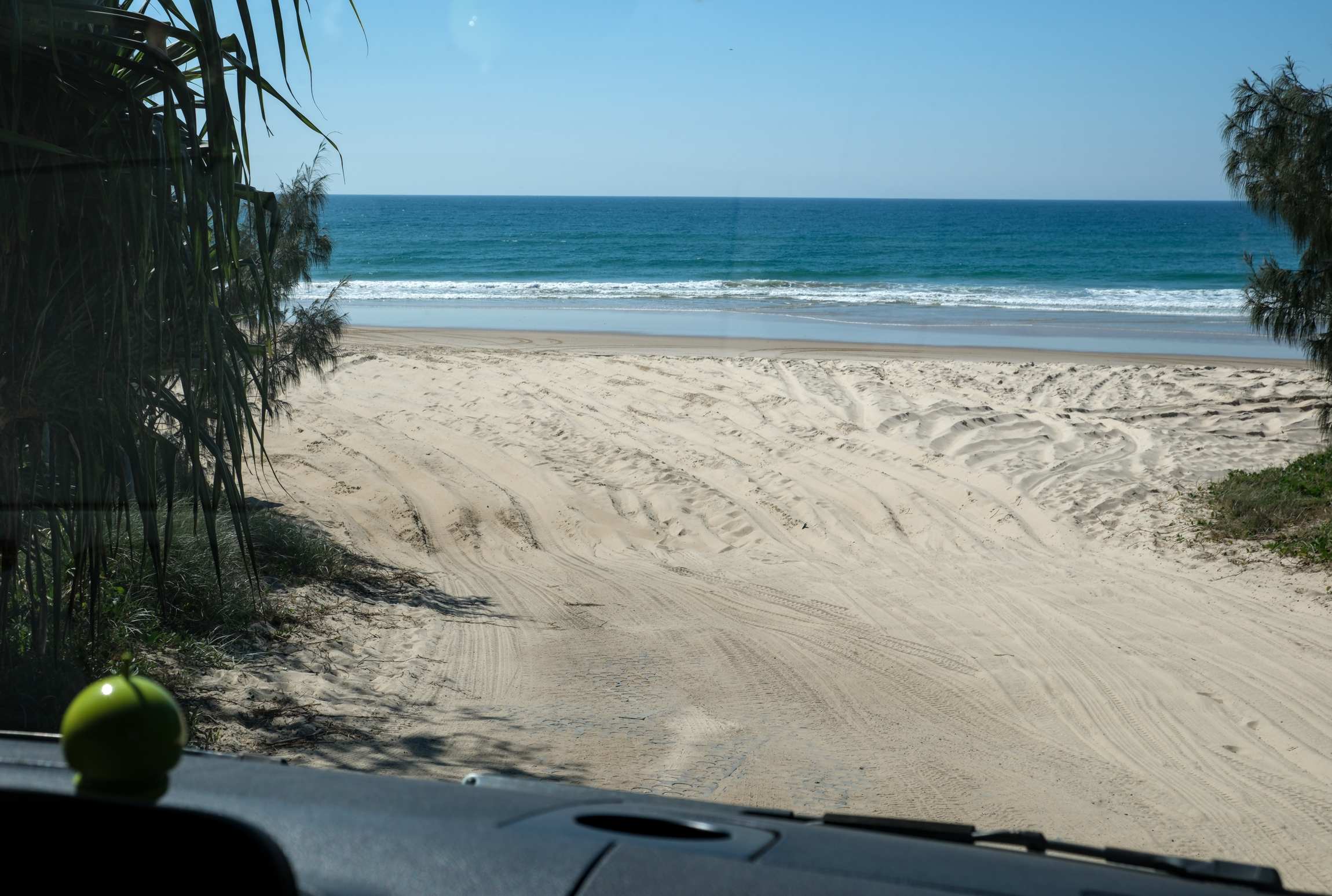 Im 'Great Sandy NP' am Cooloola Beach reduzieren wir bei Bertha den Reifenluftdruck und wagen uns durch den ersten Weichsand auf den Strand.