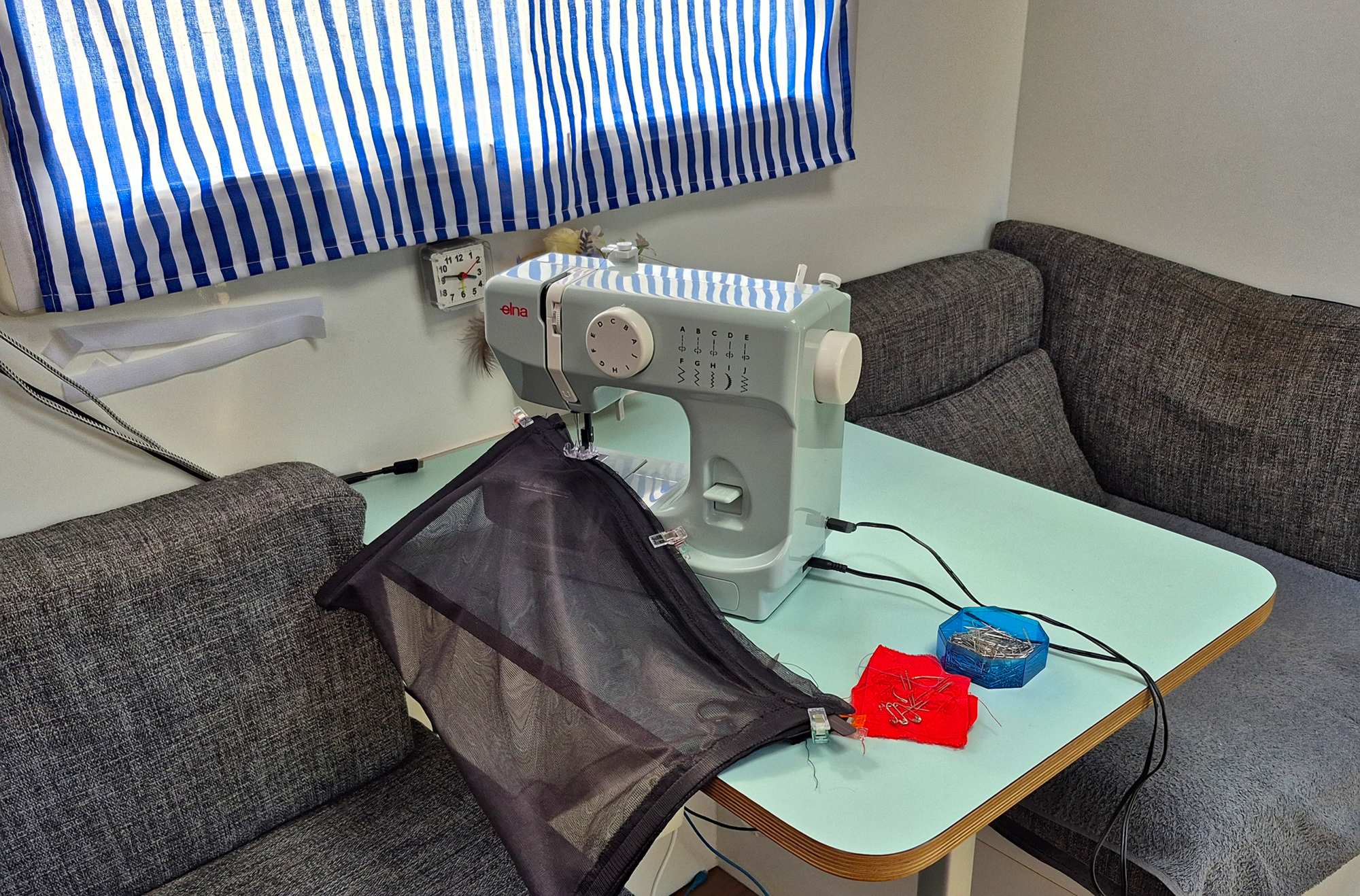 Zwischendurch näht Ulrike auf ihrer neuen, kleinen schweizer Nähmaschine (made in Thailand) weiter Mückenschutz, jetzt Version 3b oder so.