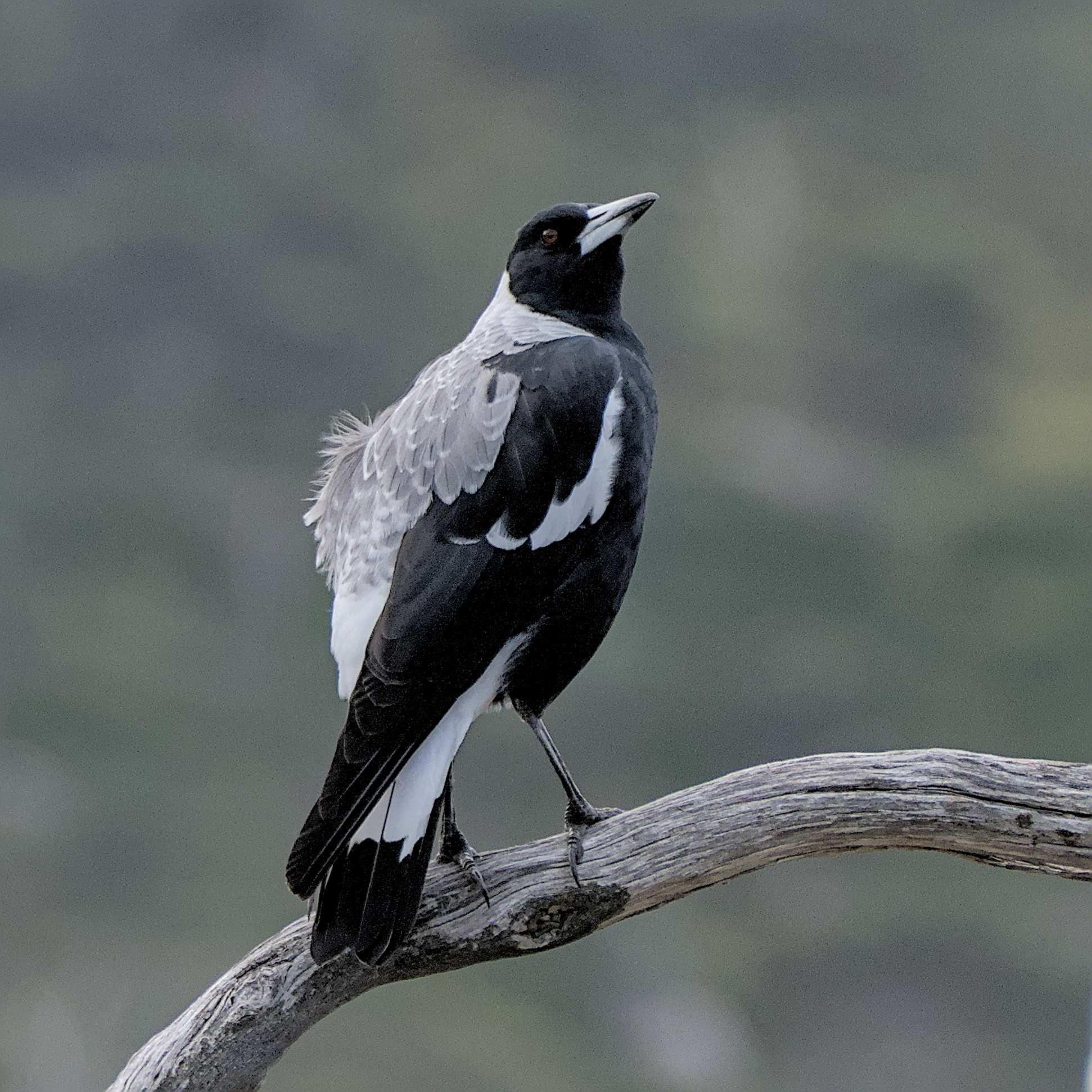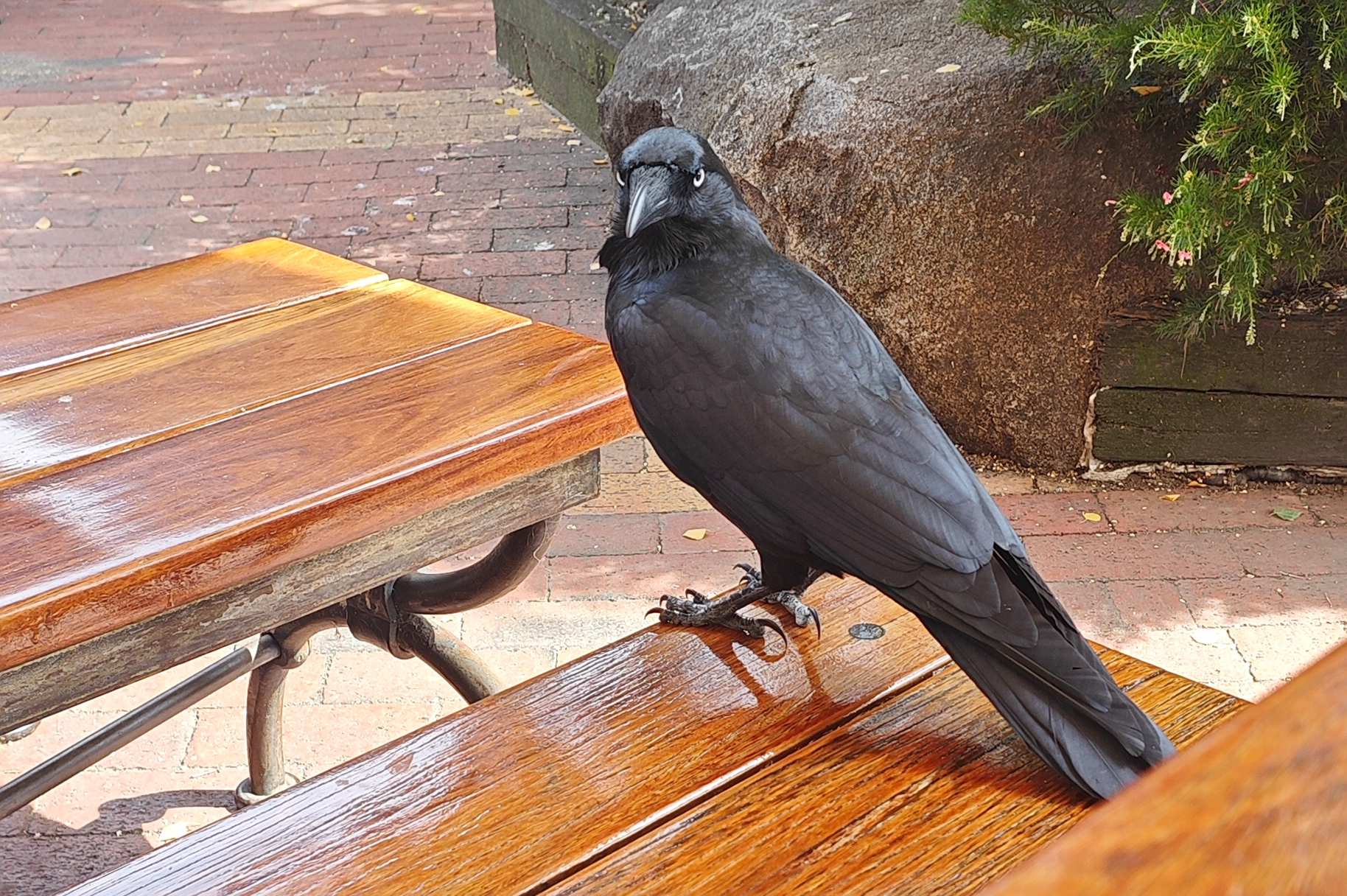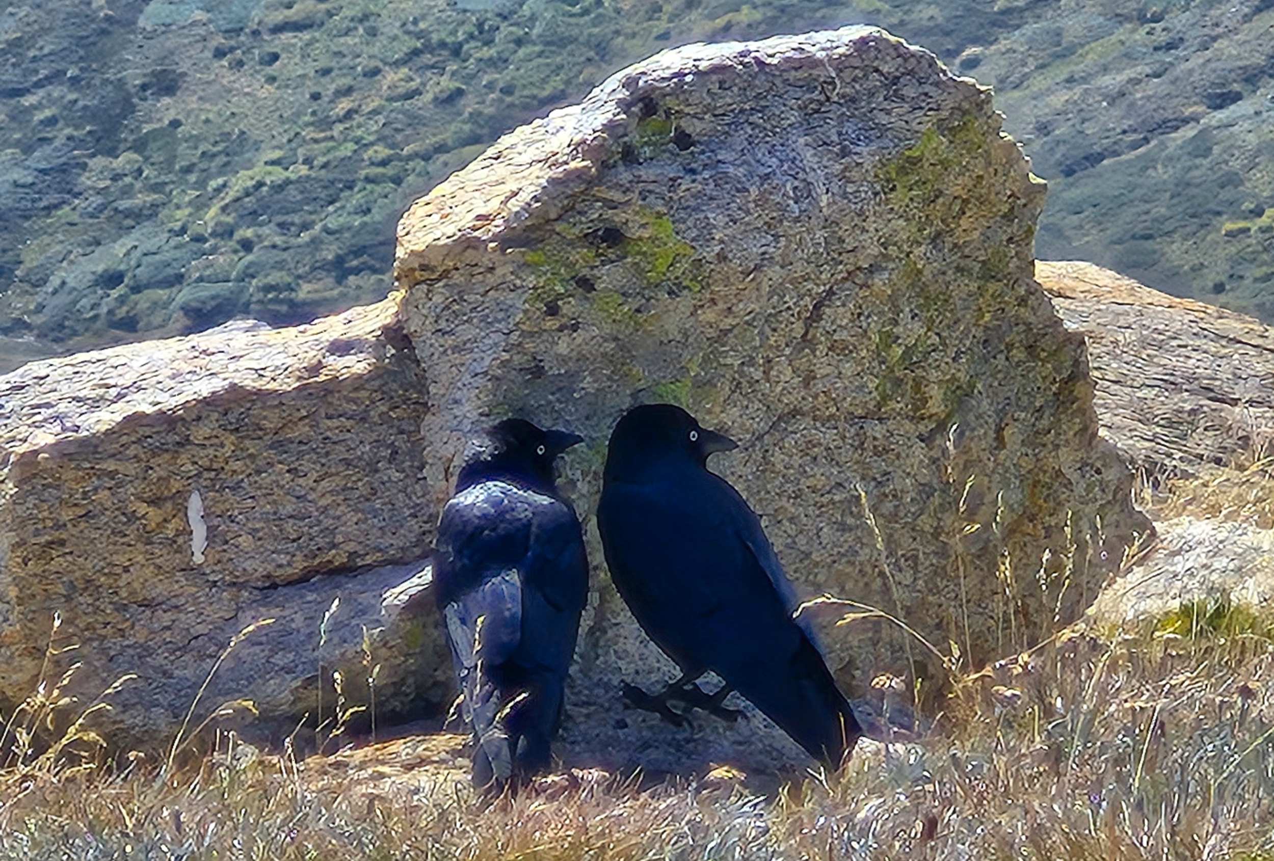 Ein Pärchen Krähen, das hinter einem Felsen Windschutz gefunden hat. Welche Art genau, ob Gesellschaftskrähe, Neuhollandkrähe, Tasmankrähe, Torreskrähe oder Bennettkrähe ist schwierig zu unterscheiden (vgl. Wikipedia).