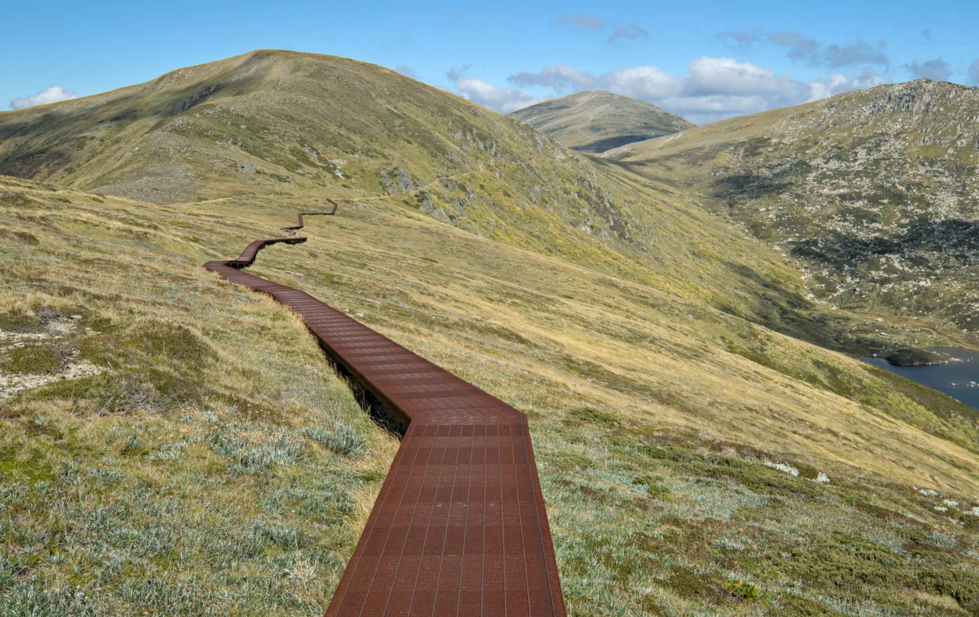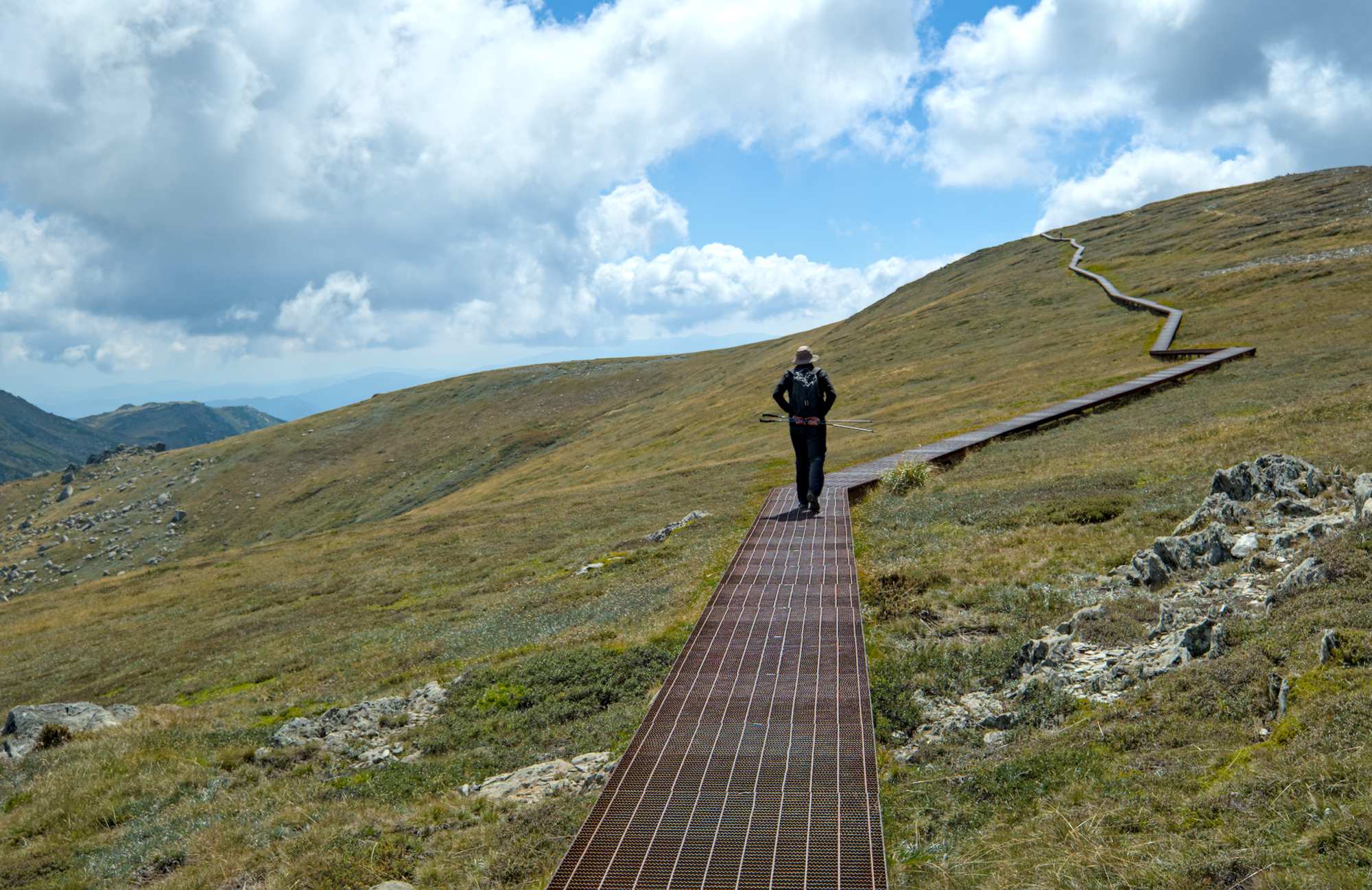 Rückblick auf den Eisenweg und den 'Mount Kosciuszko' in Bildmitte.