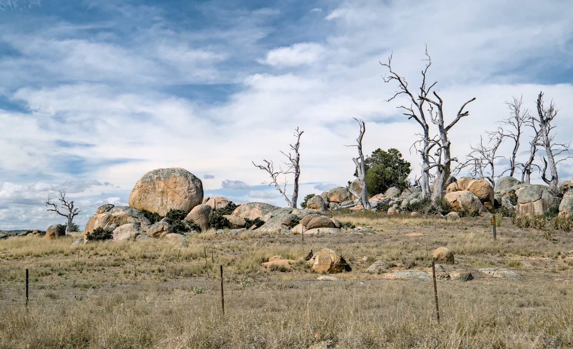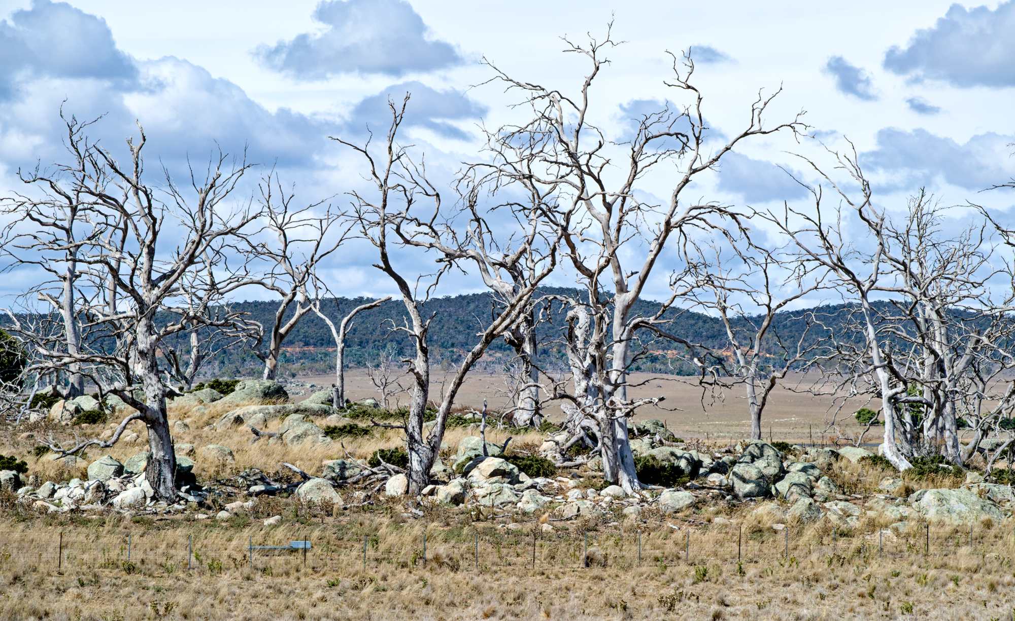 Wir kommen aus den Bergen hinunter und erleben wieder eine ganz andere Landschaft. Die bizarren abgestorbenen Bäume tun das ihre dazu. Verdrocknet? Eher, wie schon öfter gesehen, durch Buschfeuer verursacht.