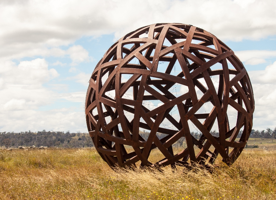 Die Skulptur 'The Snowy River Sphere' von Richard Moffatt aus recycelten Stahl.