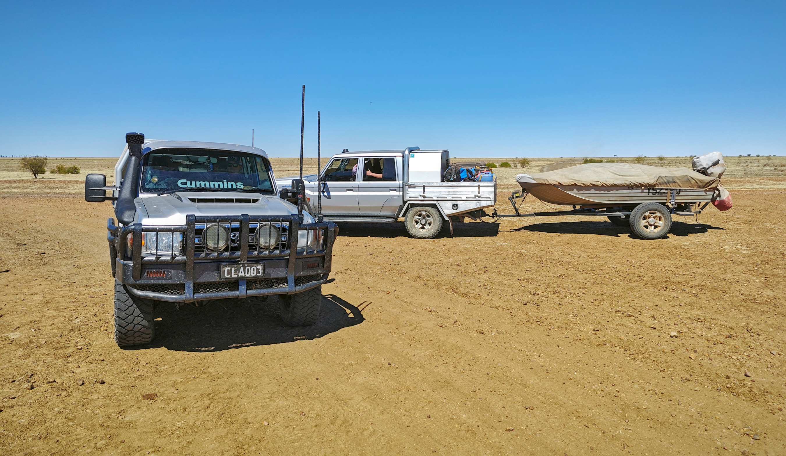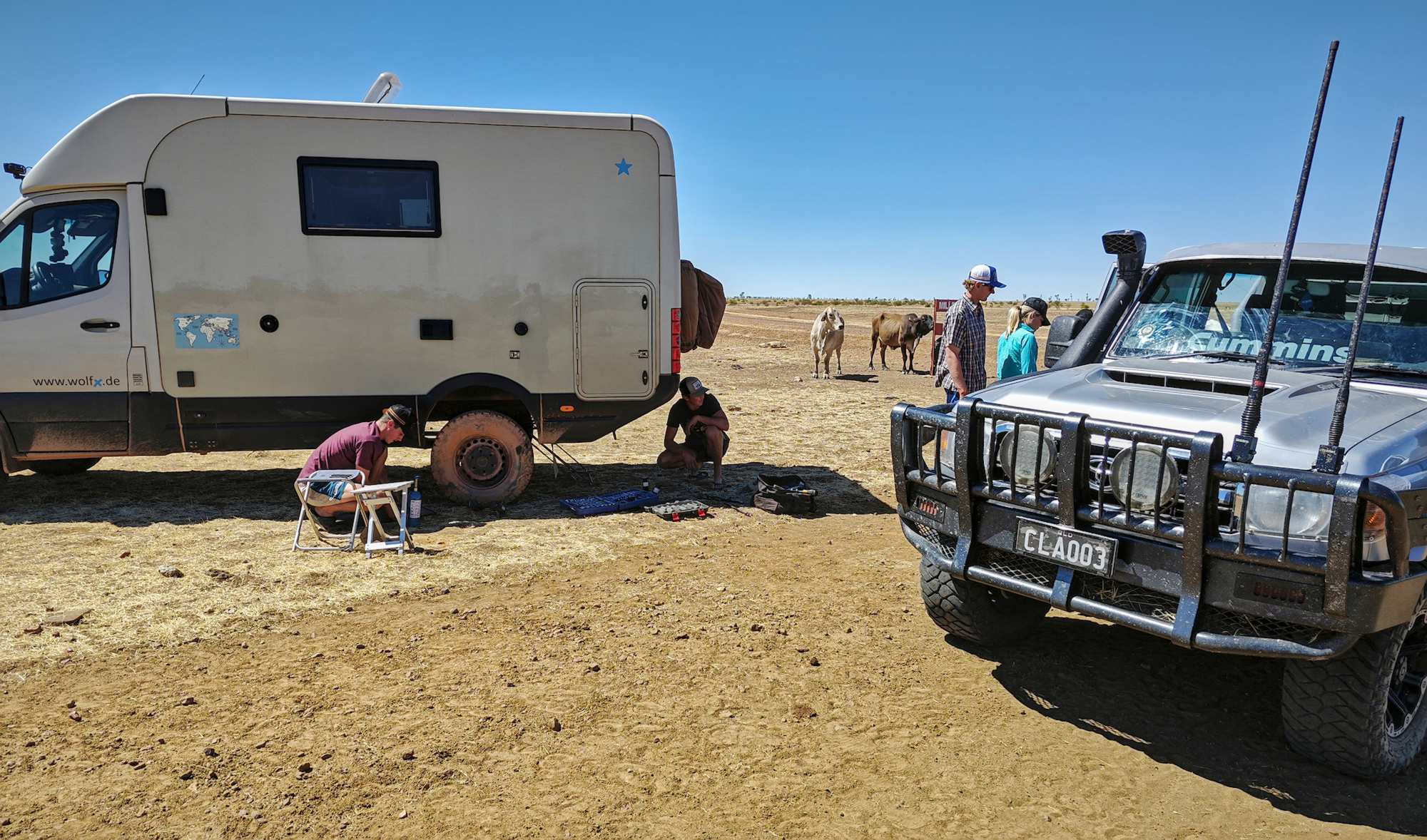 Gestern auf einer 200 km langen, schmalen 'Gravel Road' (Schotterstraße), 40 km vom nächsten Ort, mitten im Nirgendwo, verlor ein Reifen Luft und irgendwann musste ich ihn wechseln. Dummerweise habe ich dabei den Schlüssel für den Heckstauraum mit nötigem Werkzeug dortselbst eingeschlossen, den gut versteckten Ersatzschlüssel nicht finden und Ulrike mitten in der Nacht in Deutschland nicht erreichen können. Habe erst einmal gefrühstückt. Nach 1½ Stunden kamen die ersten beiden Geländewagen vorbei, mit sechs werkzeugmäßig gut ausgestatteten und außerordentlich hilfsbereiten jungen Australiern, die den Reifenwechsel innerhalb von 10 Minuten erledigt, auch den kaputten Reifen schon wieder geflickt und beide exakt aufgepumpt hatten. Muss ich erwähnen, dass ich nichts anfassen durfte?