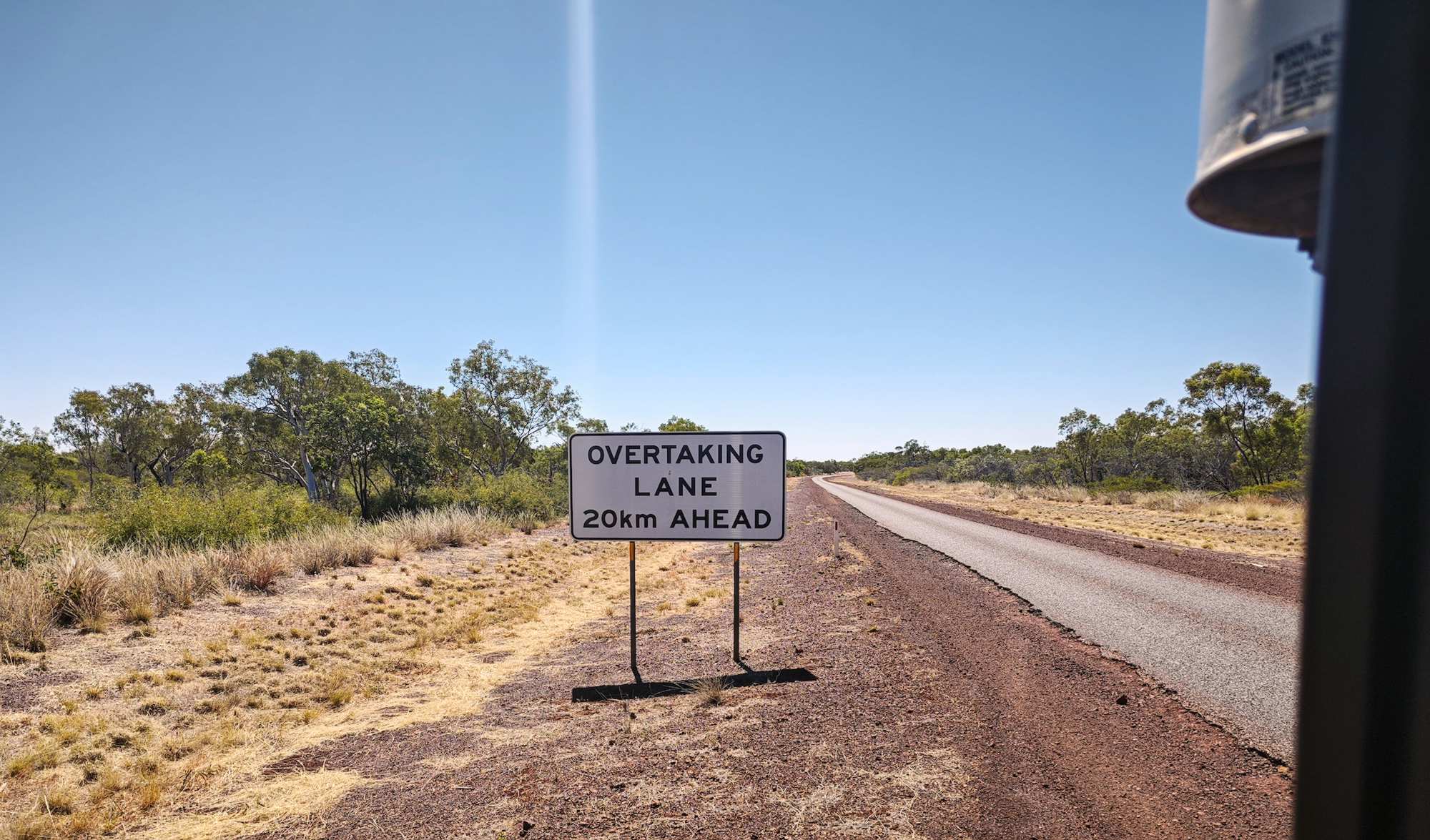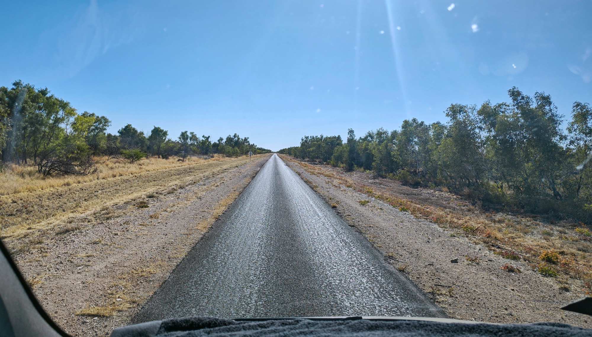 Nur noch 300 km bis Darwin, wo ich nächsten Dienstag Ulrike vom Flughafen abholen werde. Ich fahre immer mit einem Auge auf den Reifendruck und den wachsenden Riss in der Scheibe. Die muss noch bis Darwin halten, nur wie sage ich es ihr?