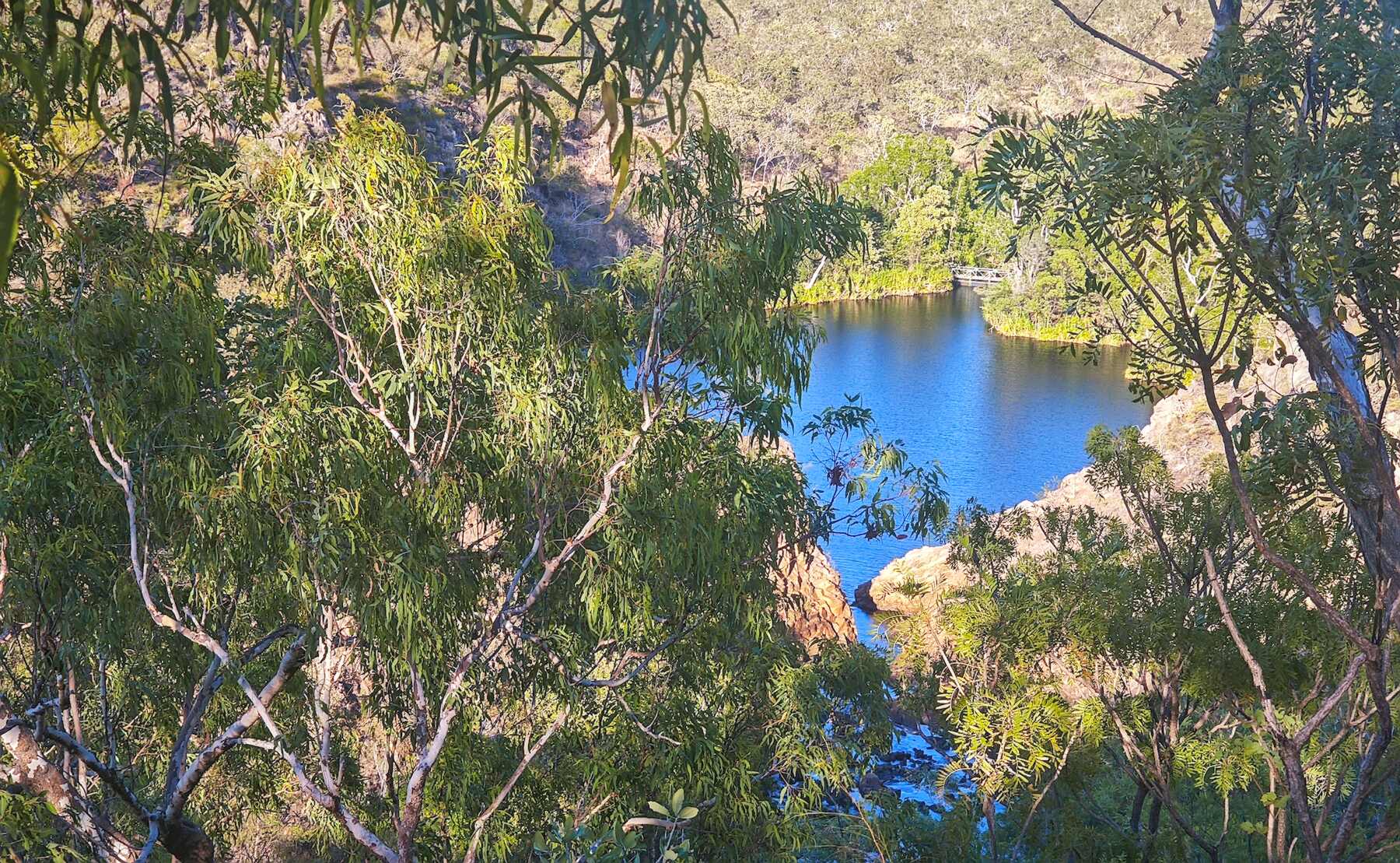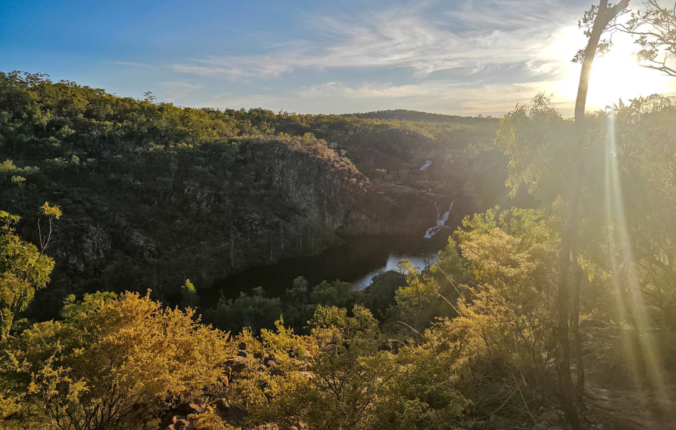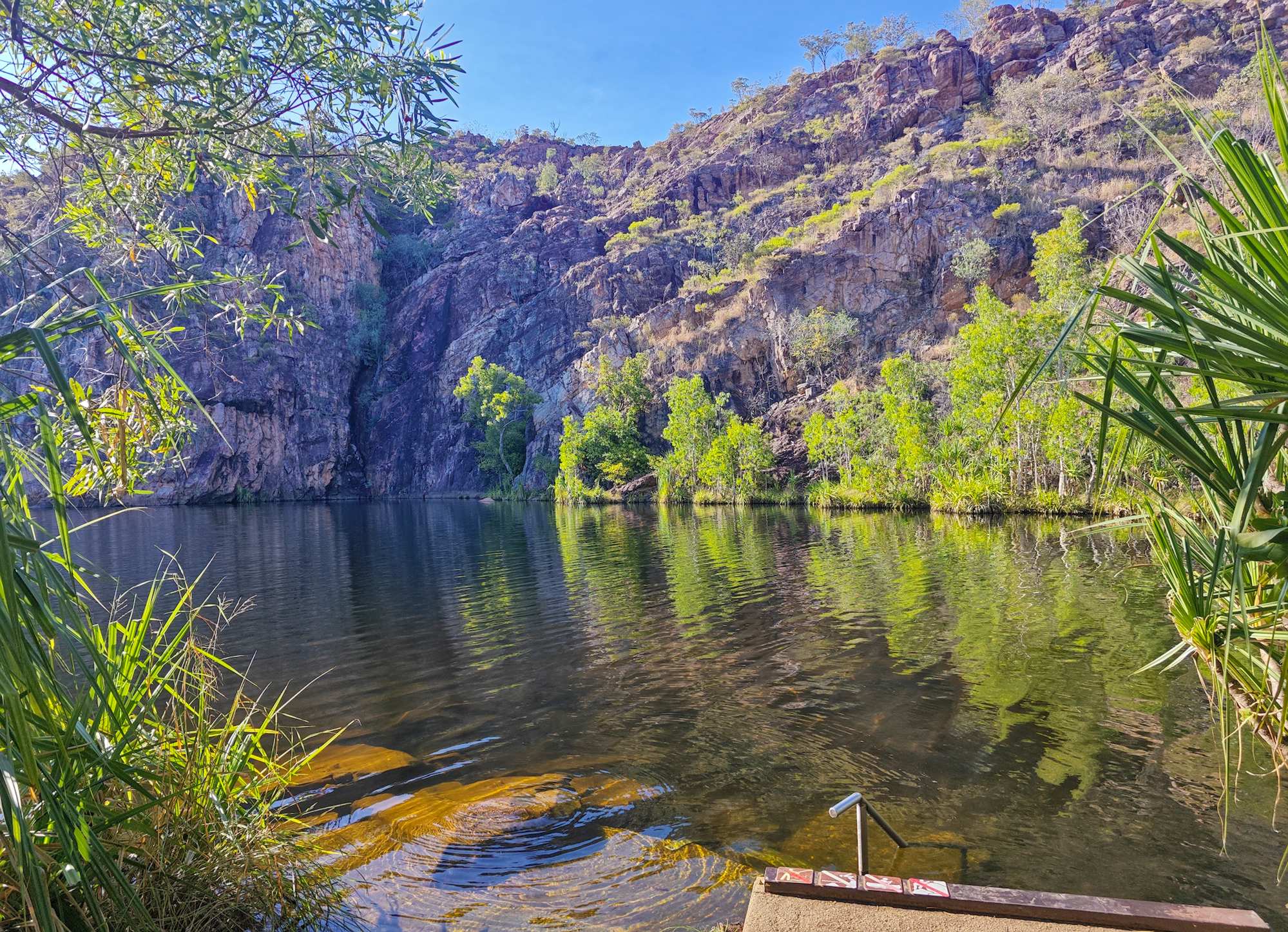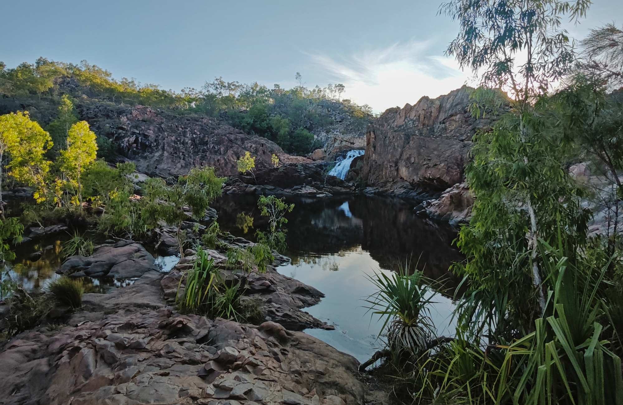 Am Aufbruchtag bei den 'Edith Falls' bin ich noch vor Sonnenaufgang auf dem 'Leliyn Track' unterwegs gewesen: Sehr schöne Rundtour um den unteren und mittleren Pool herum, in herrlicher Landschaft mit Blick auf einige Wasserfälle, aber auch etwas anstrengend, da ordentlich auf und ab. Wieder im Campground angekommen gleich in den großen kühlen See gesprungen und den Körper heruntergekühlt.
