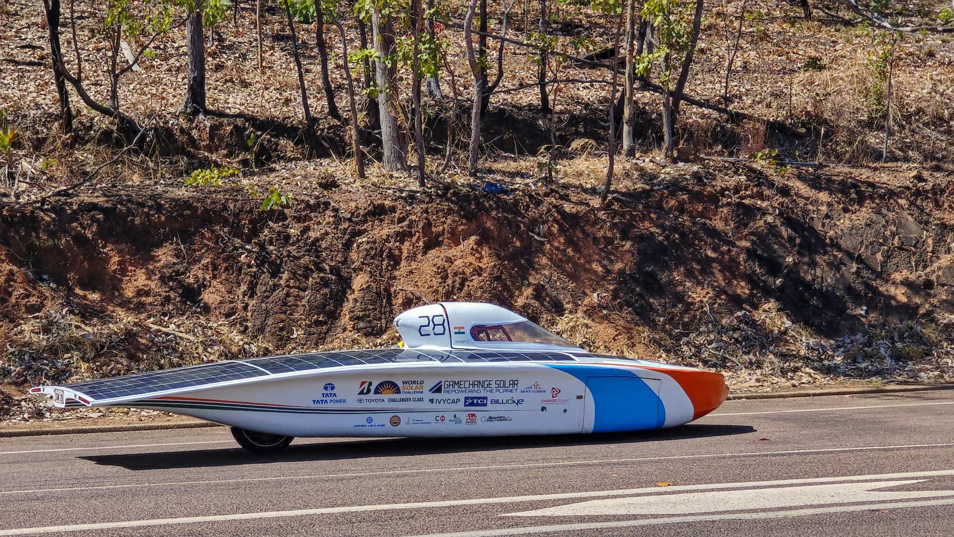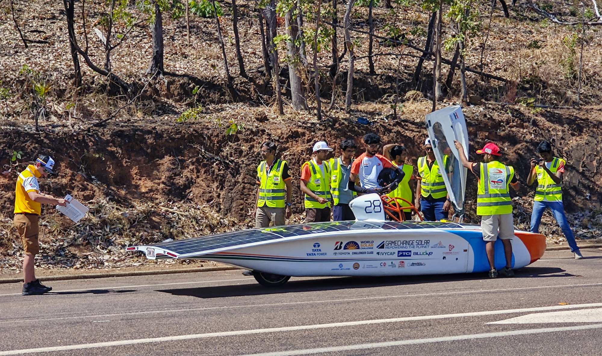 Auf dem 'Stuart Highway' findet gerade ein Solarmobilrennen statt, mir kommen einige dieser Vehikel mit jeweils mehreren Begleitfahrzeugen entgegen. Dieser Inder hatte wohl gerade eine Panne. Nach ein paar Minuten setzt er sich aber wieder in Bewegung.
