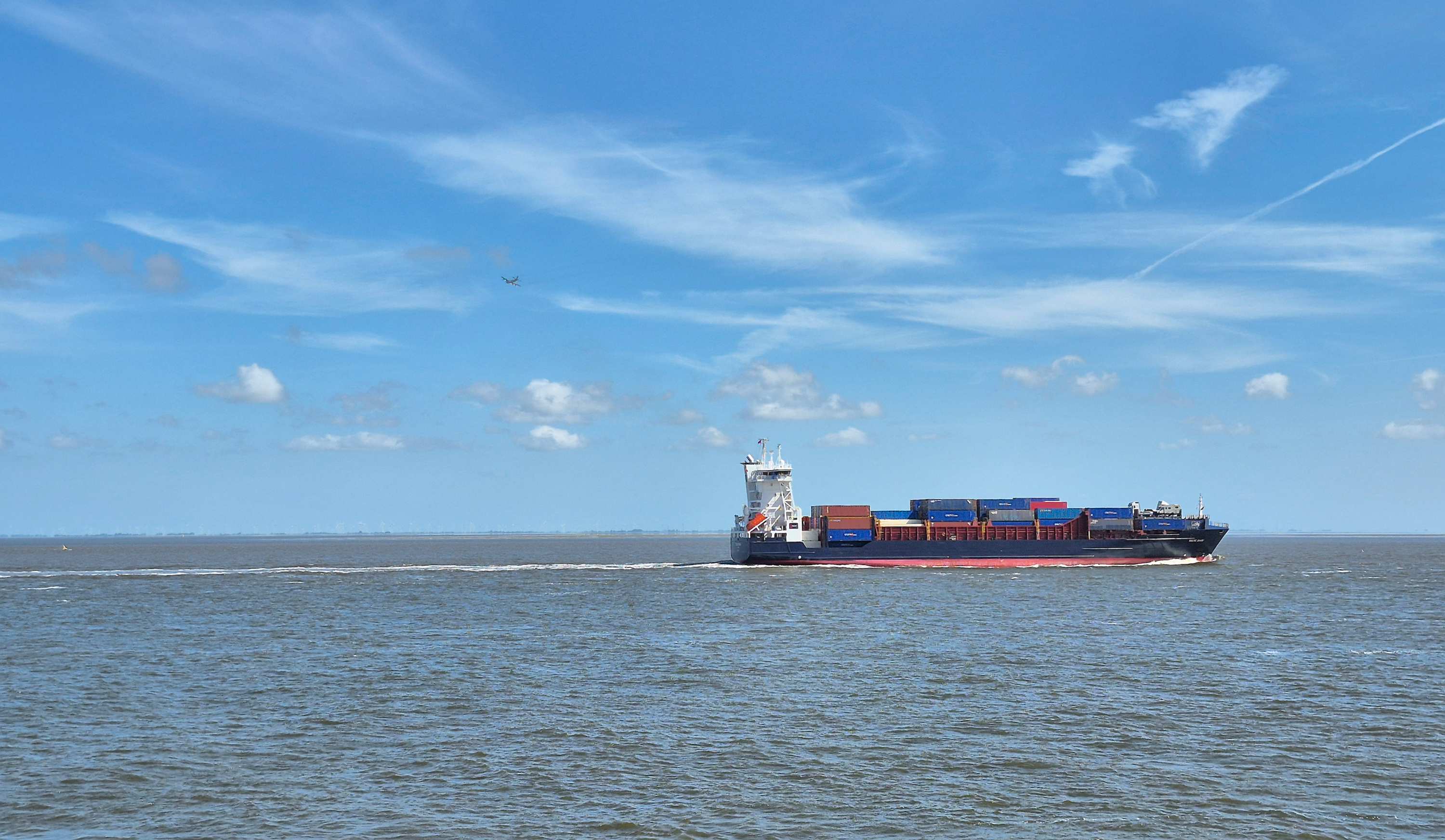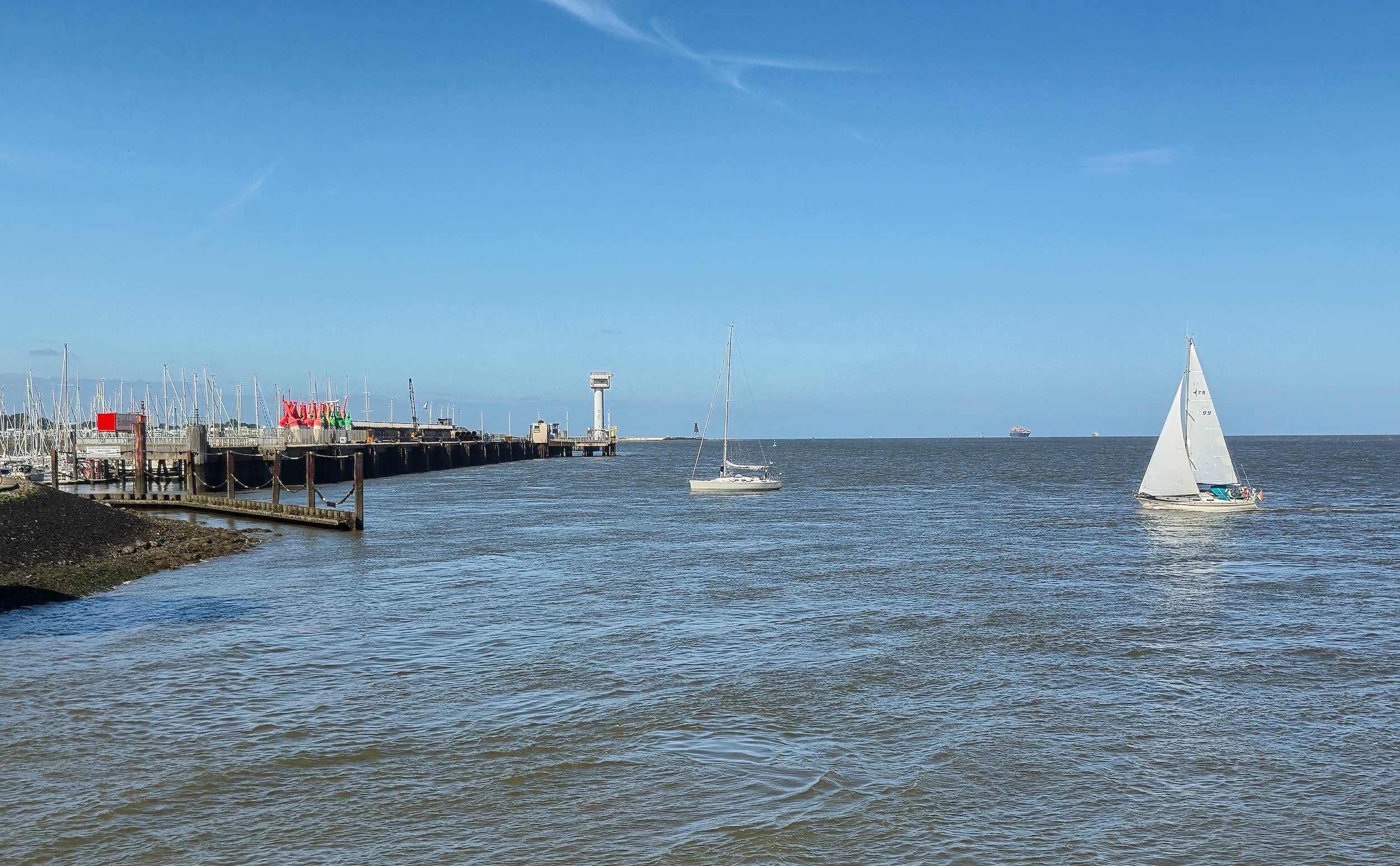 Ulrike in Cuxhaven. Die Elbmündung: Im Hintergrund die Kugelbake, der Offshoretrainingsturm und der Yachthafen.
