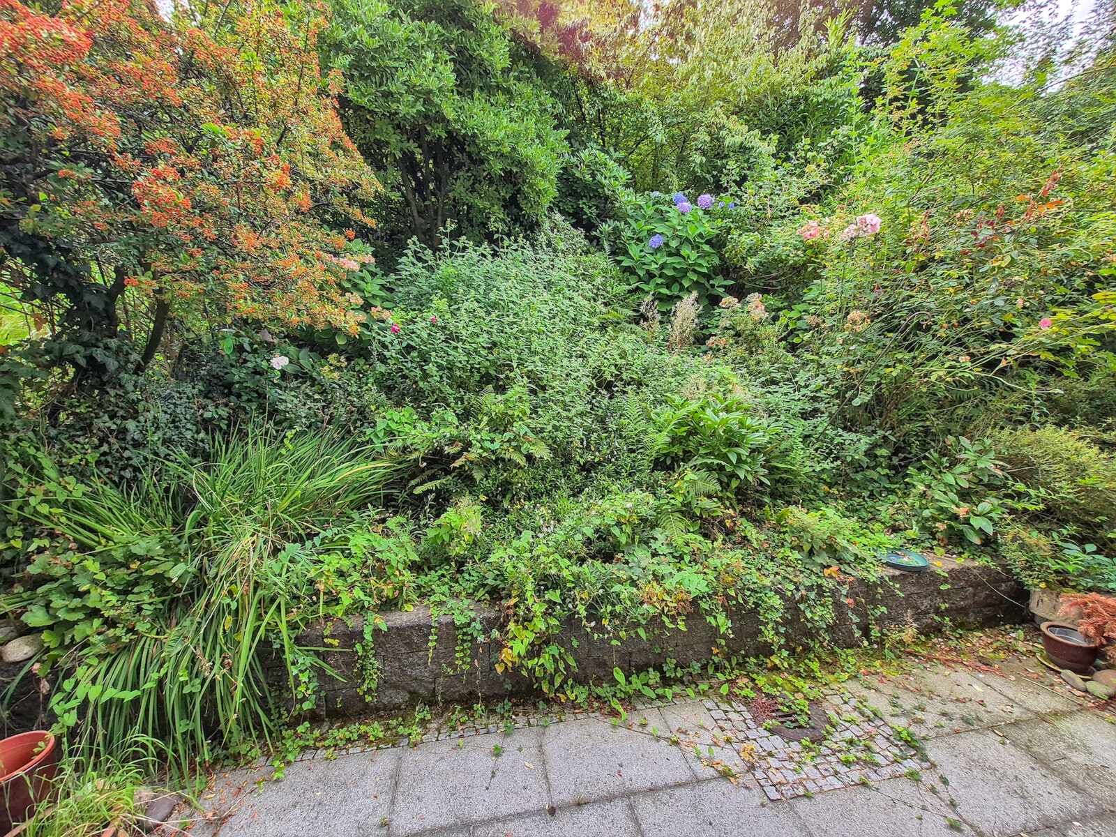 Unser Garten hinterm Haus, vor und nach Ulrikes Pflegemaßnahme.