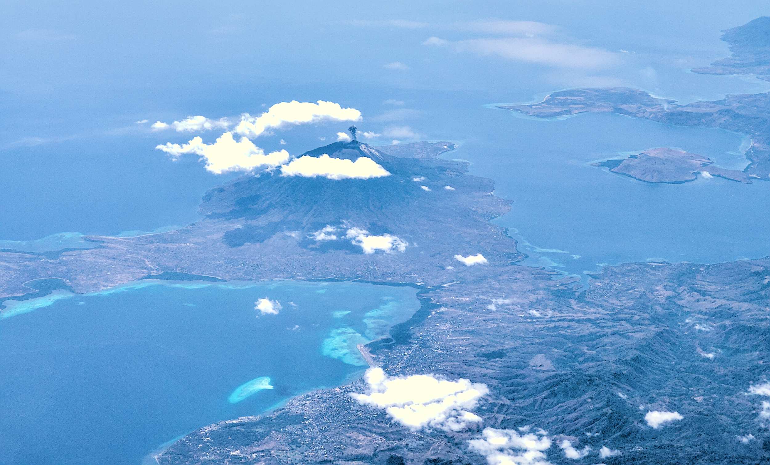Just beim Vorbeiflug spuckt der Vulkan Lewotobi ein kleines schwarzes Wölkchen aus.