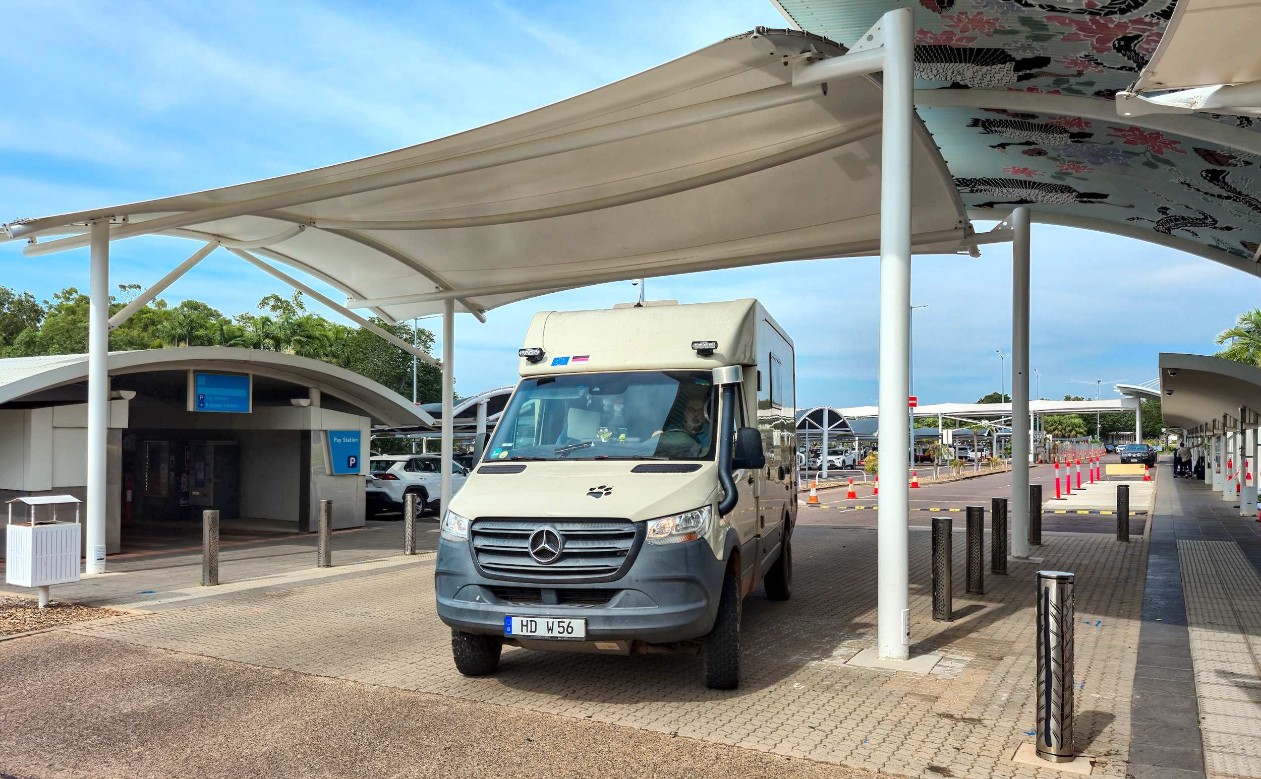 Heute sind wir bei Mercedes in Darwin vorbeigefahren: Die Scheibe kommt aus Malaysia und wegen Zollbestimmungen(?) nicht direkt hierher, sondern ins weit entfernte Melbourne, von wo aus sie dann nochmals mindestens sieben Tage unterwegs sein wird... Sobald wir deren Eintreffen in Melbourne gemeldet bekommen, werden wir für ein paar Tage in den 'Litchfield National Park' verreisen. Es gibt aber auch hier noch einiges zu tun: U. a. müssen die neue Scheibe des Dachfensters eingebaut und unsere Etappenberichte nachgeliefert werden.