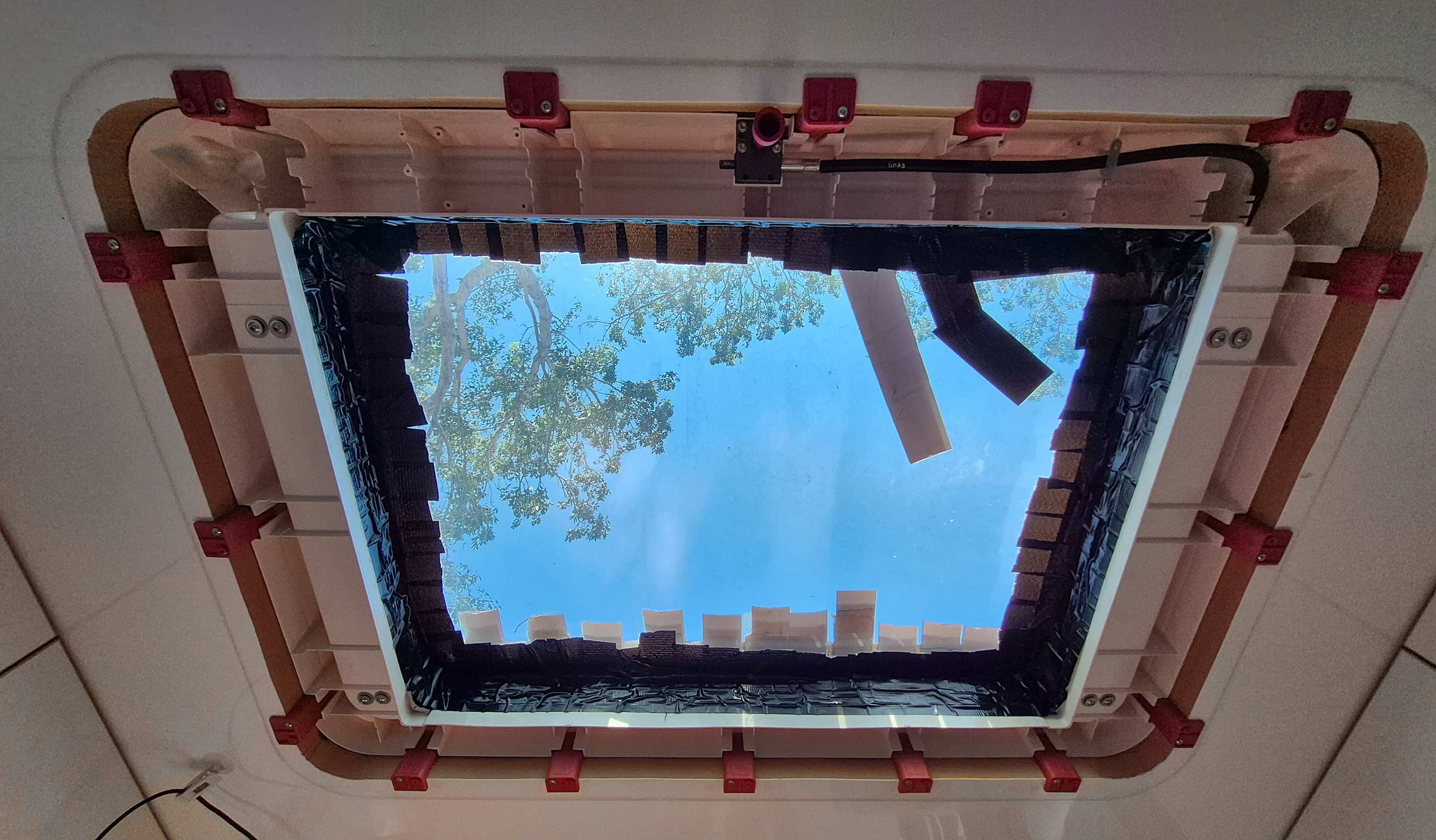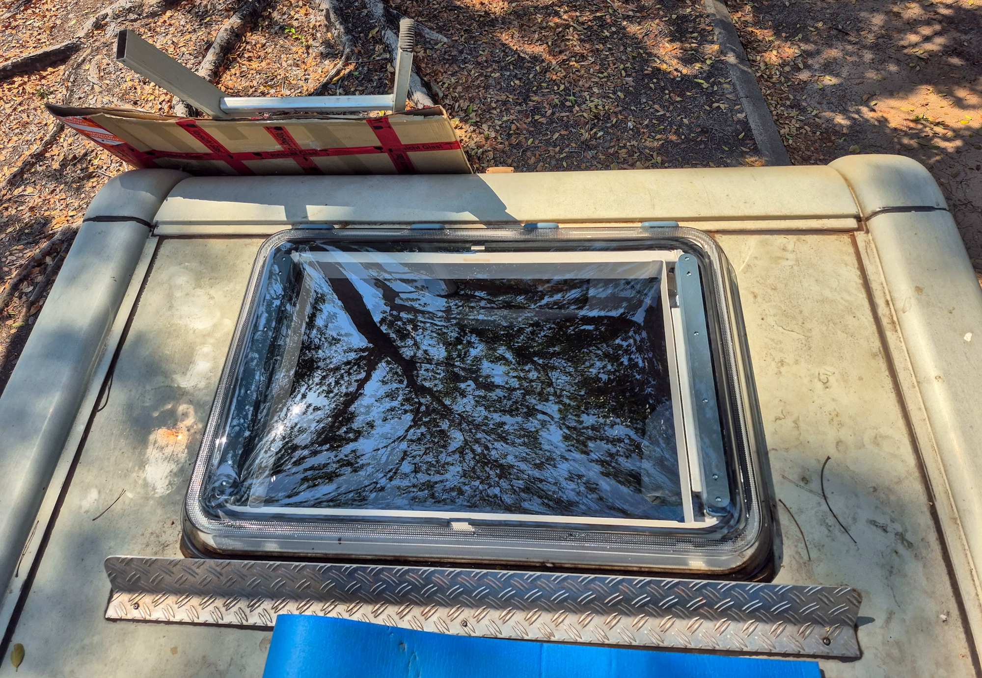 Die Panoramadachfensterscheibe (ich liebe die Möglichkeit der deutsche Sprache Komposita zu bilden!) ist dank Ulrikes Verpackungskünsten heil angekommen. Wir entfernen die alte, reinigen gründlich, bauen die neue ein und tauschen die Antriebswellen aus.