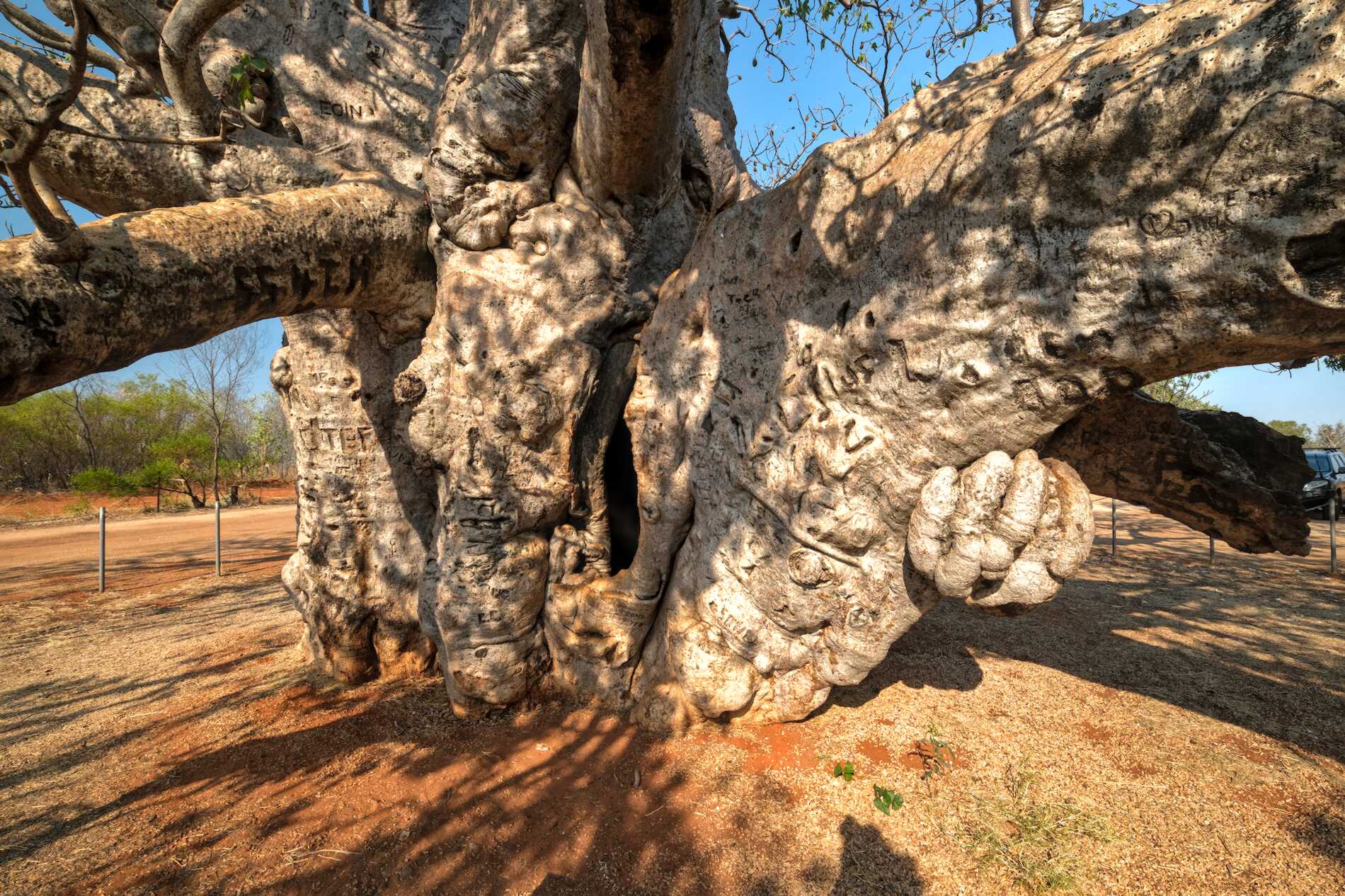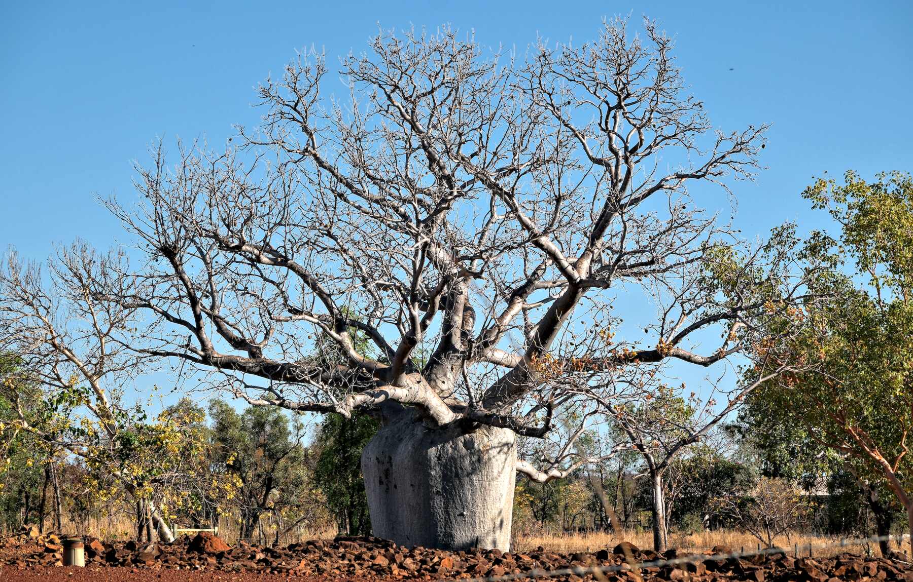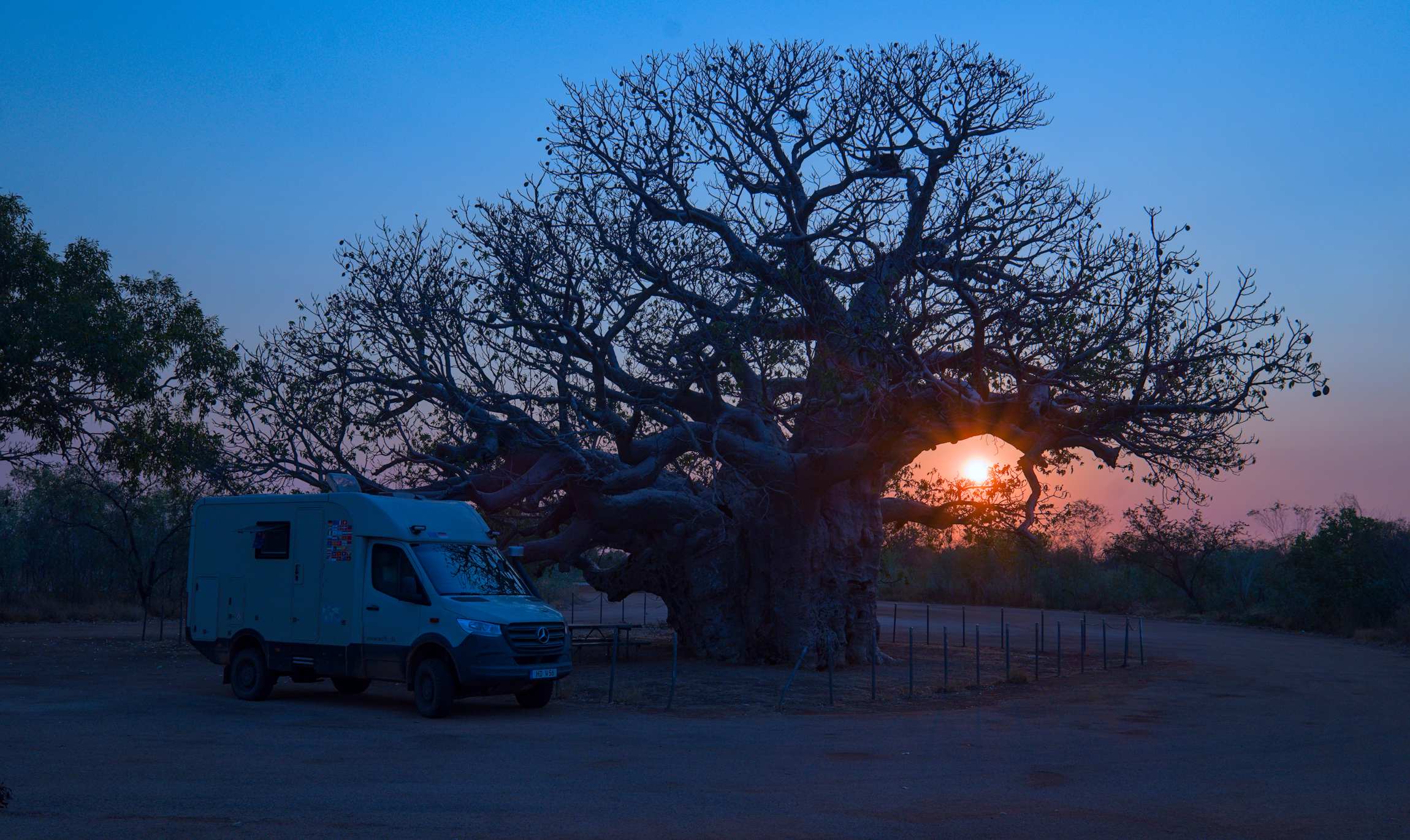 Nach der ganzen Arbeit in der Hitze gleich noch einmal geduscht, kurz Einkaufen gewesen, viele Getränke bei fast 40 °C, und noch gut 180 km bis zu einem Rastplatz bei einem riesigen uralten ehrwürdigen Boab, der uns Schatten gibt und heute Nacht bewachen wird.