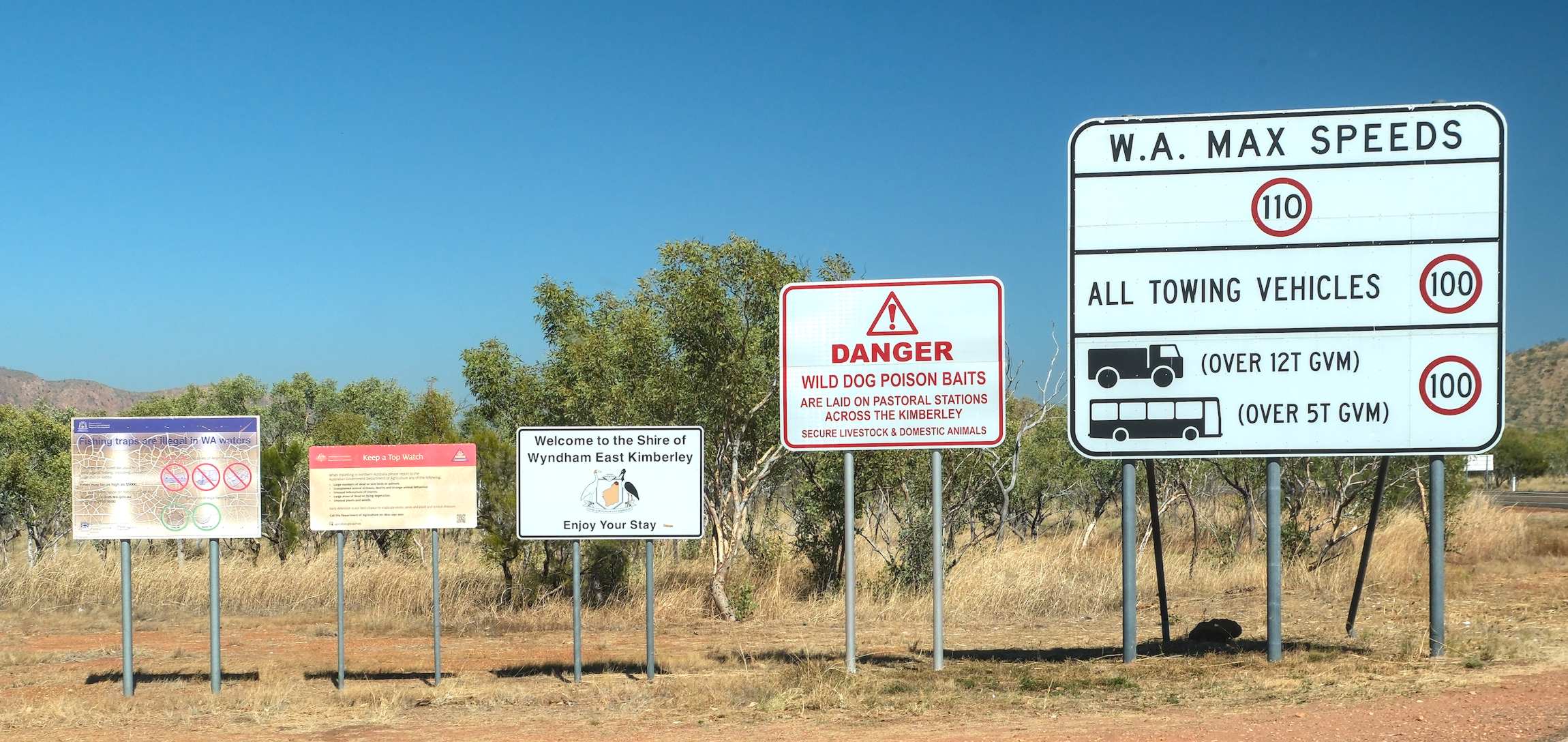 Wir überqueren zum ersten Mal die Grenze nach Westaustralien. Bei der Biokontrolle bemängelt ein übel gelaunter Offizieller unsere nicht ganz tiefgefrorene Petersilie und entsorgt sie zu unserem Bedauern.