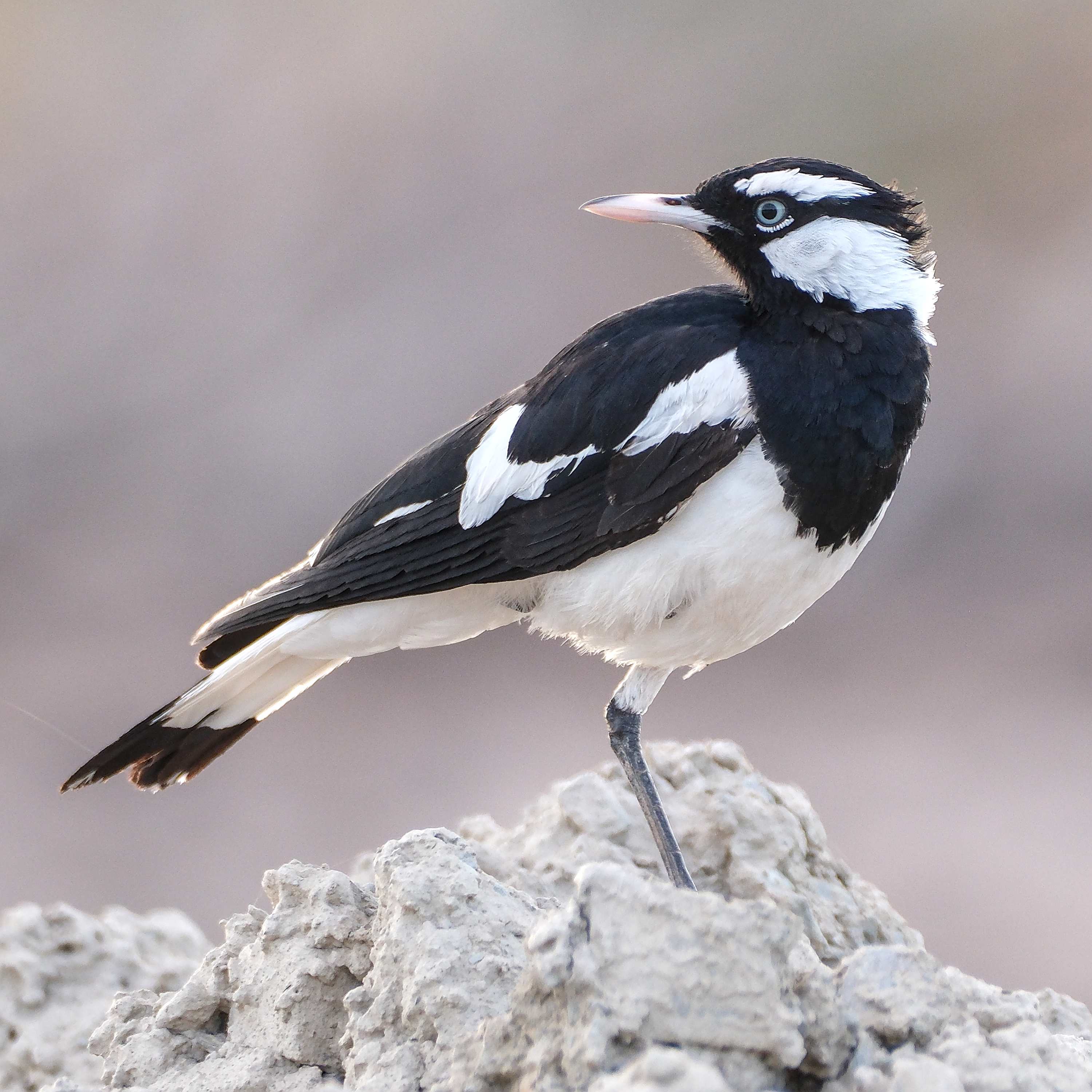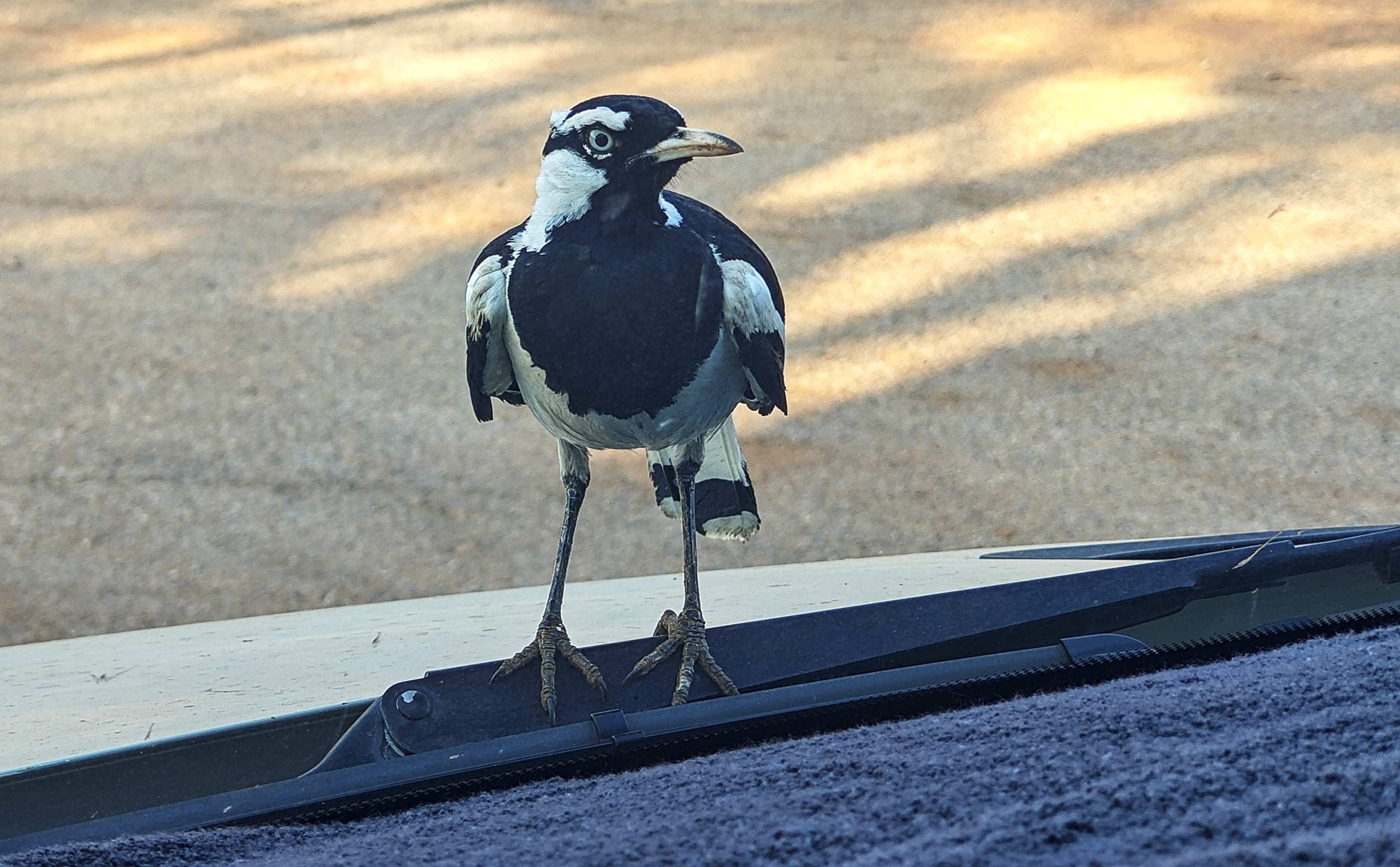 Dort äugt auch ein neugieriger Stelzenmonarch durch die Windschutzscheibe in Bertha.