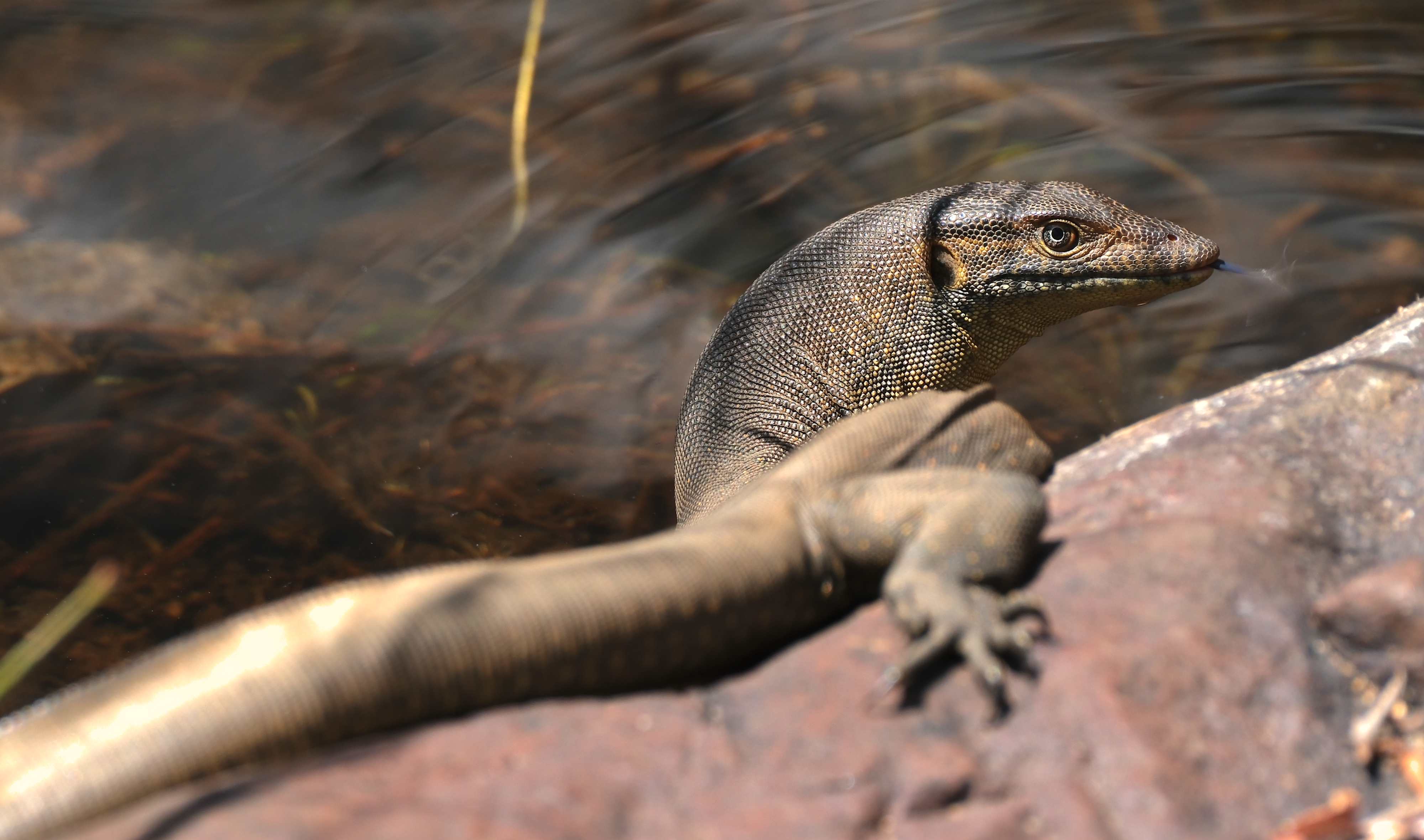 Ein 'Mertens-Wasserwaran', der gerade in sein Lieblingselement hinabgleitet.