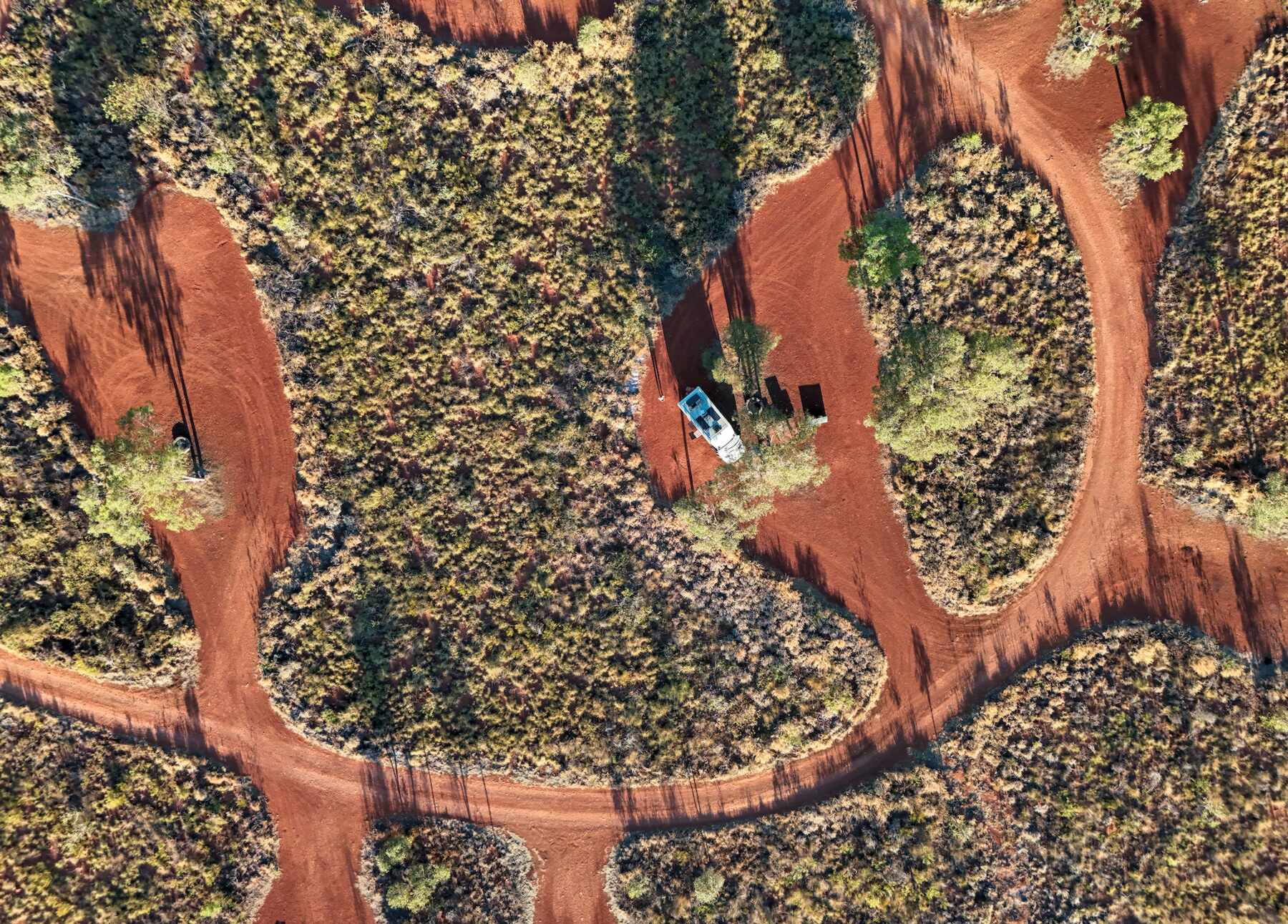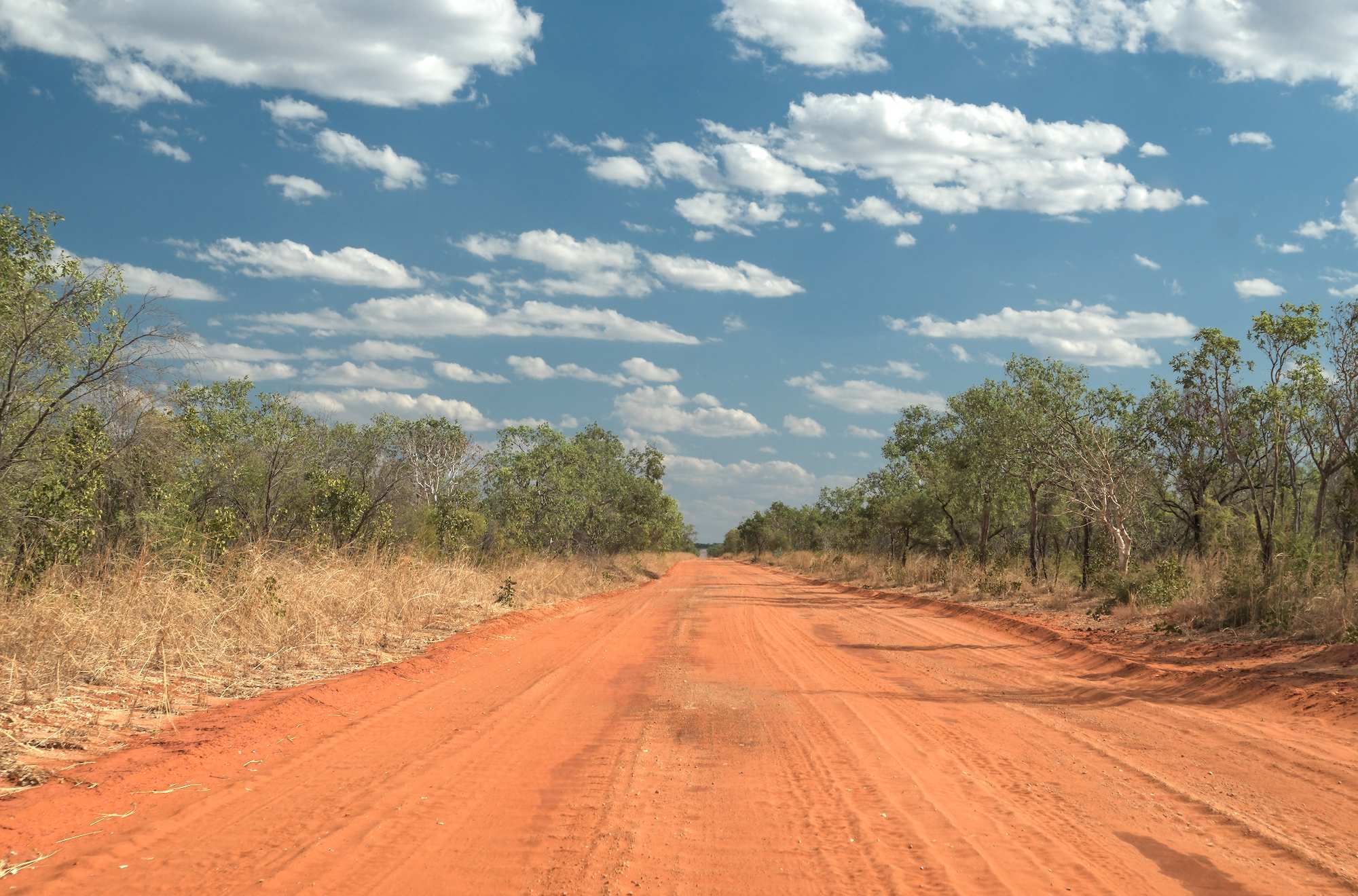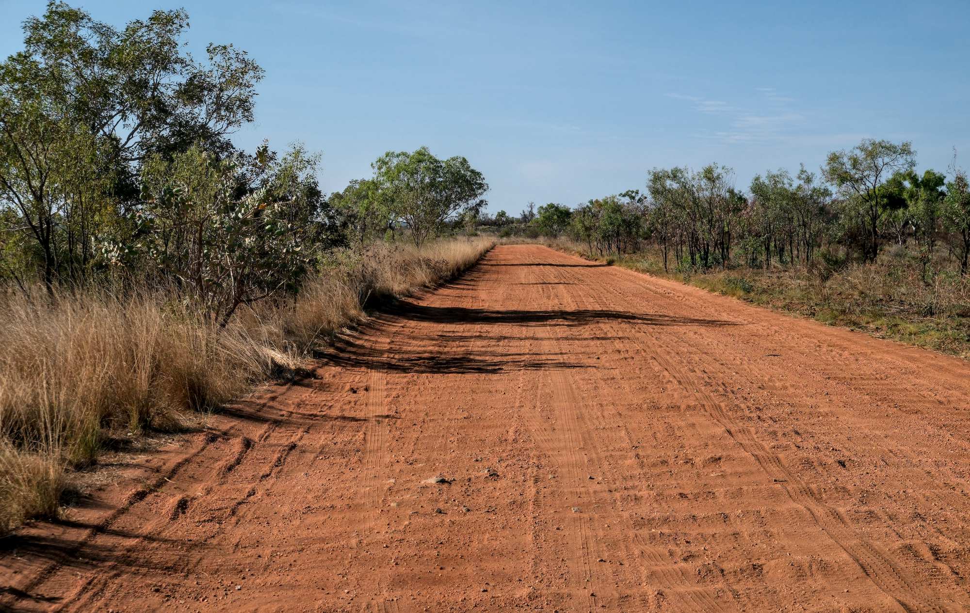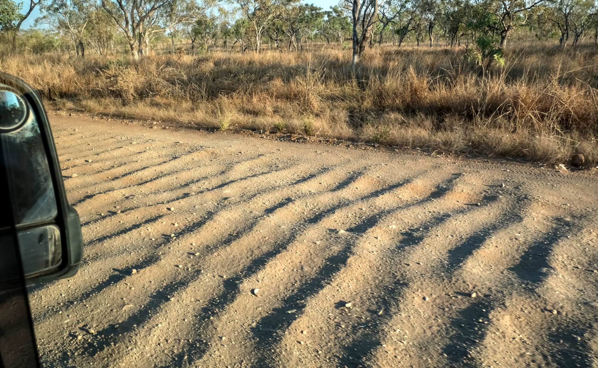 Gut 120 km sind zunächst ziemlich wellig und steinig, dann kommt rote Erde, auch Waschbrett, aber besser zu fahren.