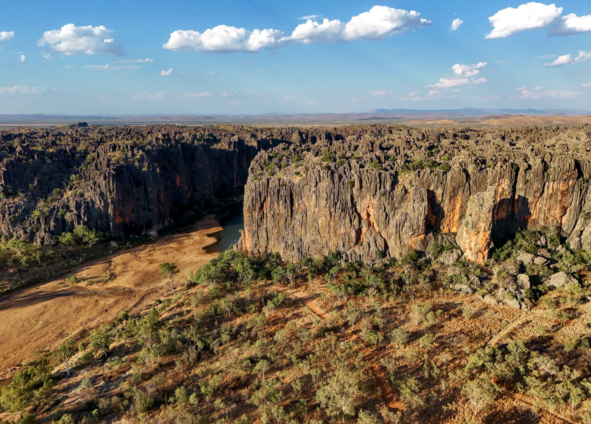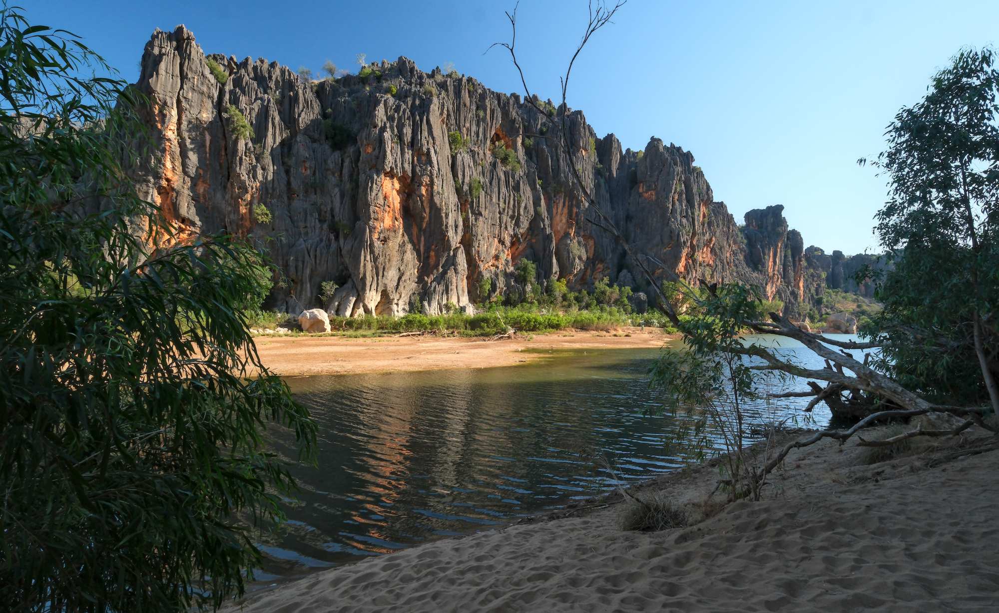 Die senkrecht geschichteten Felsen der 'Windjana Gorge' waren früher ein Korallenriff, aber das ist schon 350 Millionen Jahre her.
