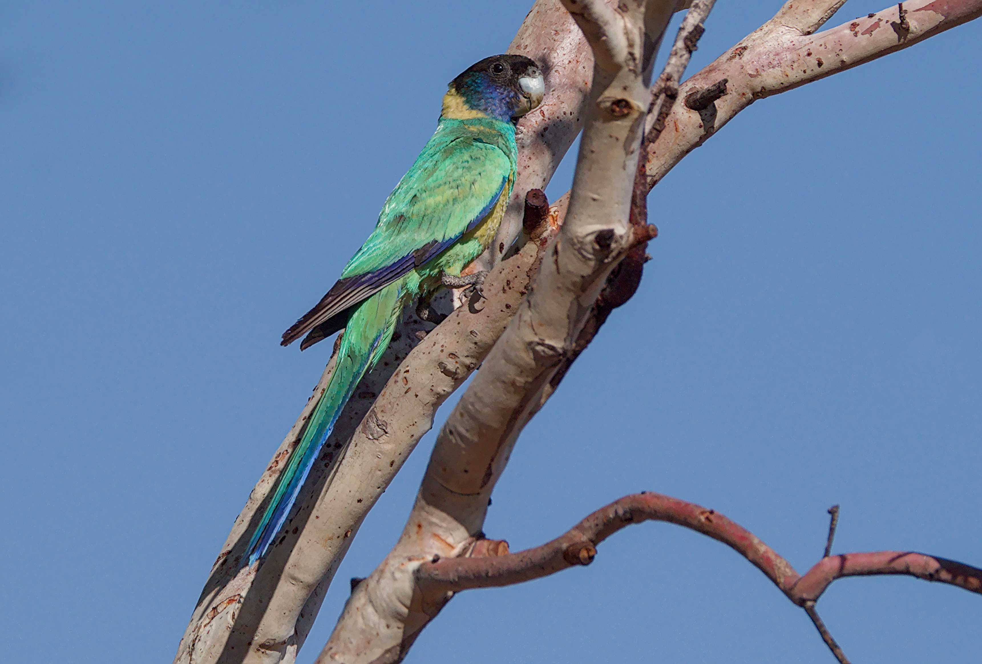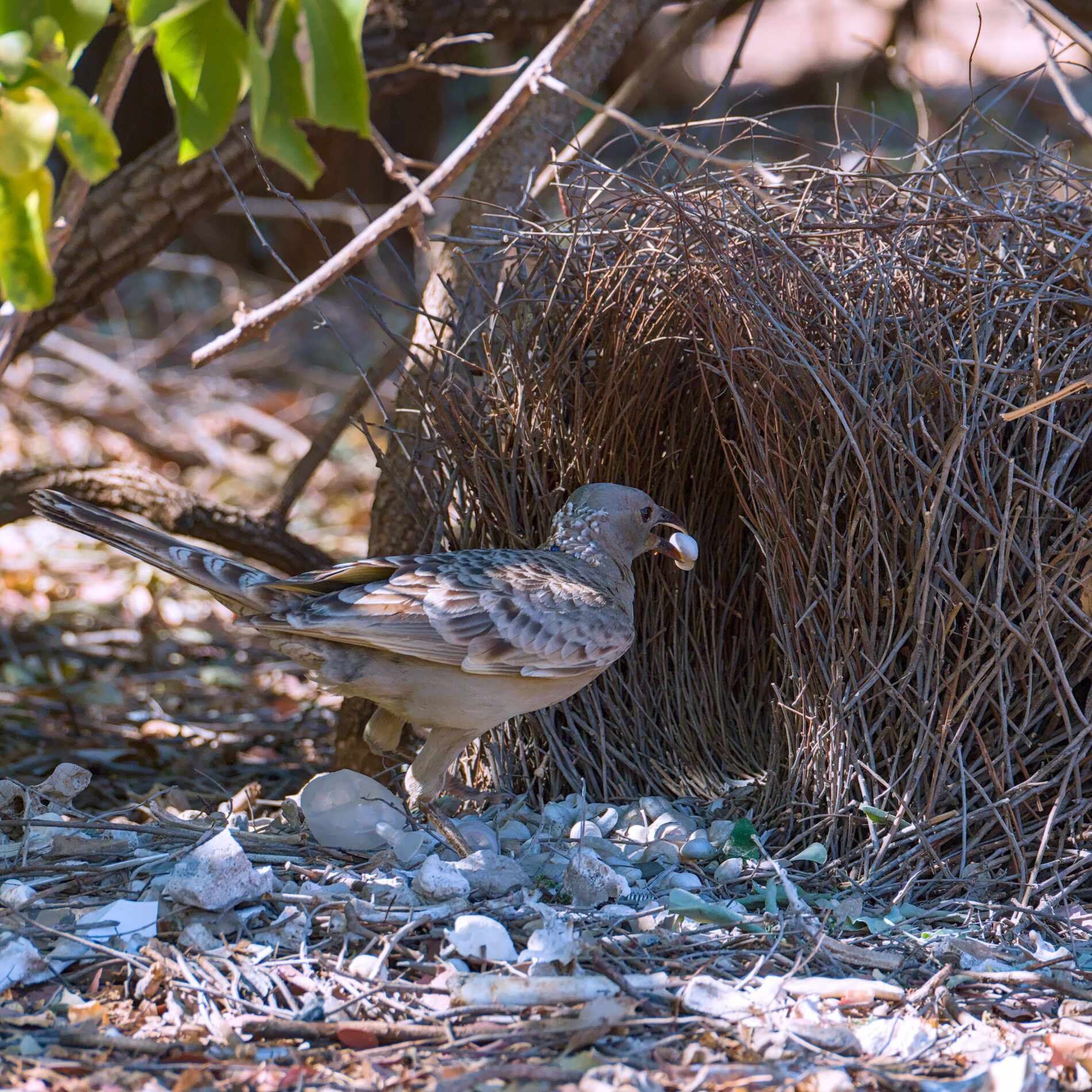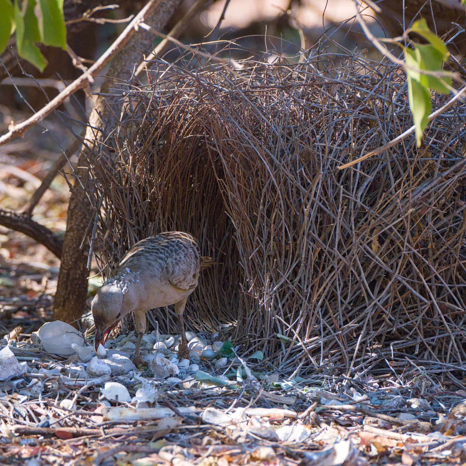 Ein Bowerbird (Laubenvogel). Auf Grund der Intelligenzleistung, die sie beim Bau und der Dekoration ihrer Lauben zeigen, werden sie zu den intelligentesten unter den Vögeln gezählt (siehe Wikipedia). Übrigens dient die Laube nur der Brautwerbung, das Weibchen baut später ein Nest.