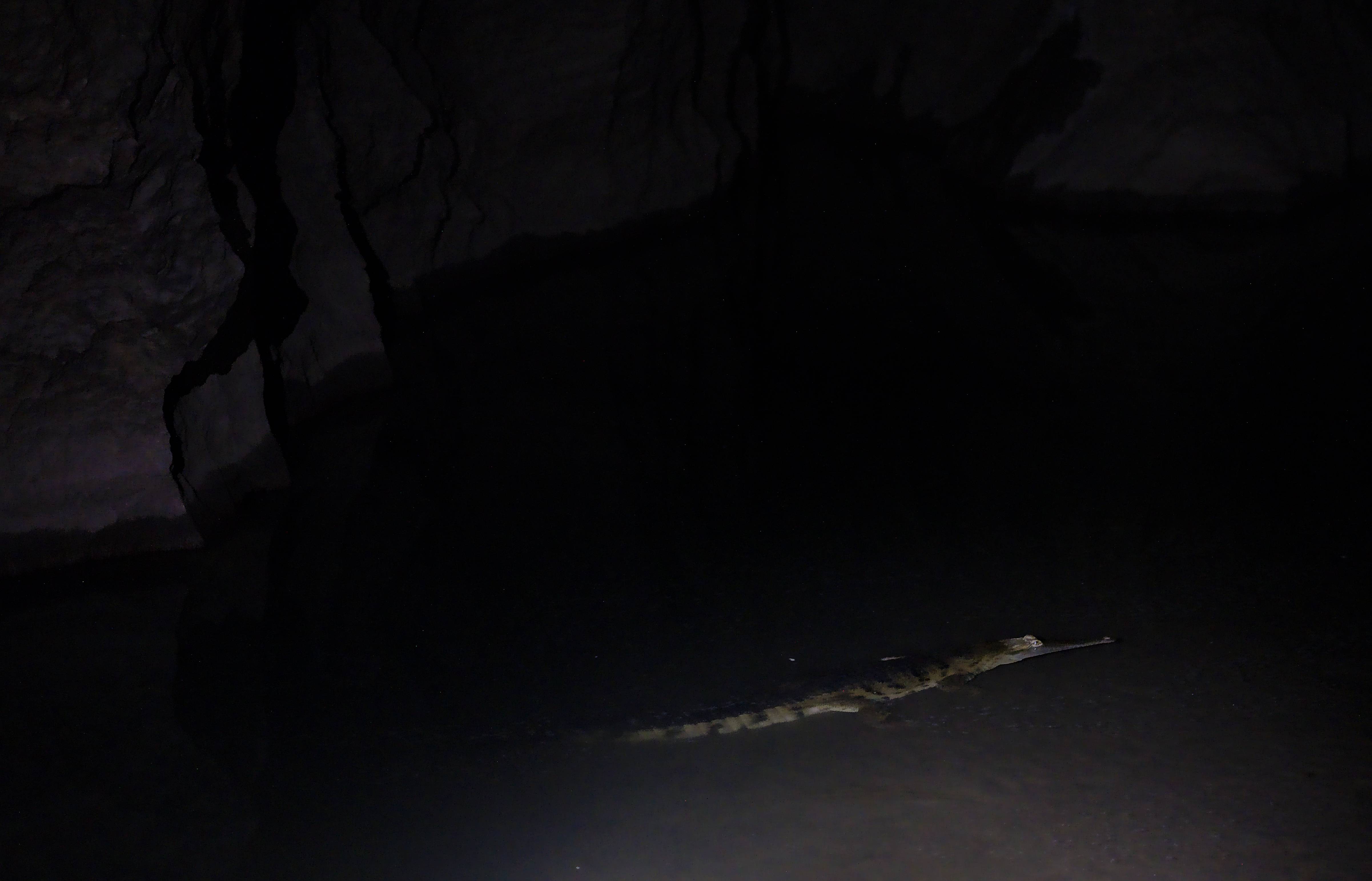 Süßwasserkrokodile ruhen sich im Dunkel der Höhle aus. Etwas komisch ist das schon, so nahe an ihnen vorbeizuwaten.