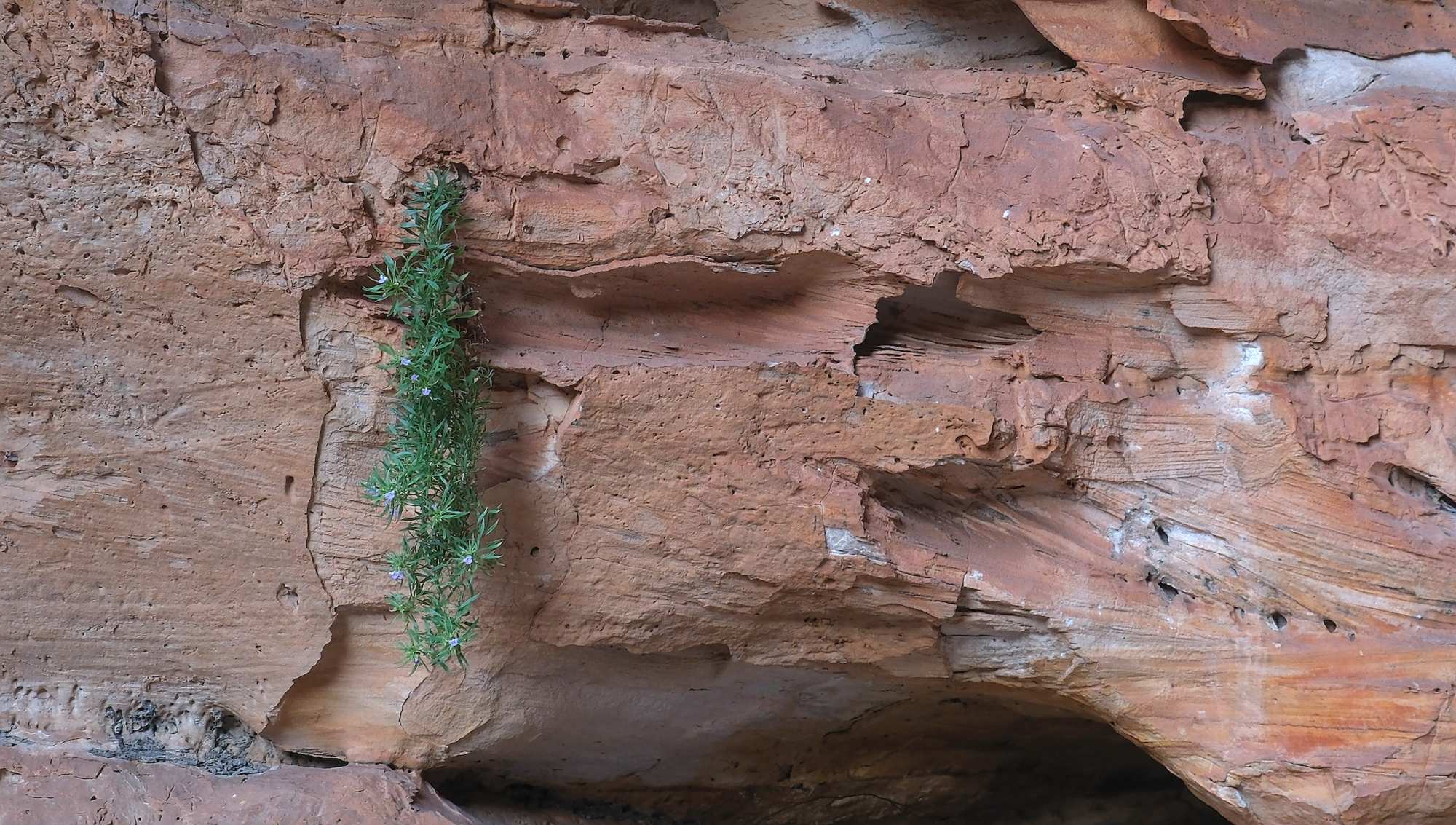 Wasser beginnt durch die Risse zu sickern und bricht den Sandstein auf.