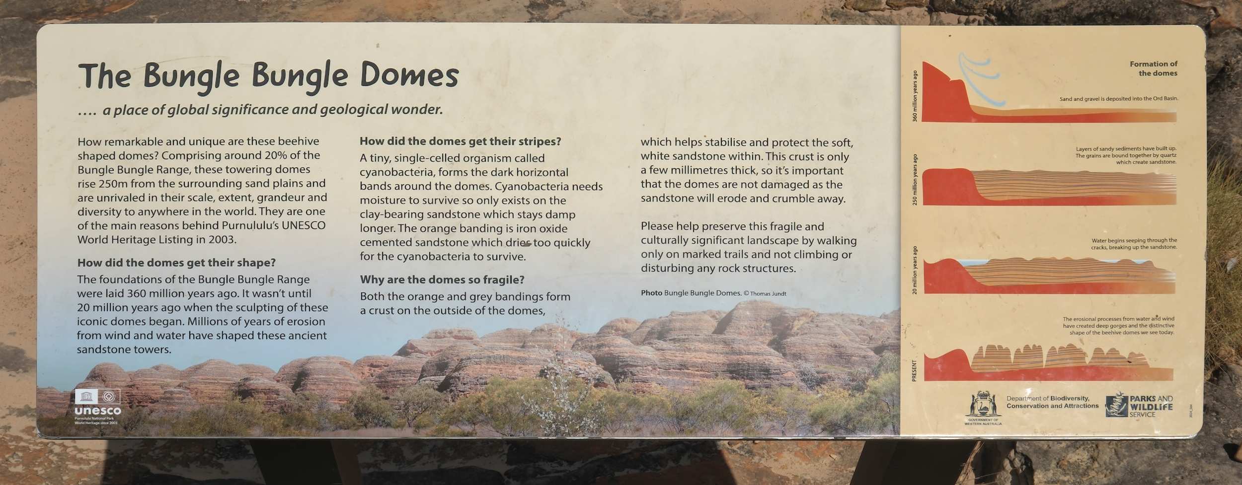 Sowohl die orangefarbenen als auch die grauen Bänder bilden eine Kruste an der Außenseite der Kuppeln, die den weichen, weißen Sandstein im Inneren stabilisiert und schützt. Diese Kruste ist nur wenige Millimeter dick. Daher ist es wichtig, die Kuppeln nicht zu beschädigen, da der Sandstein sonst erodiert und abbröckelt.