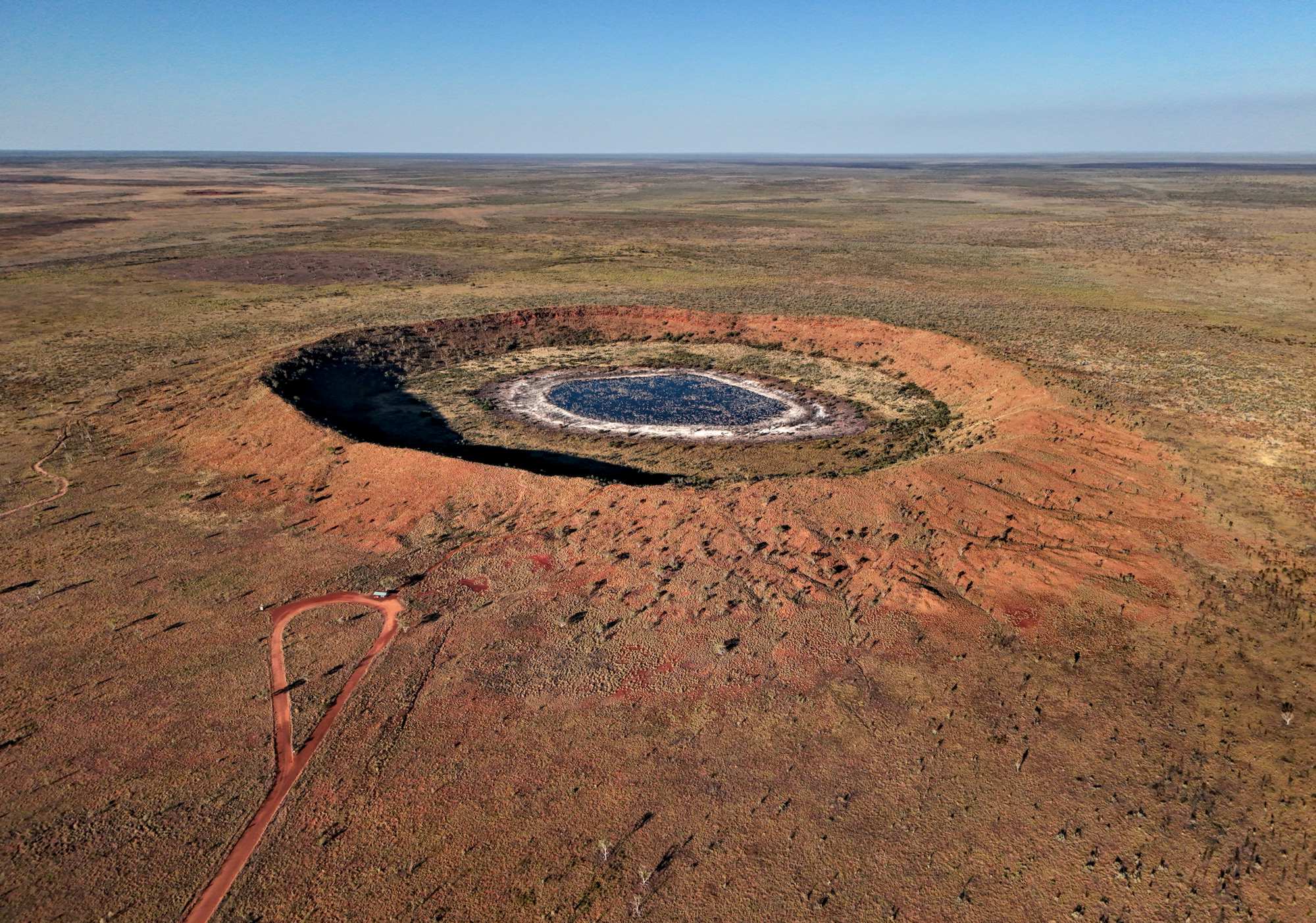 Auf der 'Great Northern Road' (Große nördliche Straße) ging es zurück nach 'Halls Creek', kurz einkaufen und nach dem Ort links ab auf der 'Tanami Road', größtenteils Gravel (Schotter), bis zum Abzweig zu unserem Krater. Der 'Wolf(e) Creek Meteorite Crater' ist ein sehr gut erhaltener Einschlagskrater von rund 880 m Durchmesser. Er ist der zweitgrößte der Welt, in dem noch Einschlagsmaterial gefunden wurde.