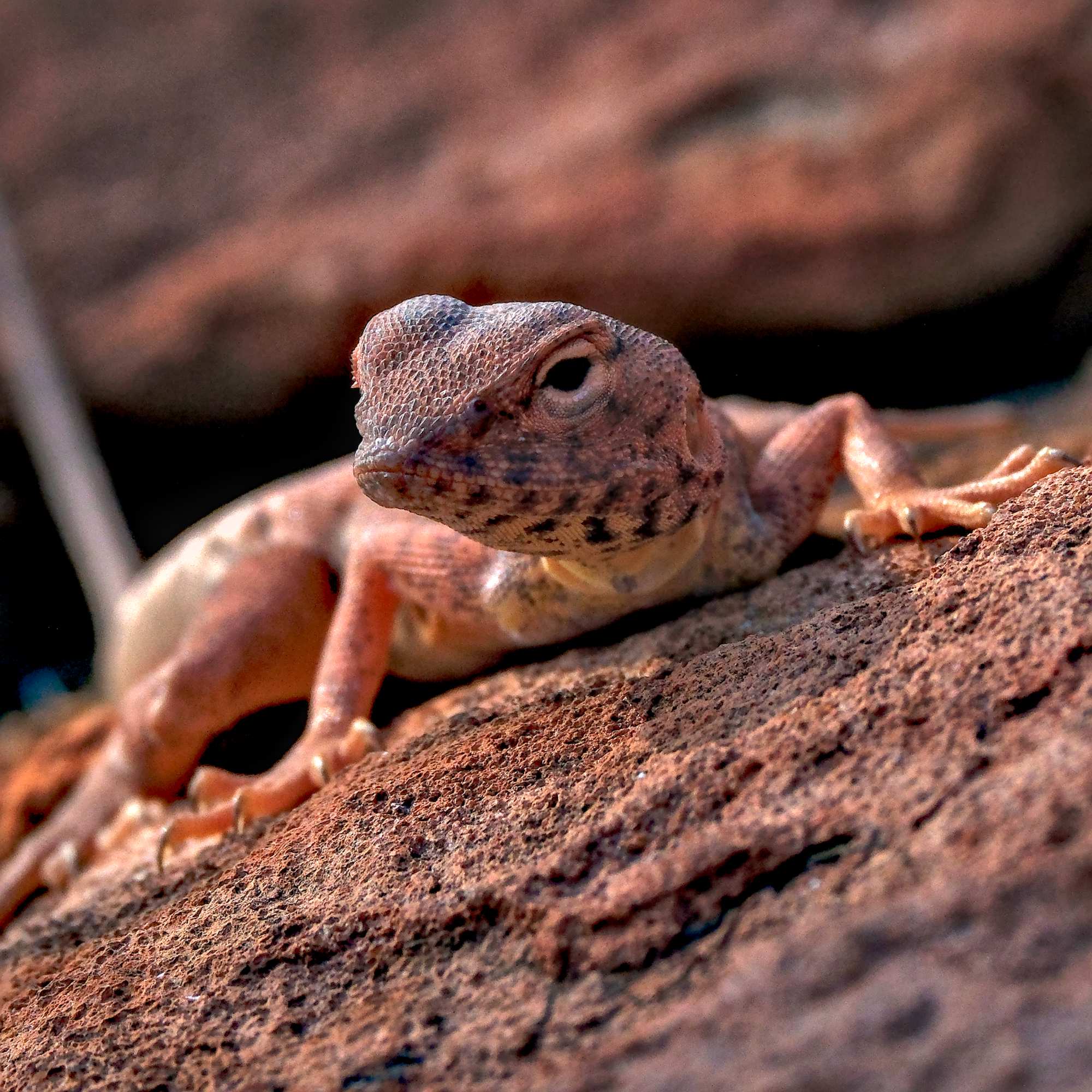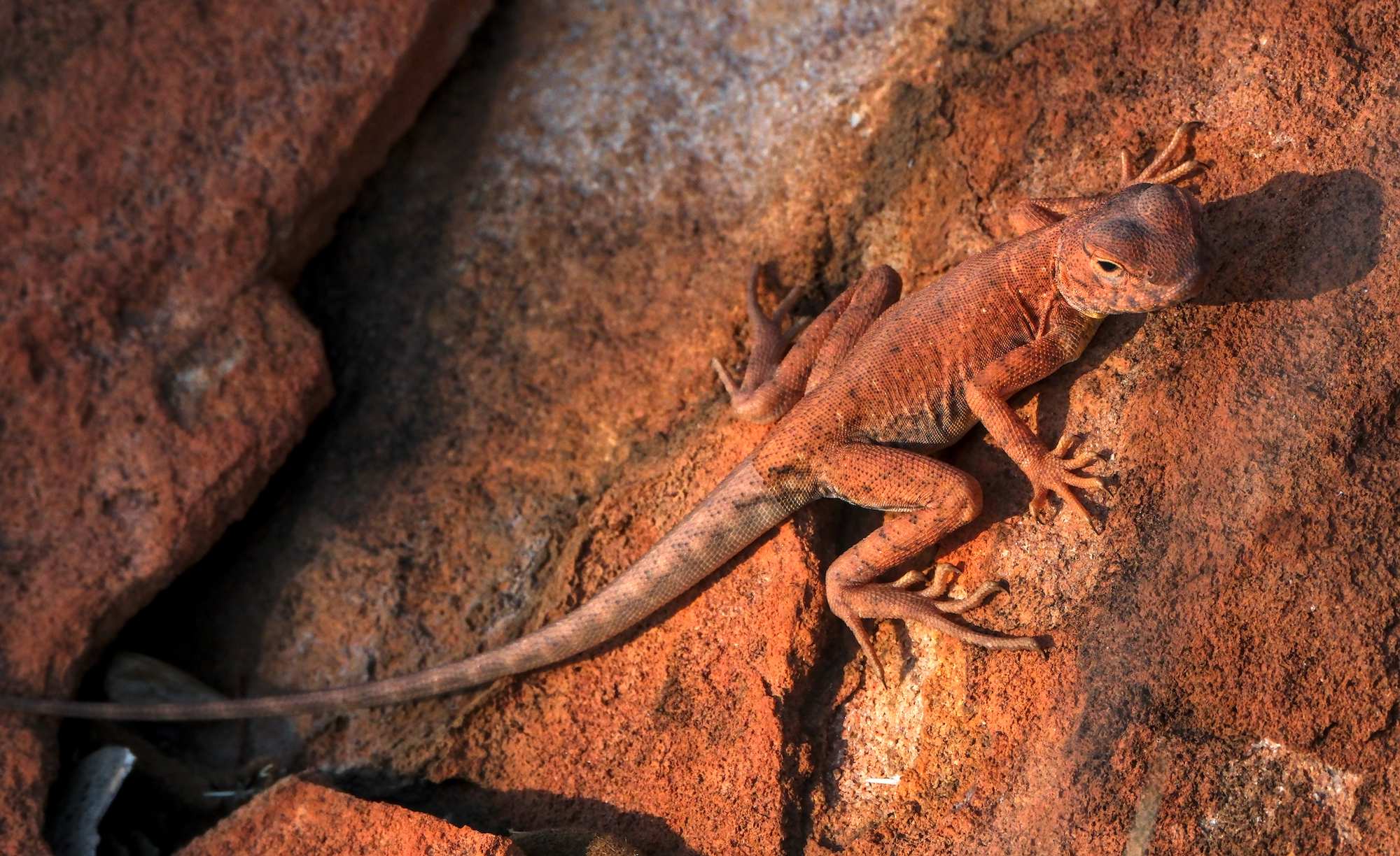 Am nächsten Morgen umrunden wir den Krater und treffen auf diesen farblich bestens angepassten 'Ring-tailed Dragon' (wörtlich übersetzt: Ringelschwanzdrachen).