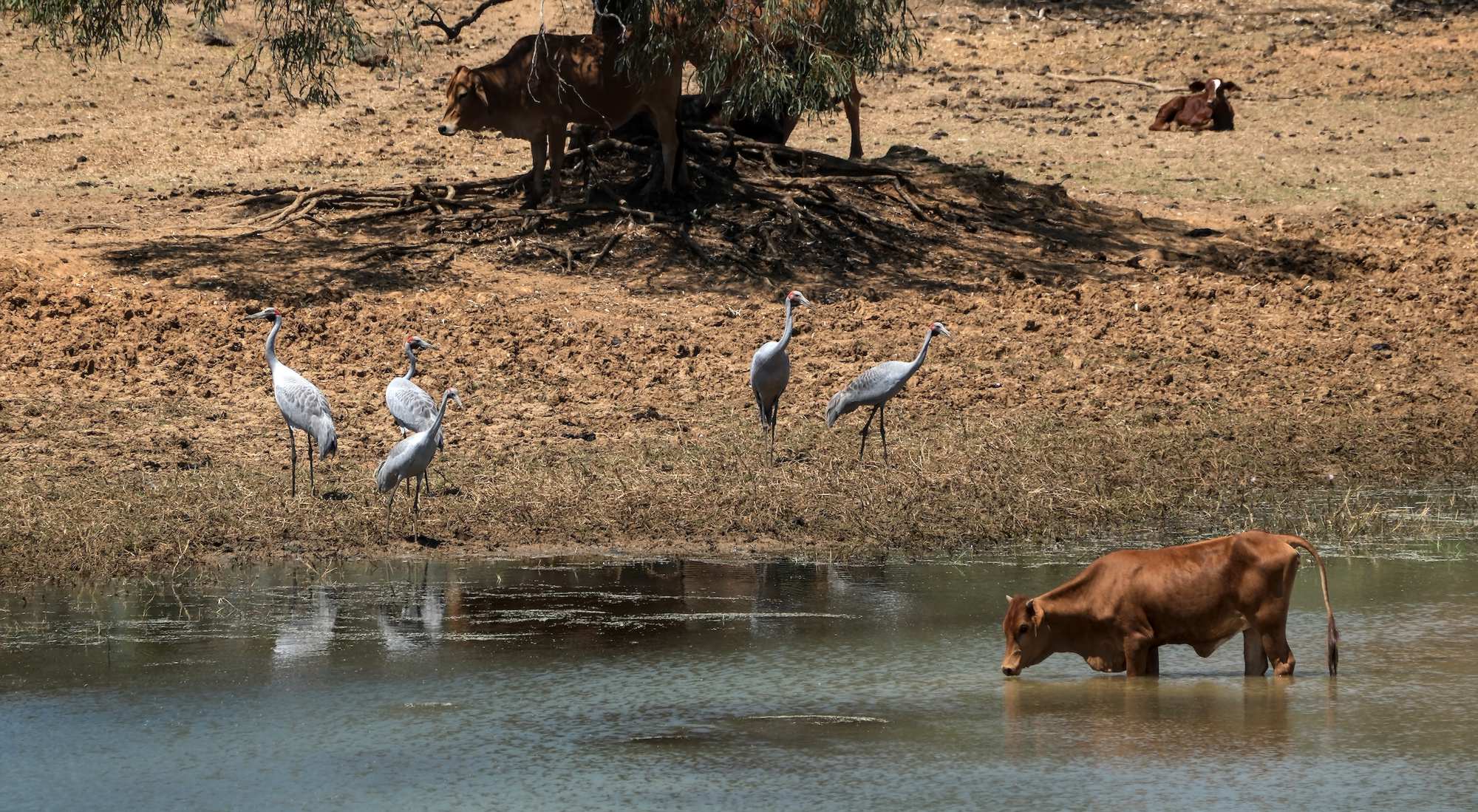 Unterwegs an einem Fluss bekommen wir diese Brolgas mit Kühen vor die Linsen.
