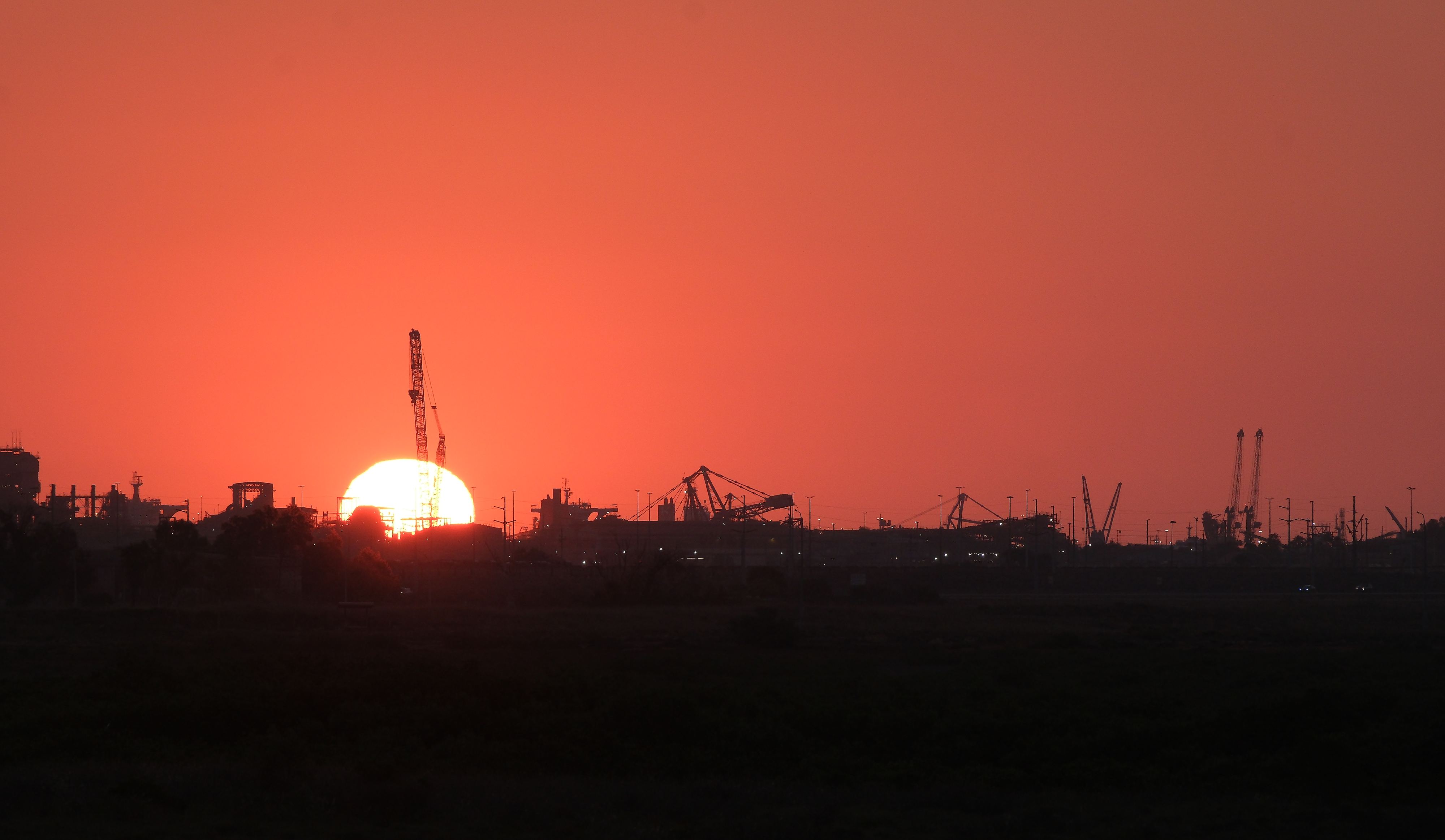 Sonnenuntergang über den Verladeeinrichtungen von Port Hedland, dem größten Hafen für Schüttgut in der Welt. Weit über 500 Mio. t Eisenerz aus der Pilbara-Region, im Wert von mehr als 50 Mrd. Euro,