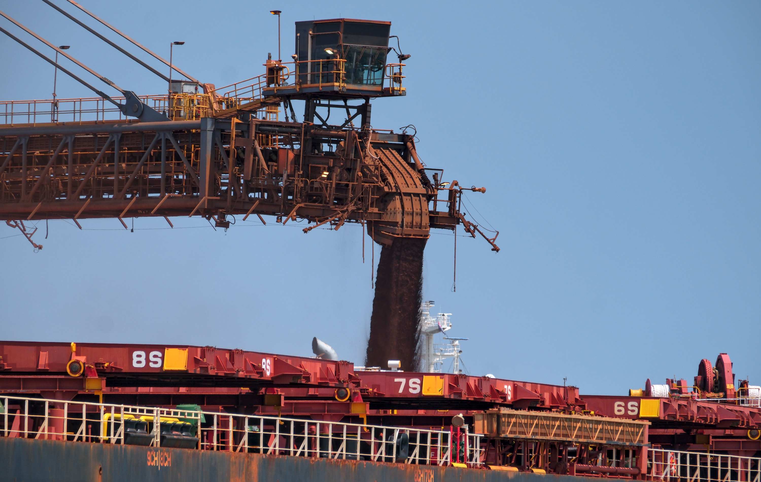 Im Vordergrund die 'FMG Grace', ein Bulkcarrier (Massengutfrachter) mit 327 m Länge, 57 m Breite und rund 260.000 t Zuladung. 9 Züge mit jeweils zwei Kilometer Länge müssen anrollen, um ihn zu füllen.