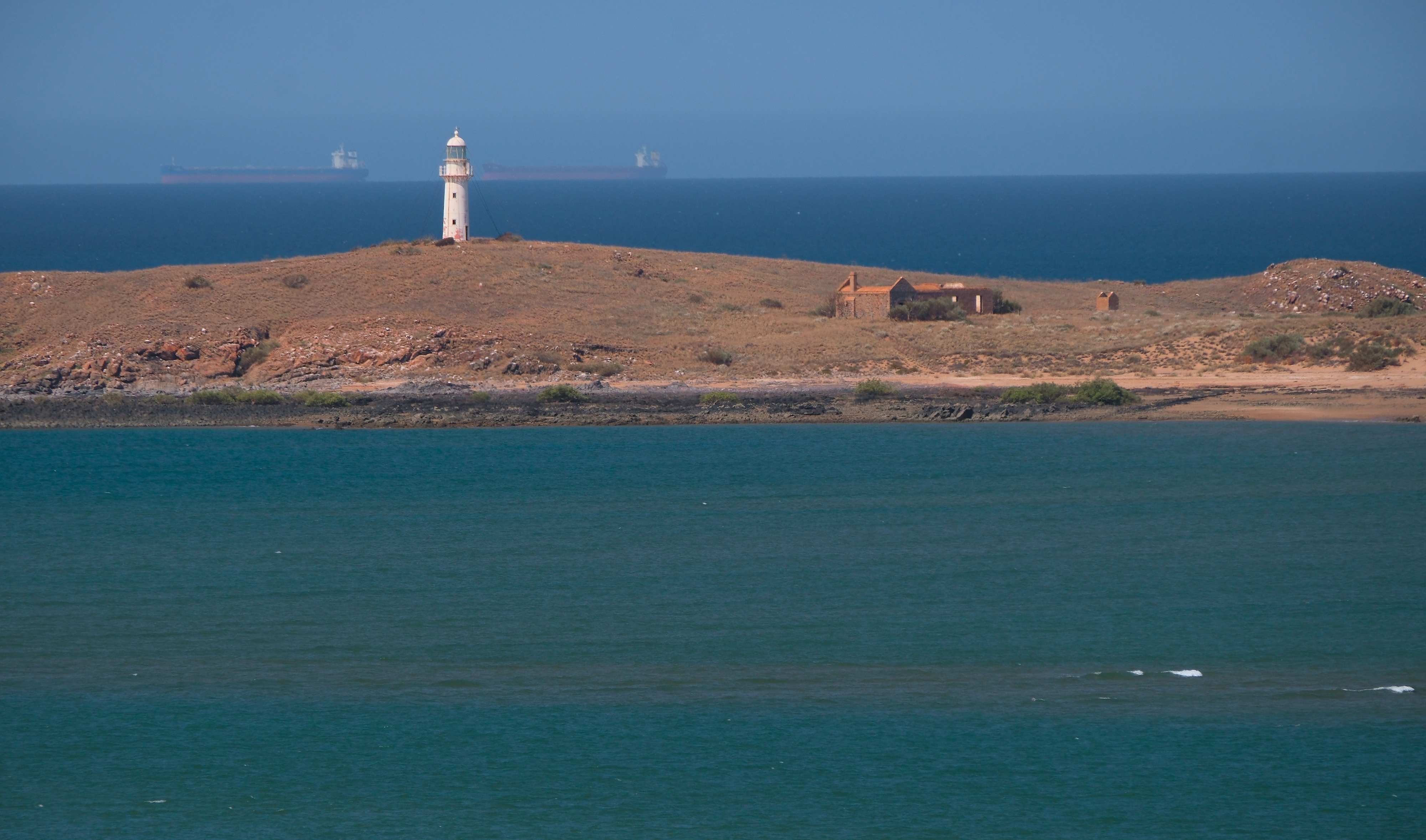 Der Leuchtturm auf 'Jarman Island'. Draußen warten die Frachter auf Ladung.