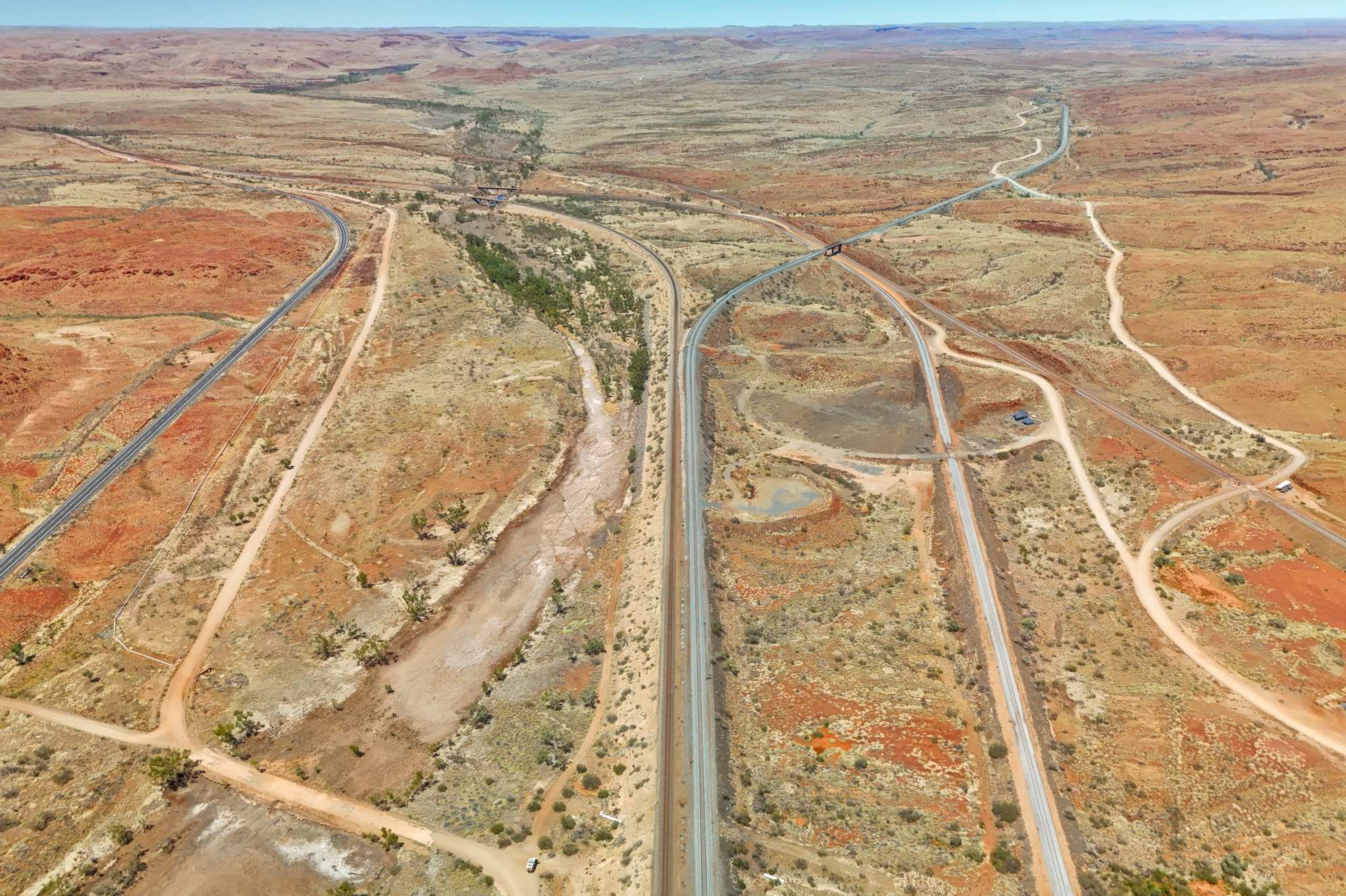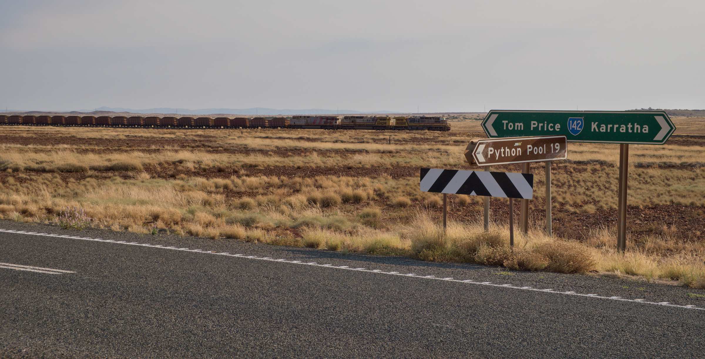 Hier treffen sich Zuggleise verschiedener Unternehmen, die aus ihren Minen um 'Tom Price' herum (Pilbara-Region) Eisenerz in die Häfen an der Nordwestküste transportieren.