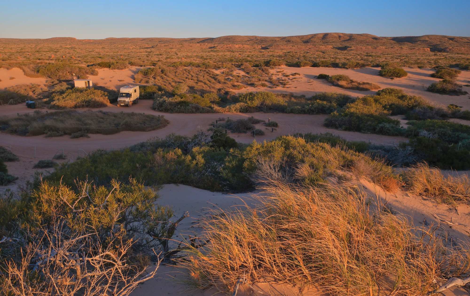 Während die zahlreichen Campgrounds des Nationalparks entlang der geteerten Straße meist lange im Voraus komplett ausgebucht sind, übernachten wir einsam auf dem 'One K Campground'. Man muss dorthin den 'Yardie Creek' "queren" und ein Stück etwas sandige Piste fahren.