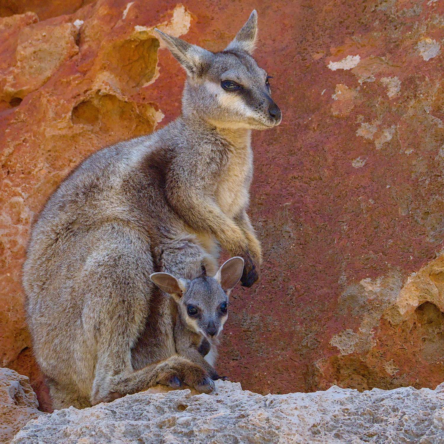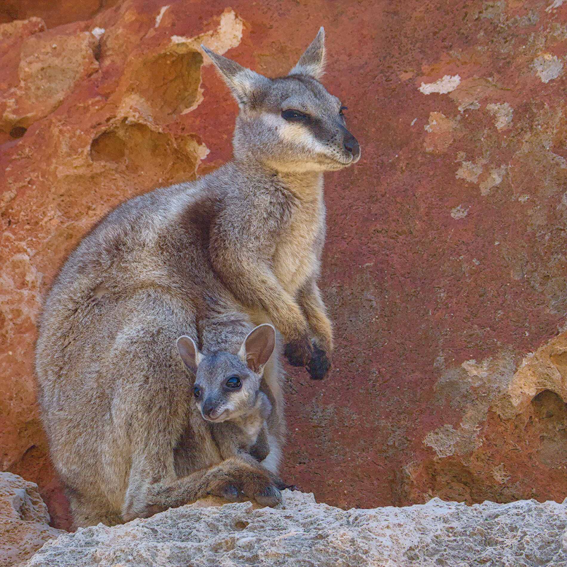 Auf einem kleinen Boot unternehmen wir eine schöne Tour auf dem besagten Creek und treffen u. a. auf diese Schwarzfuß-Felsenkängurus.