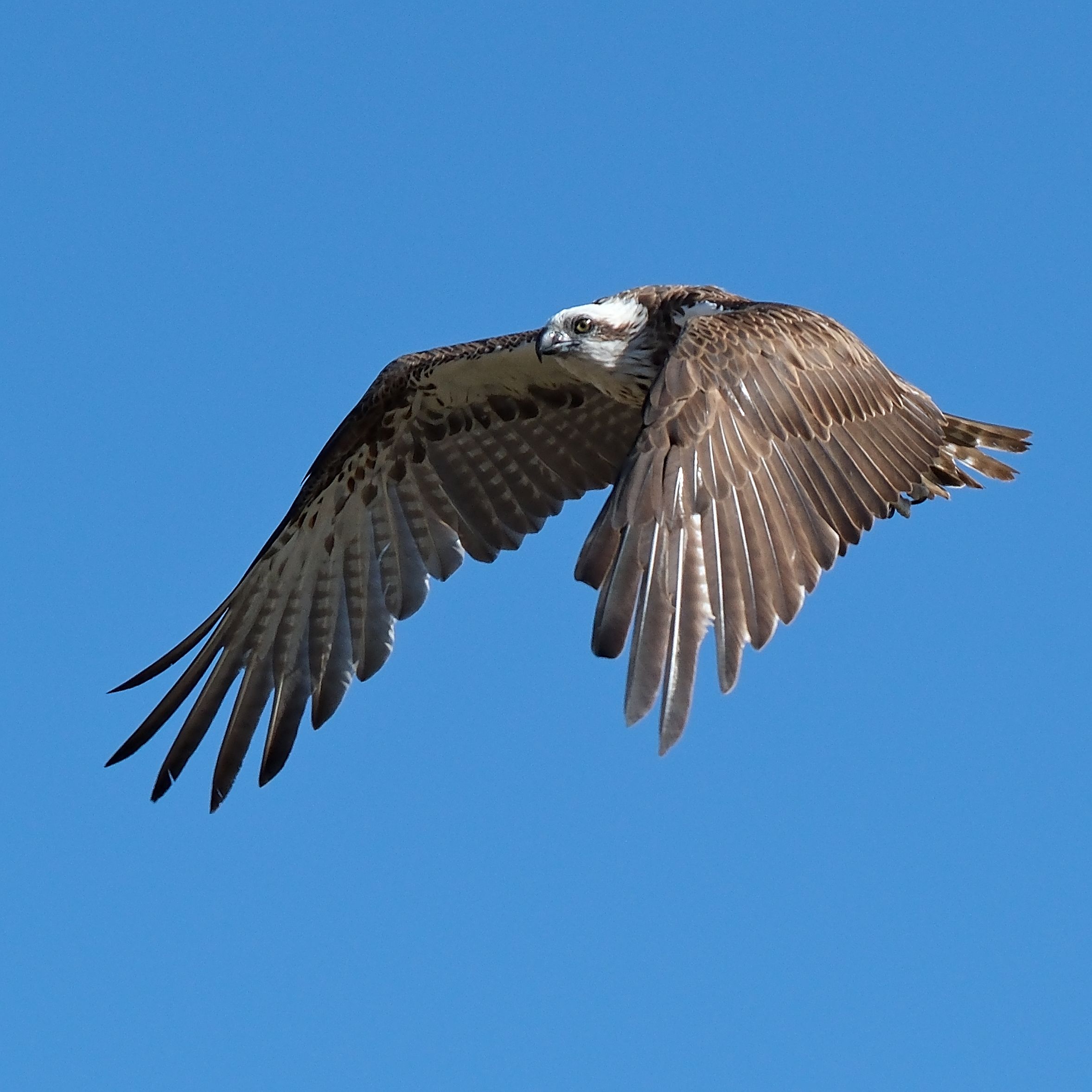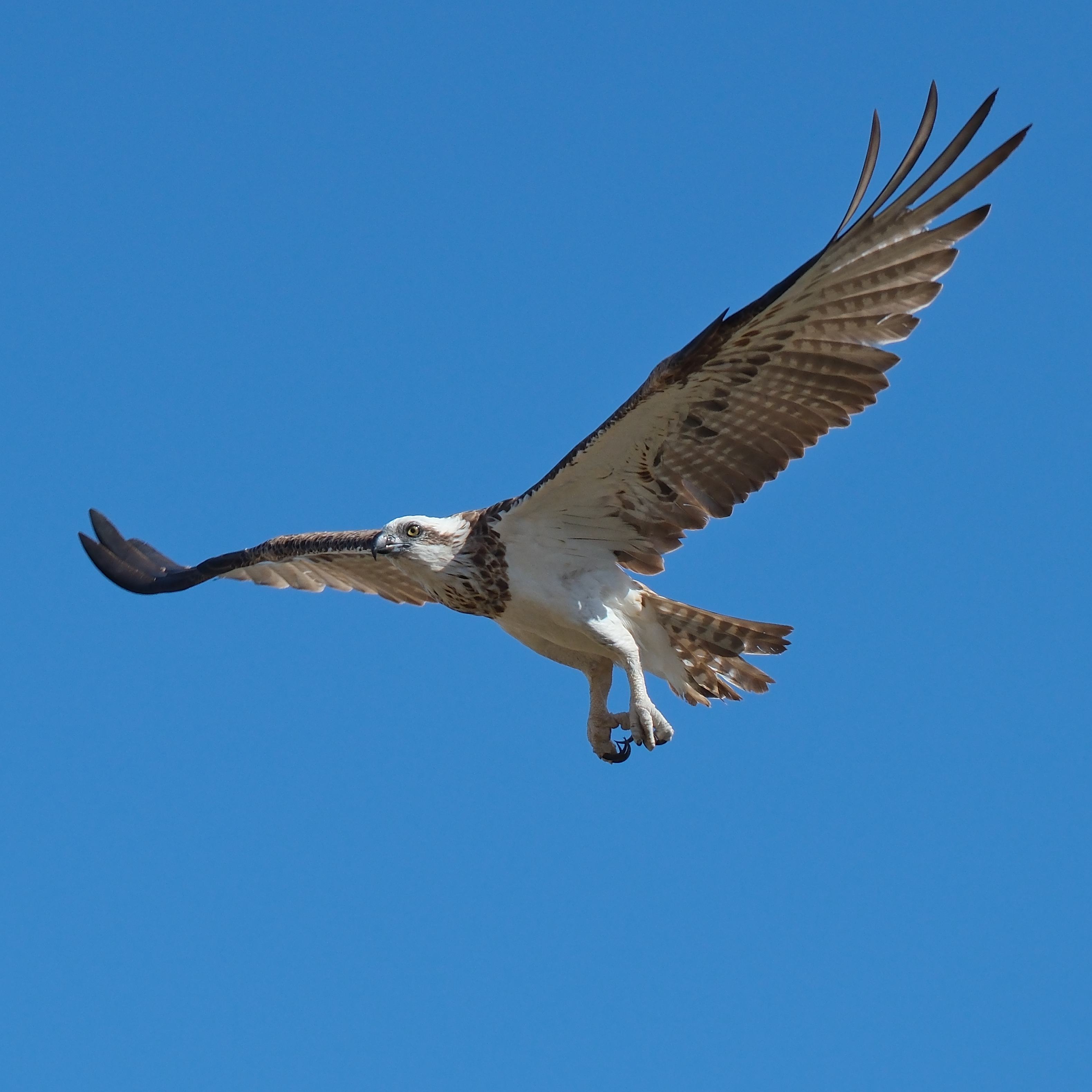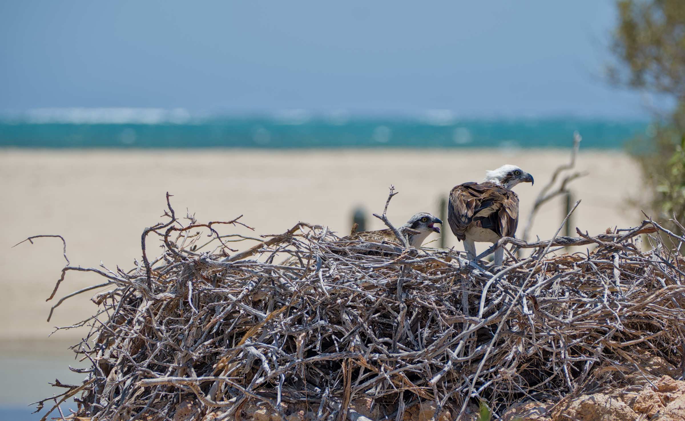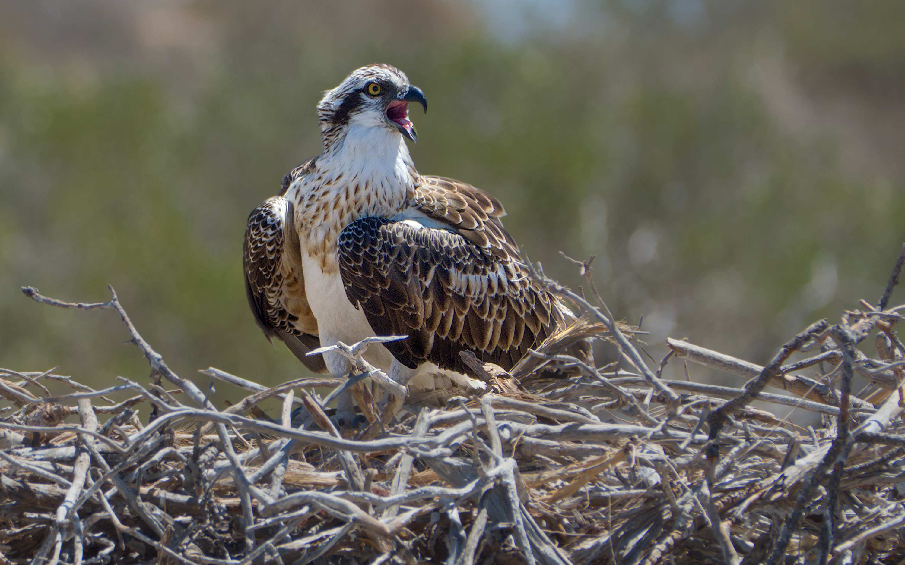 Der junge Fischadler will gefüttert werden. Die Mama kommt und tut ihm den Gefallen, während Papa sich in die Lüfte schwingt.