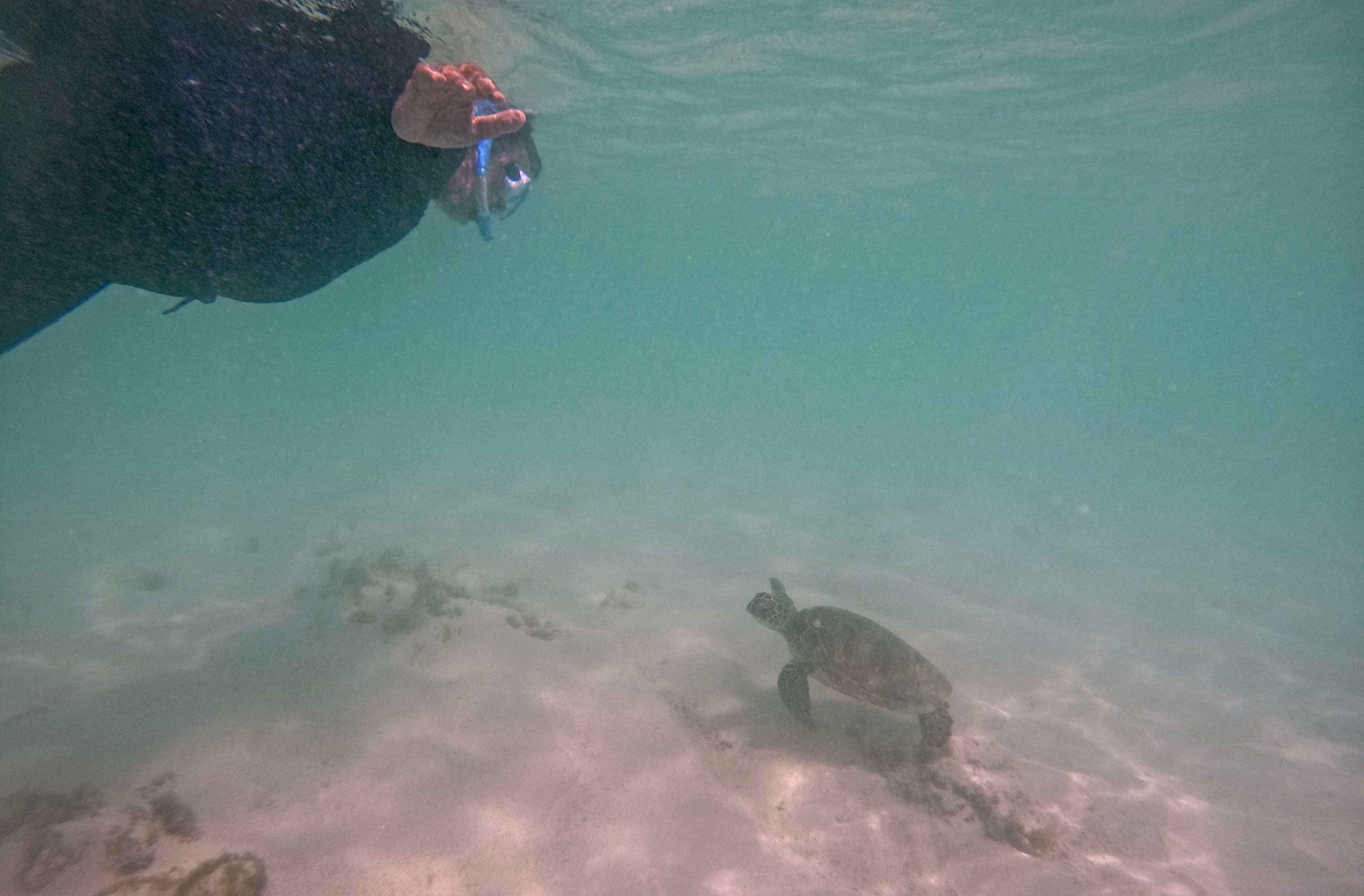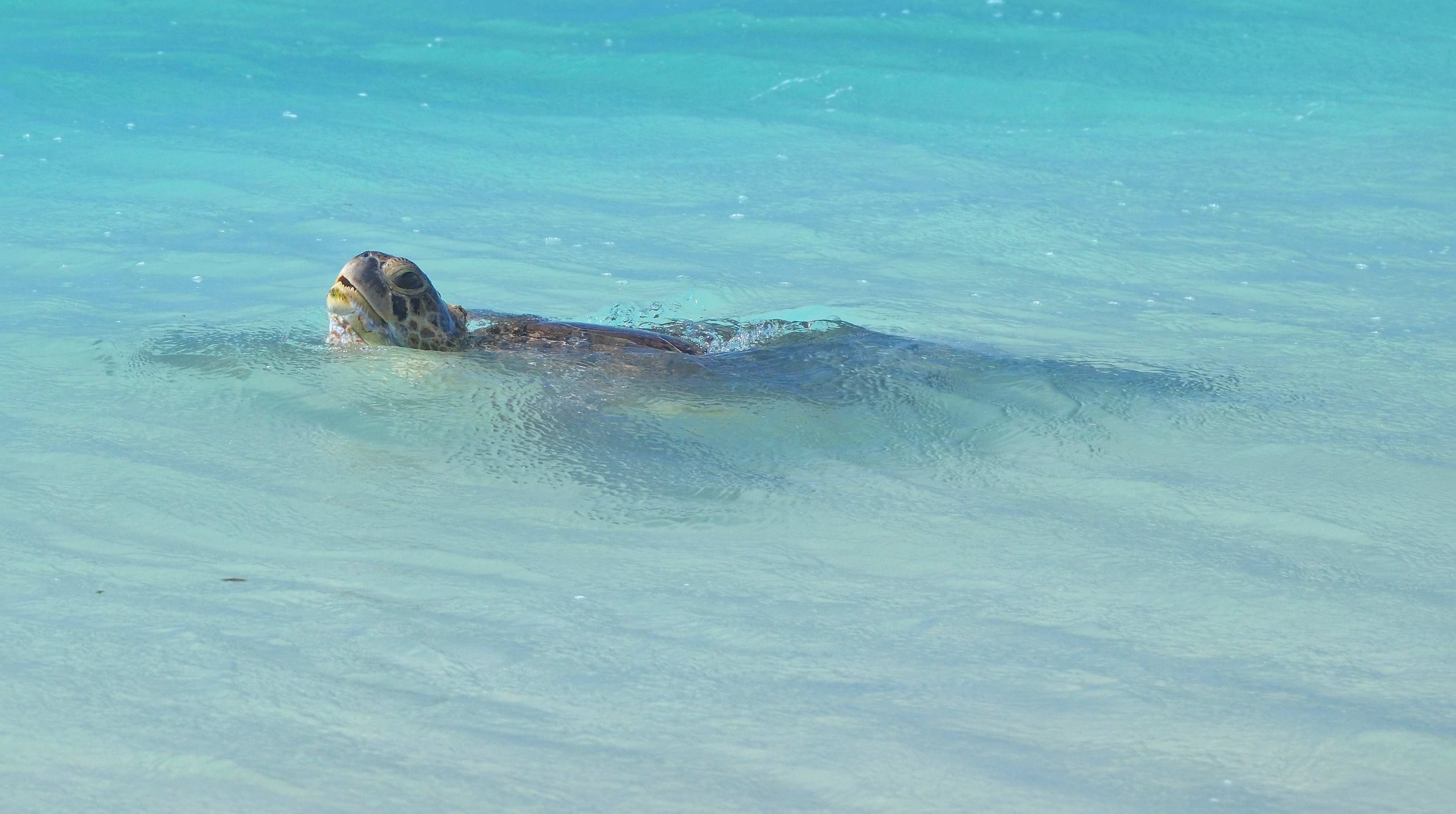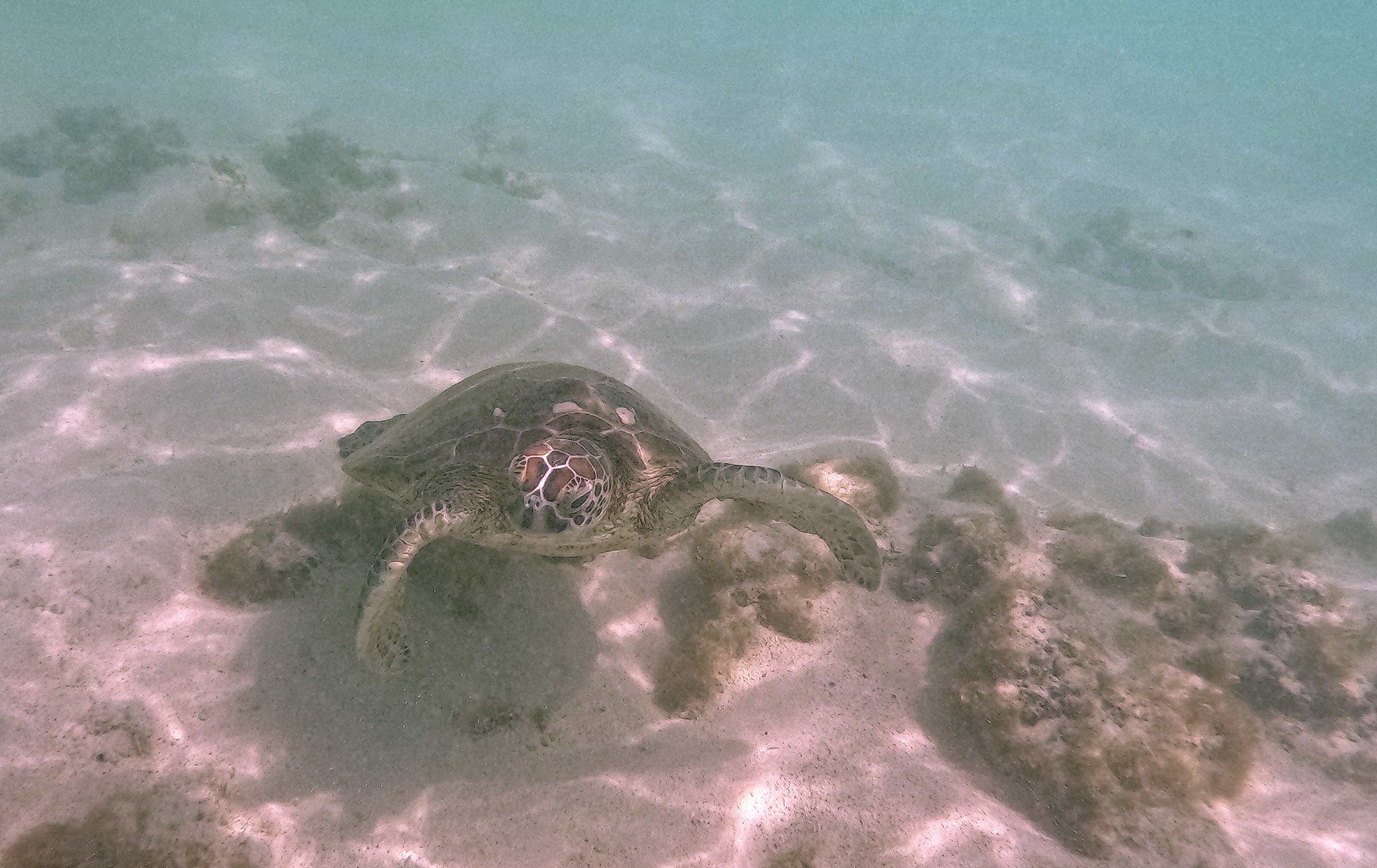 Später um die Ecke in der viel ruhigeren 'Turqoise Bay' treffen wir auf eine kleine (Grüne?) Schildkröte und sind begeistert.