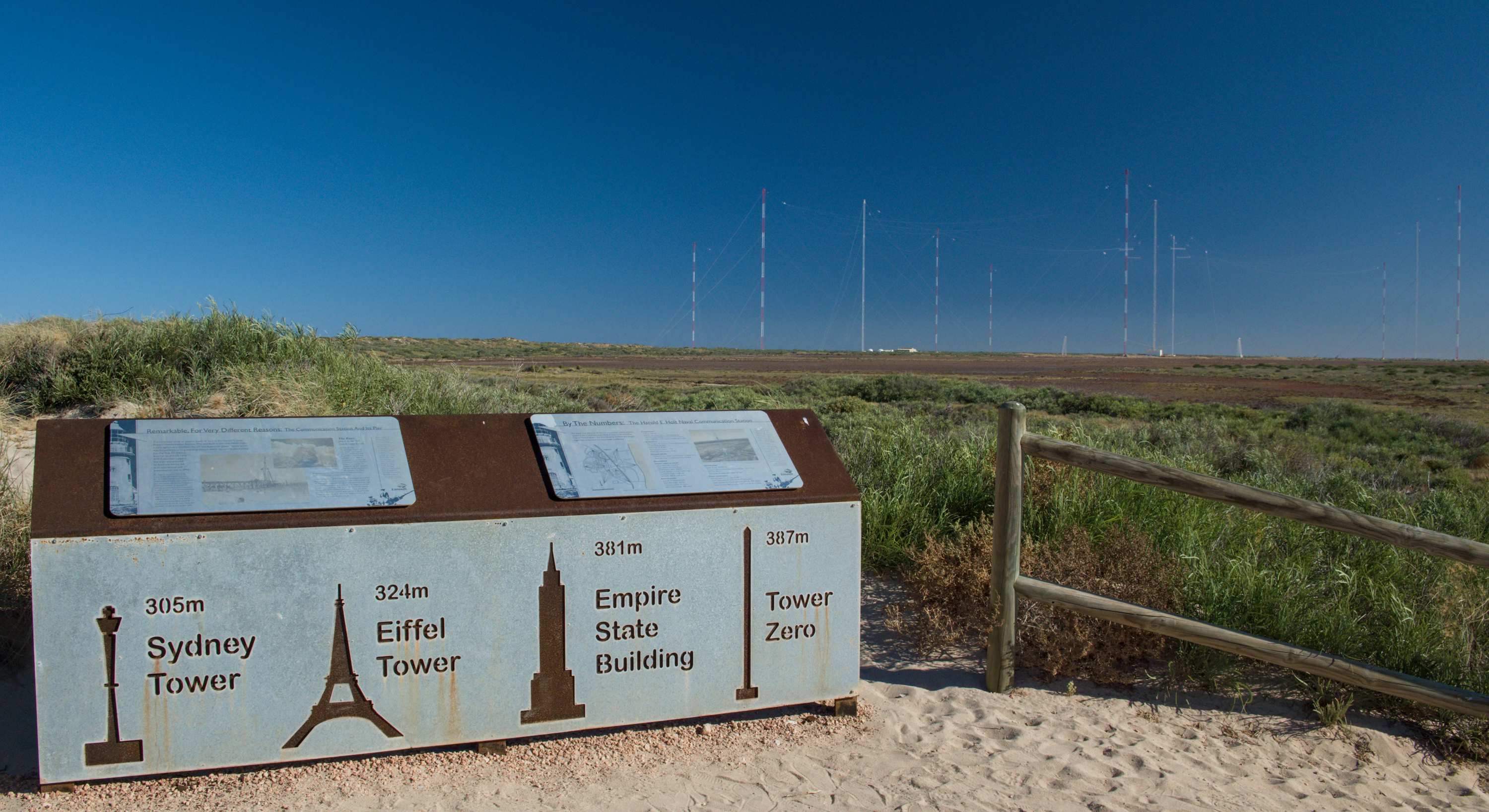 Die bis zu 387 m hohen Masten der 'Naval Communication Station Harold E. Holt', errichtet 1967. Heutzutage überwacht das Militär in der Nähe Satelliten mit rund 30 Radioteleskopen und einem großen optischen Teleskop.