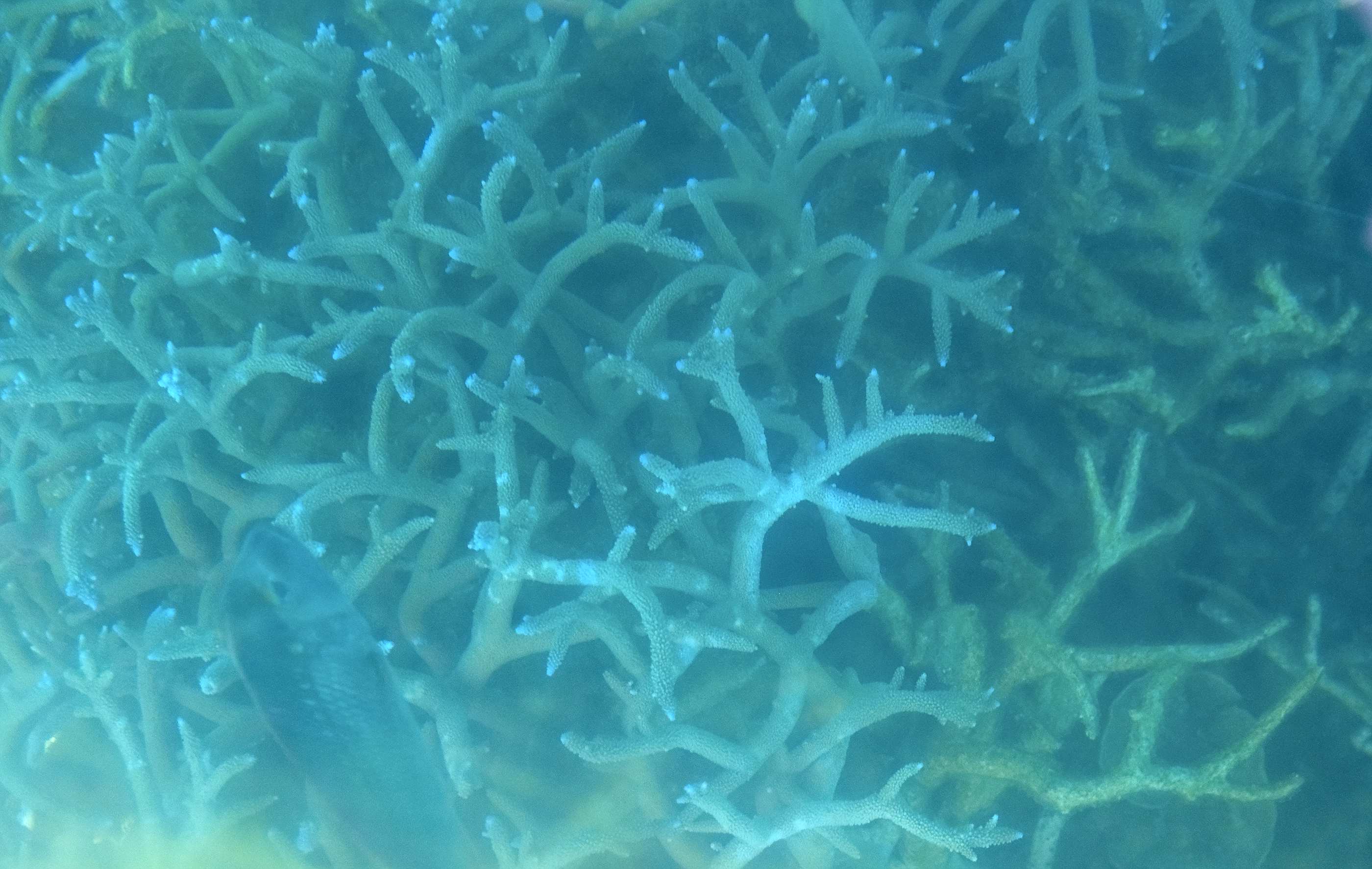 Ulrike geht noch einmal zwischen den kranken, gebleichten Korallen Schnorcheln. Viele Fische sind eingewandert, die Algen fressen und somit helfen, dass sich die Kolonie erholt.