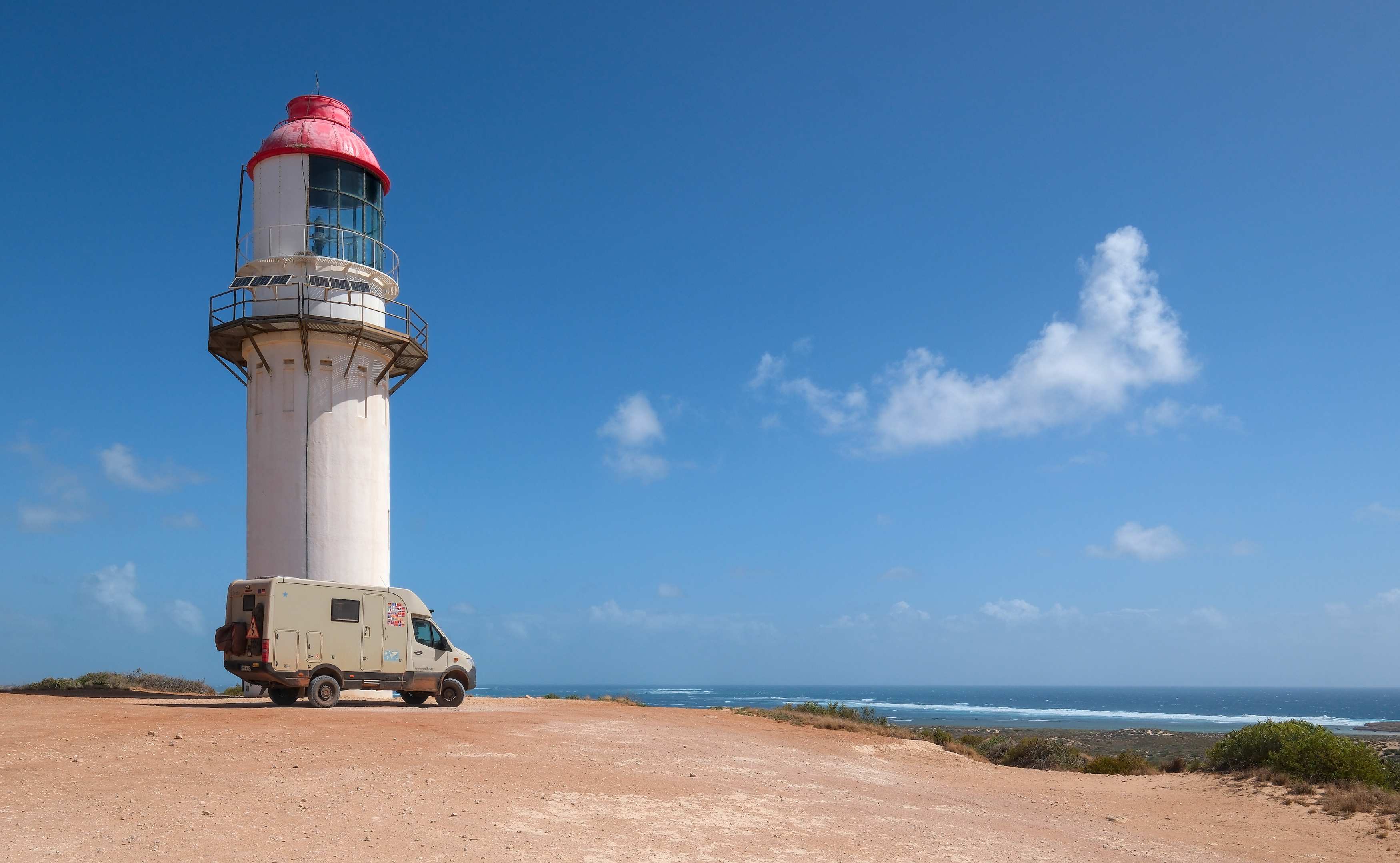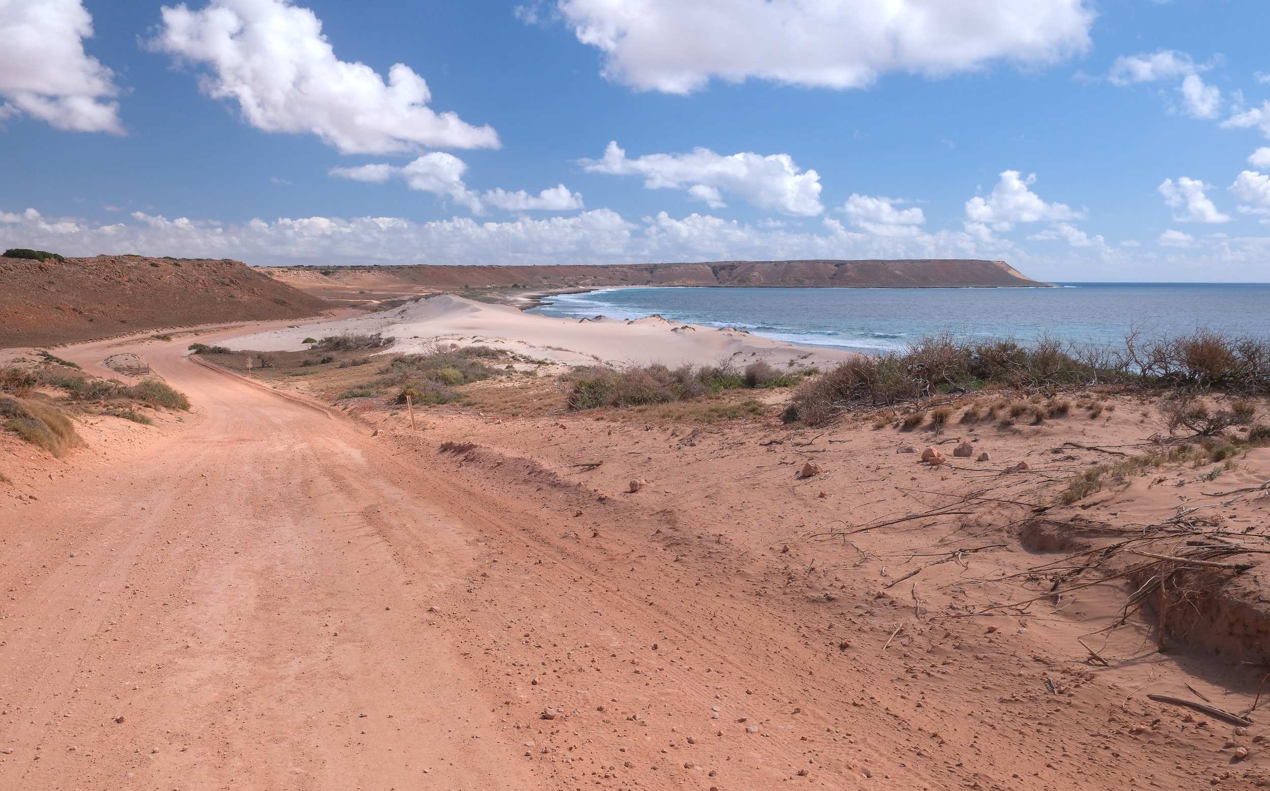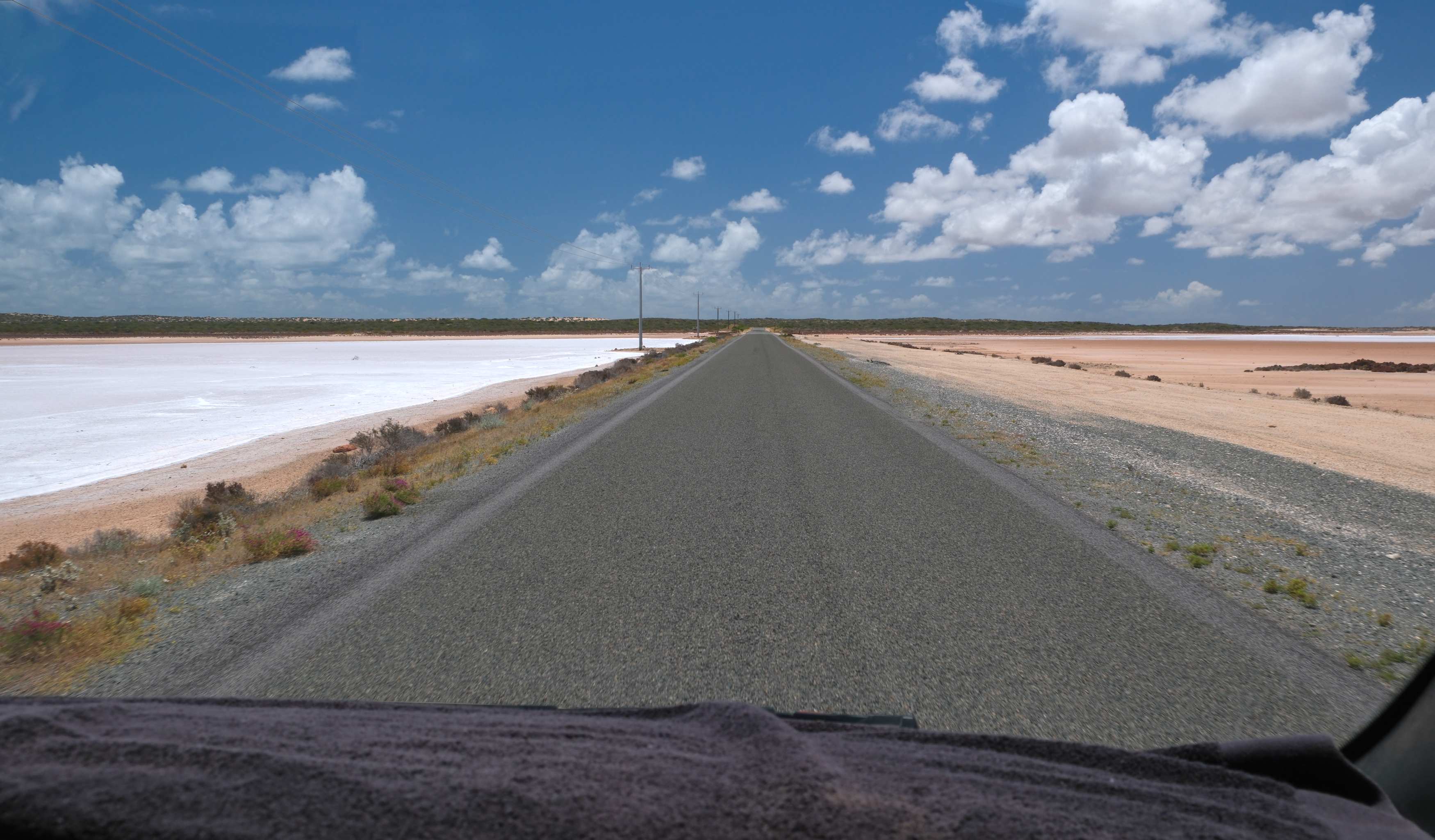 Von 'Coral Bay' ging es in einem längeren Rutsch bis fast nach Carnarvon, wo wir jedoch kurz vorher abbogen, um zwischen das Meer und den 'Lake Macleod' zu kommen. Bis an die Küste geteert, danach recht gute Schotterstraße. Wir sind nach Norden bis hinauf zur 'Red Bluff Campside' gefahren und haben dort übernachtet. Sehr viel Wind, rauhe See und Salz auf den Scheiben.